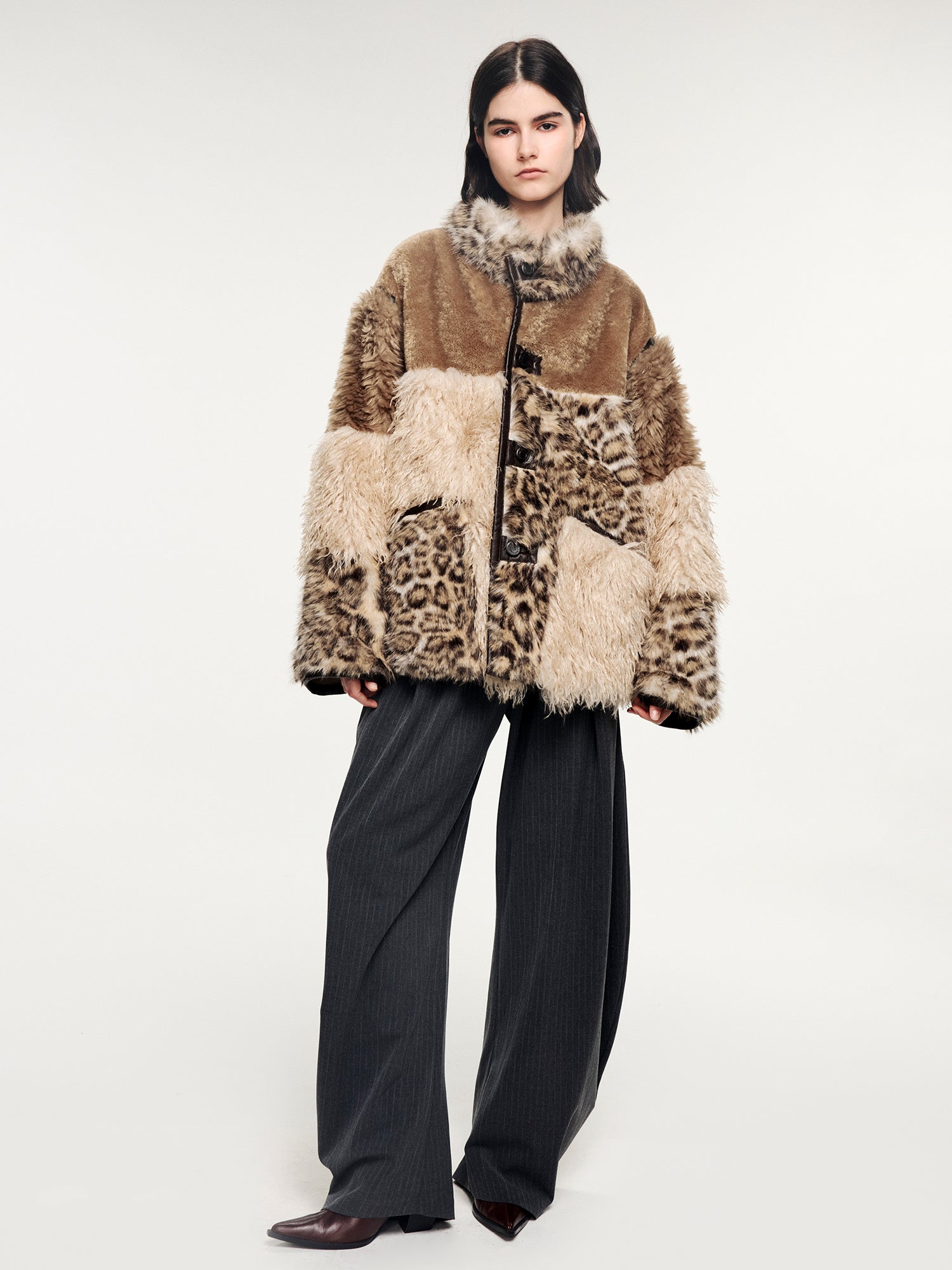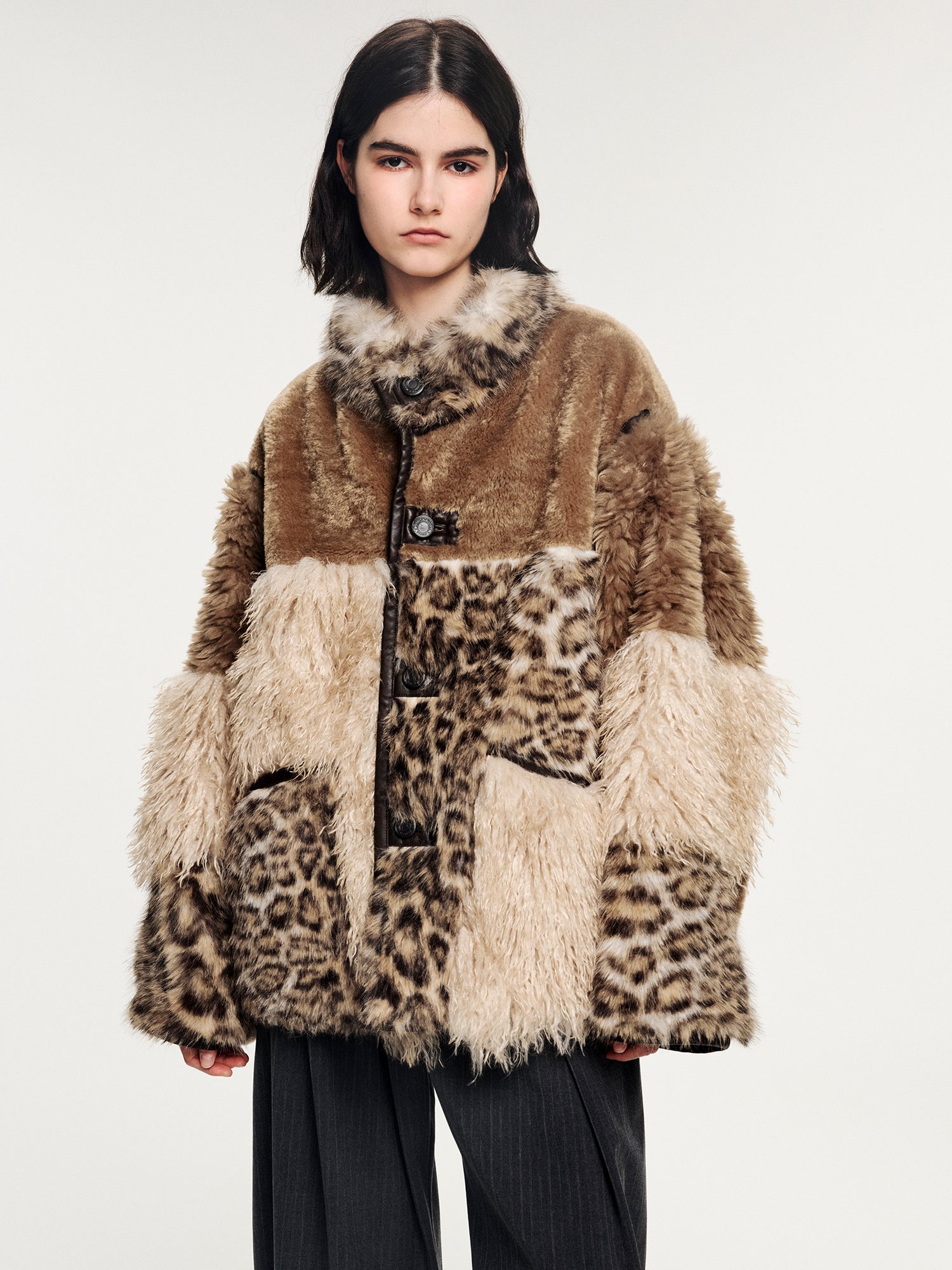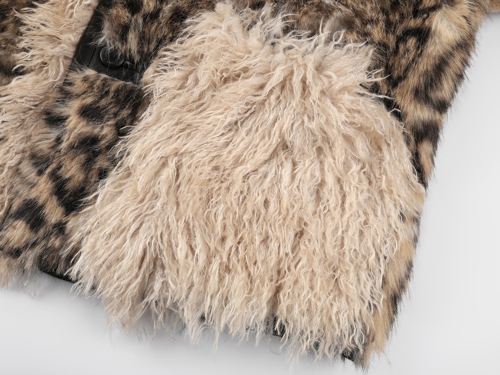 Side A:Fabric 1 (leopard): 100% polyesterFabric 2 (beige long pile): 100% polyesterFabric 3 (brown short pile): 100% polyesterFabric 4 (dark brown long pile): 100% polyesterSide B: 56.7% polyester/polyamide blend, 42.3% polyester, 1% spandex (net dry content)Trims: Sheepskin leather