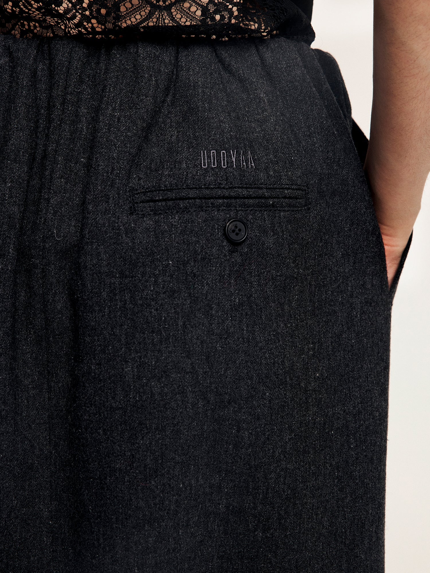 Made from fine dark grey wool for a refined, urban look. Includes built-in shorts for ease and comfort.Fabric: