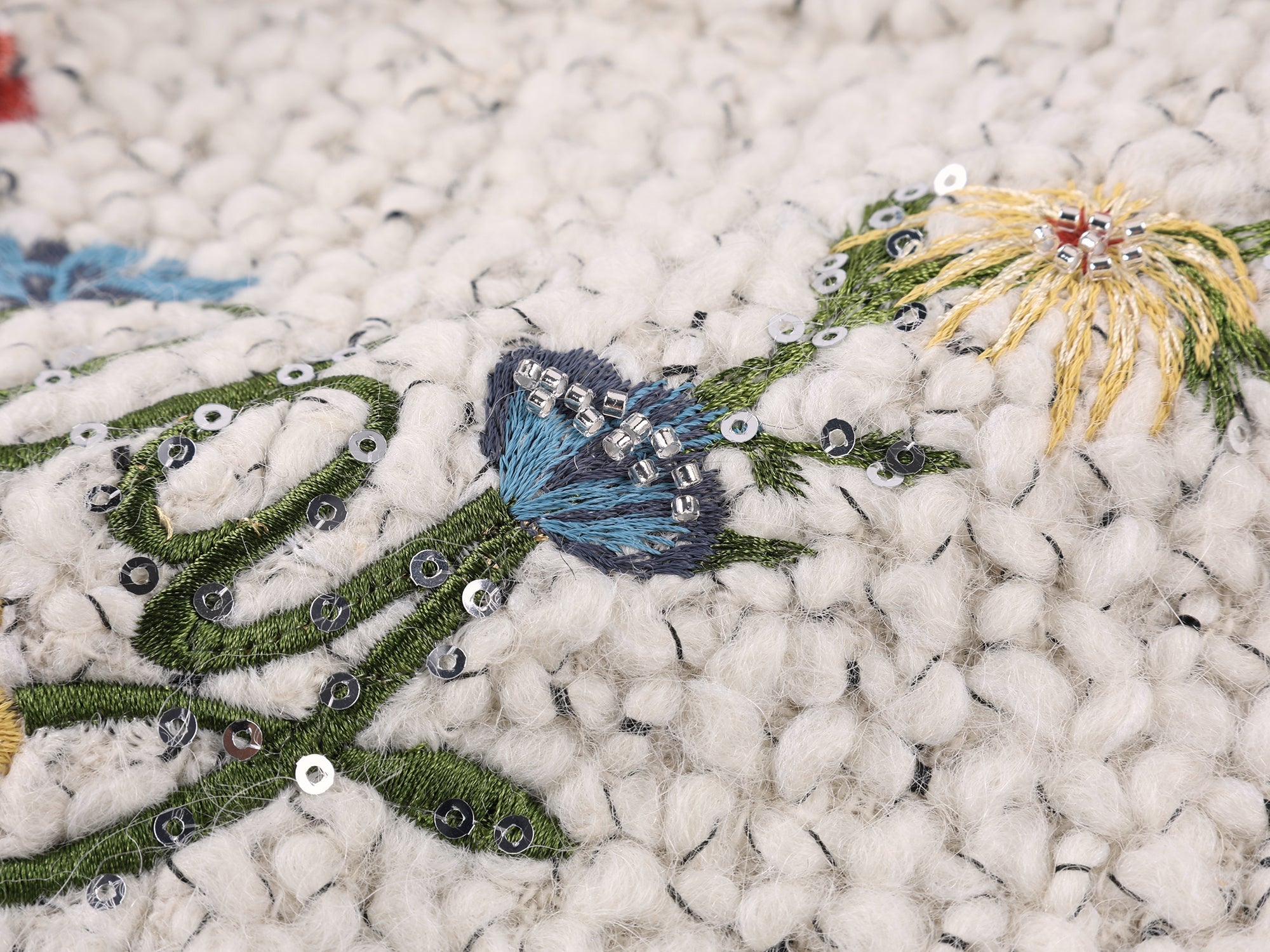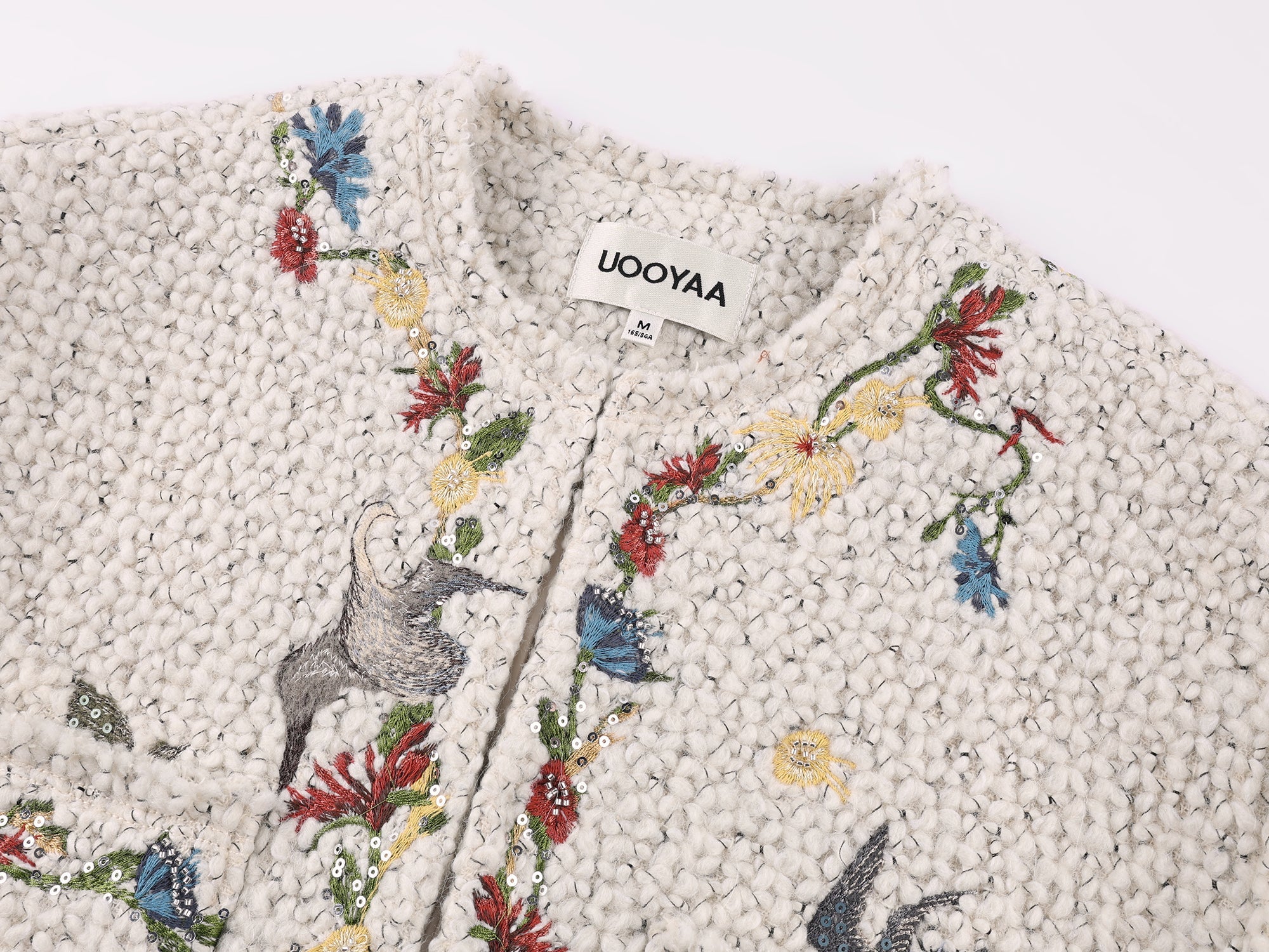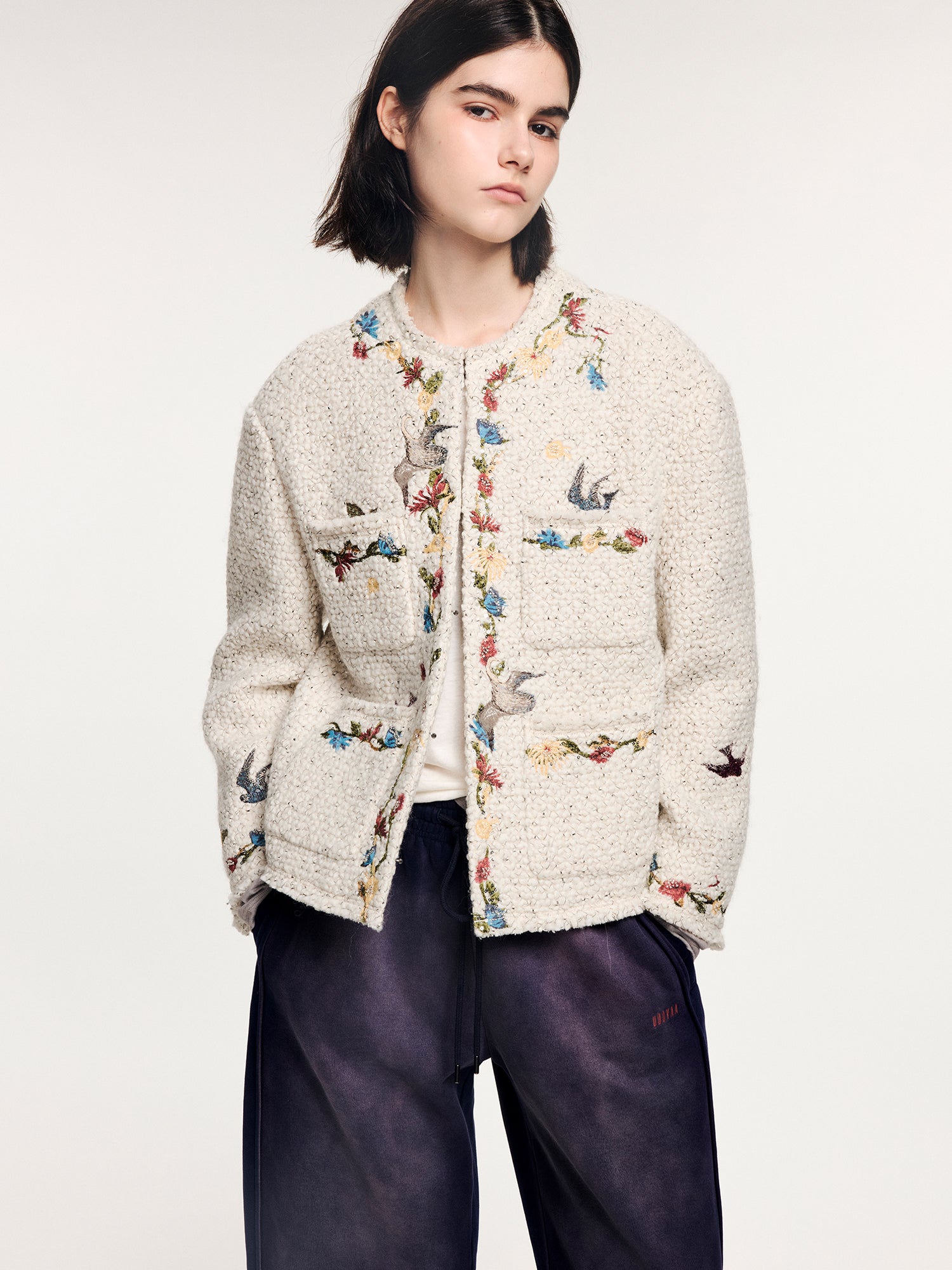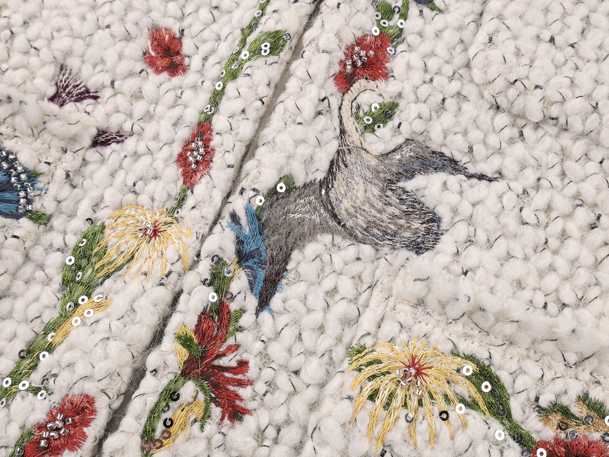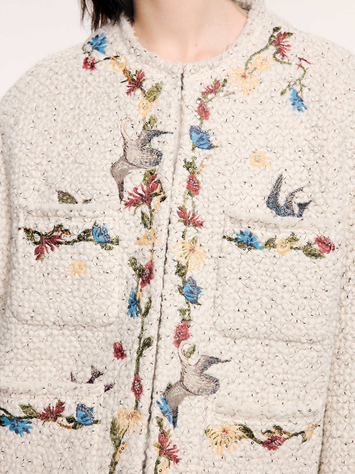 Birds from a surreal garden come to life through embroidery and micro bead embellishments, bringing a fantasy-luxe feel to this tweed-style jacket.
