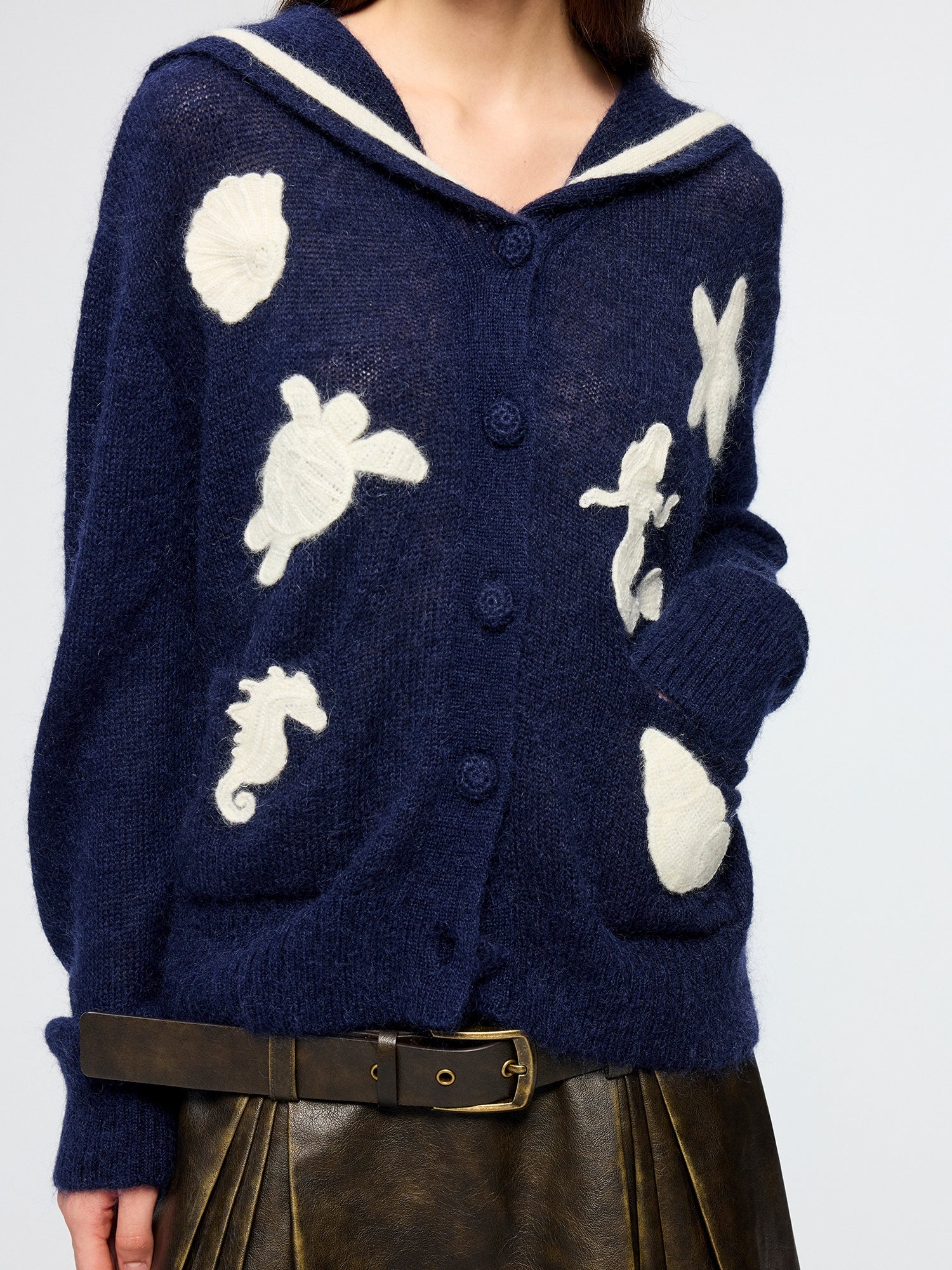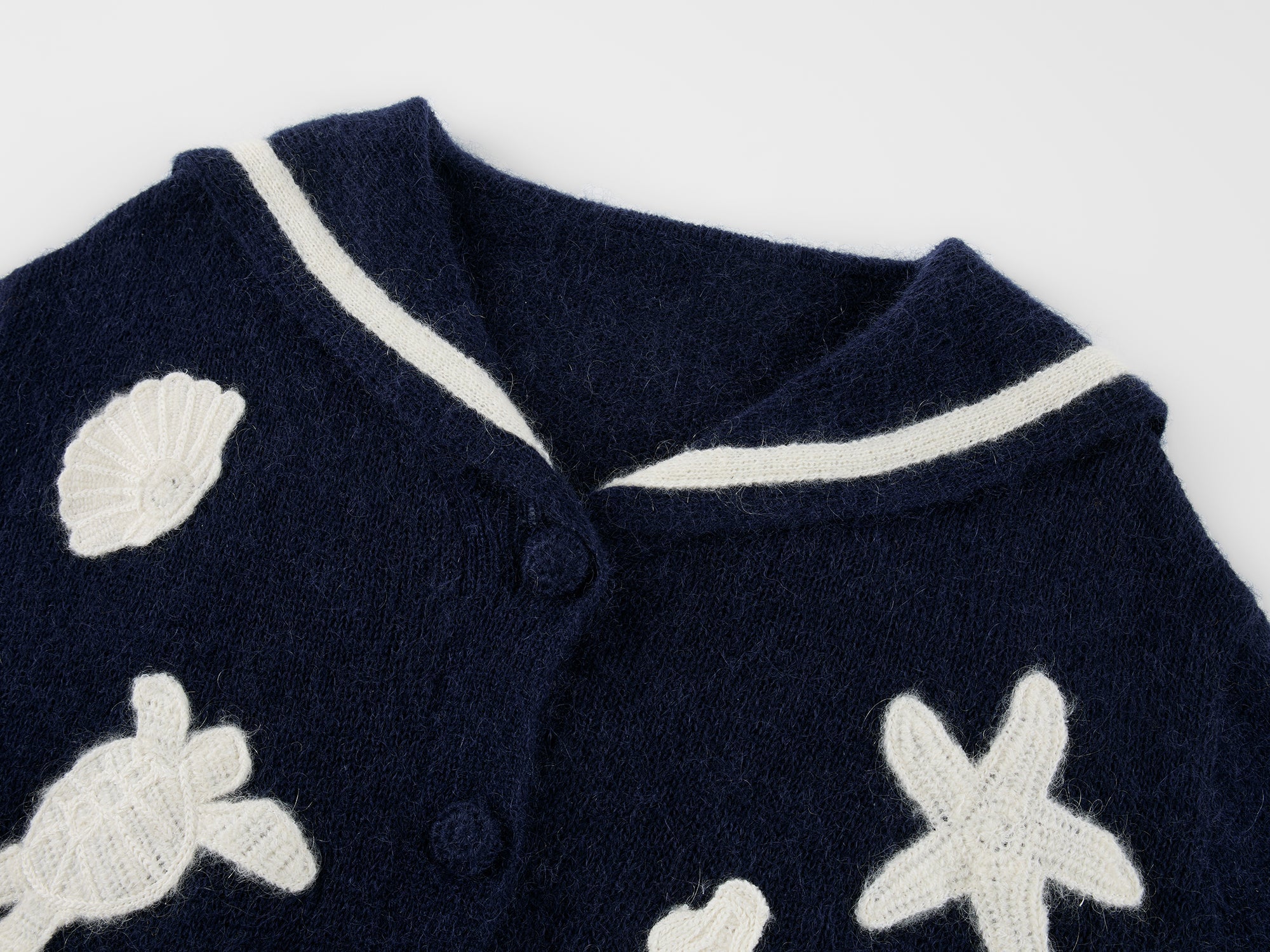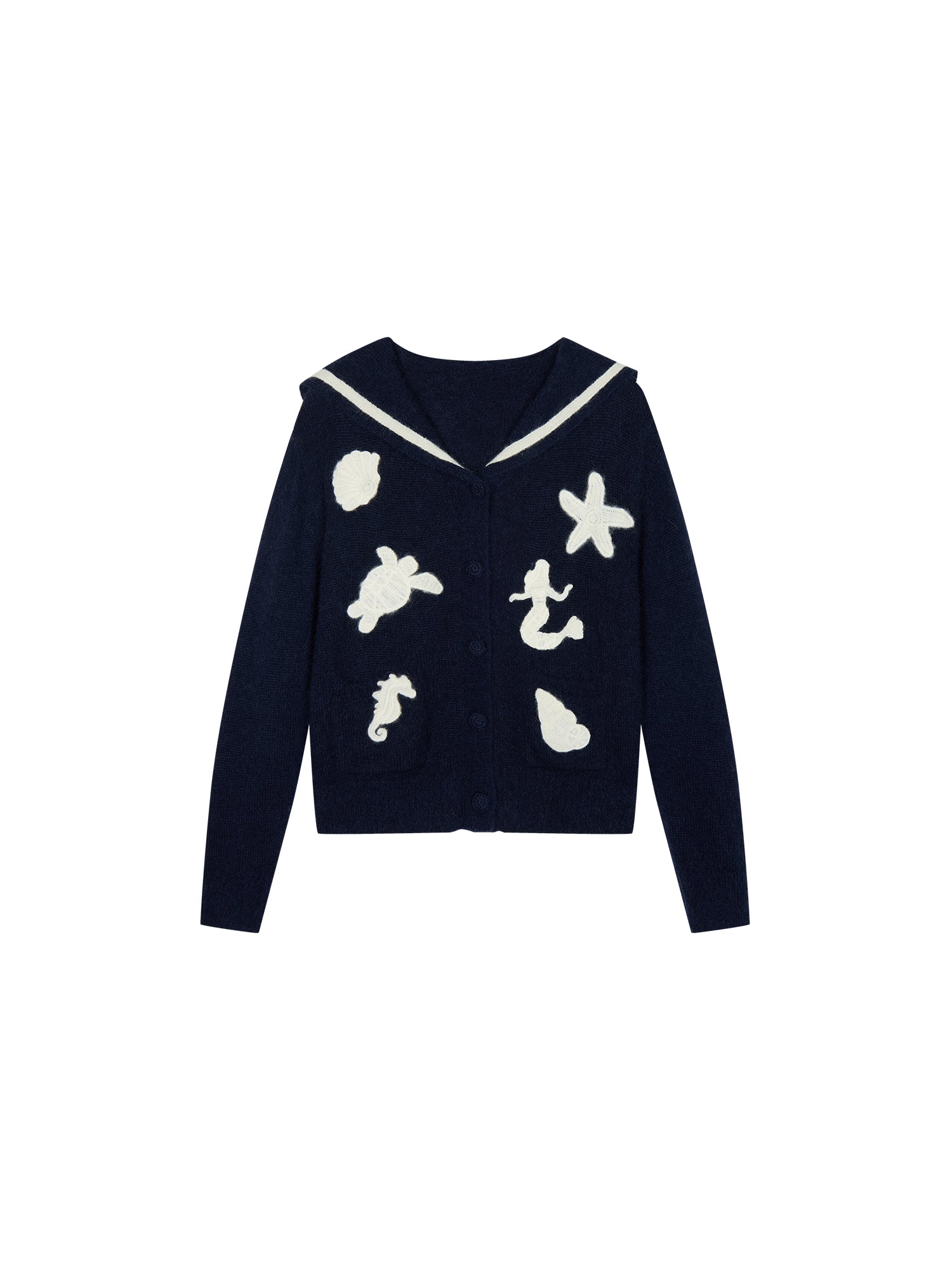 Classic sailor collar cardigan meets handcrafted fantasy undersea creatures; the 3D octopus echoes the back collar for a whimsical, playful style.