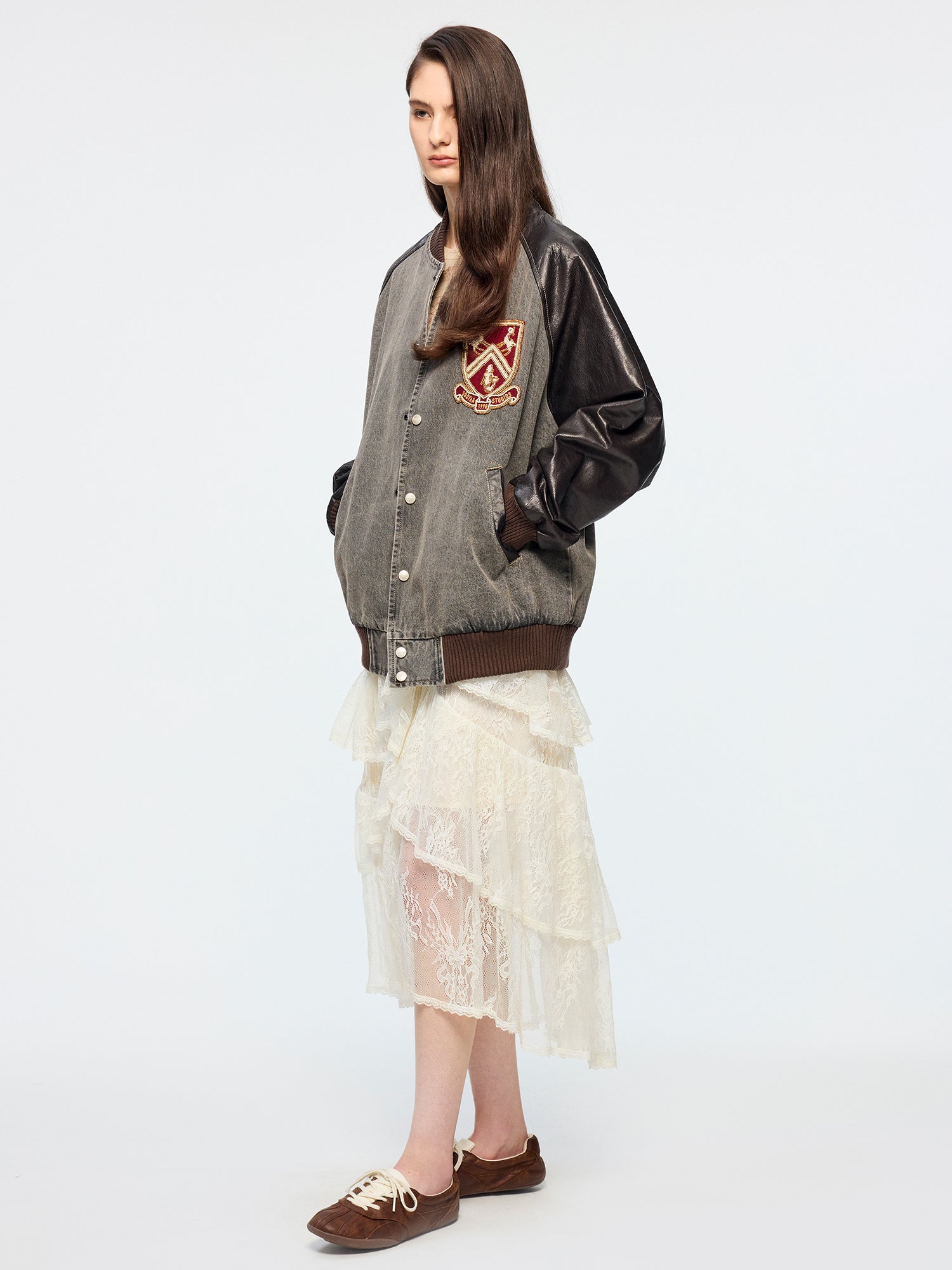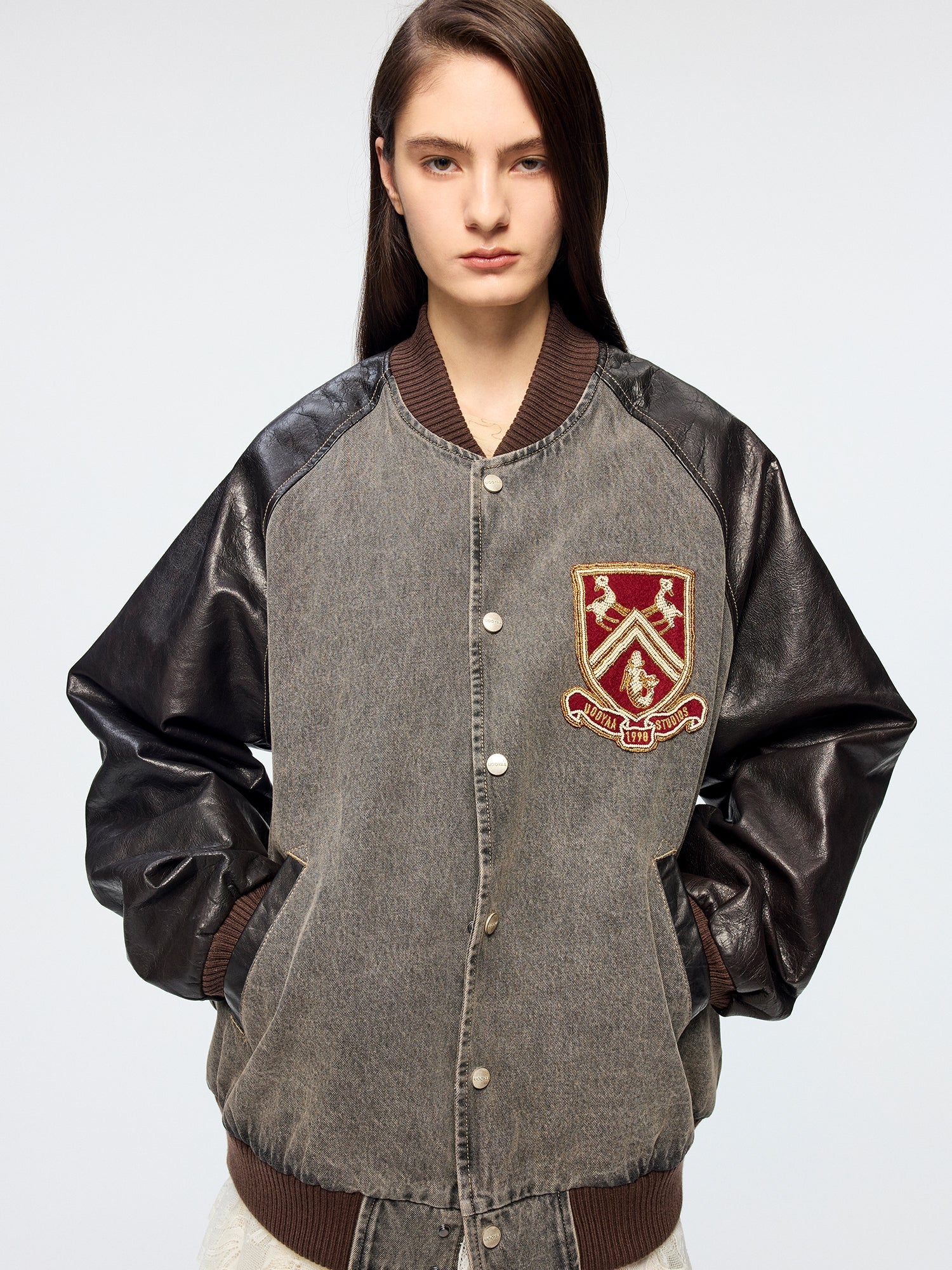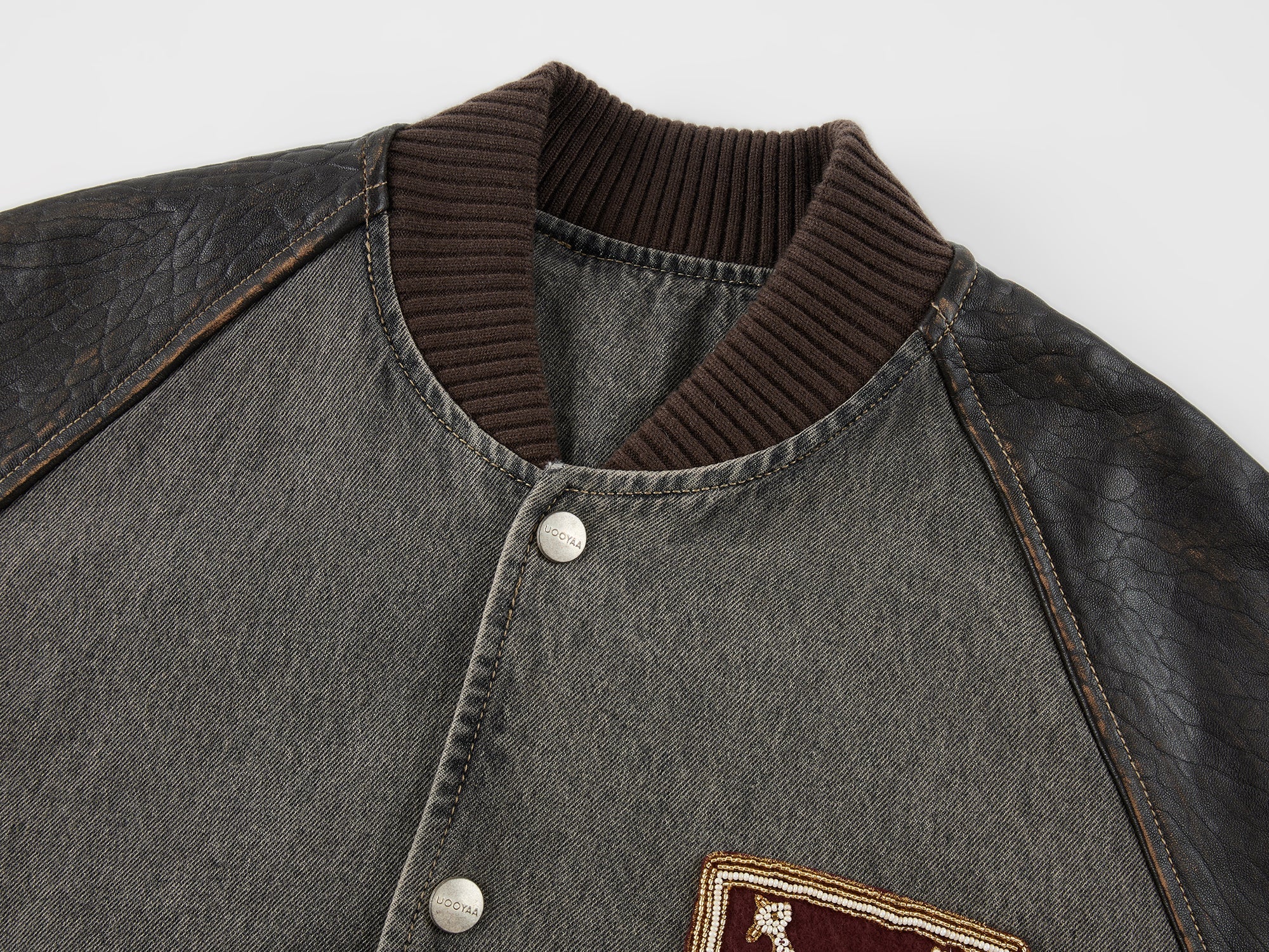 Baseball jacket with leather sleeves and badges