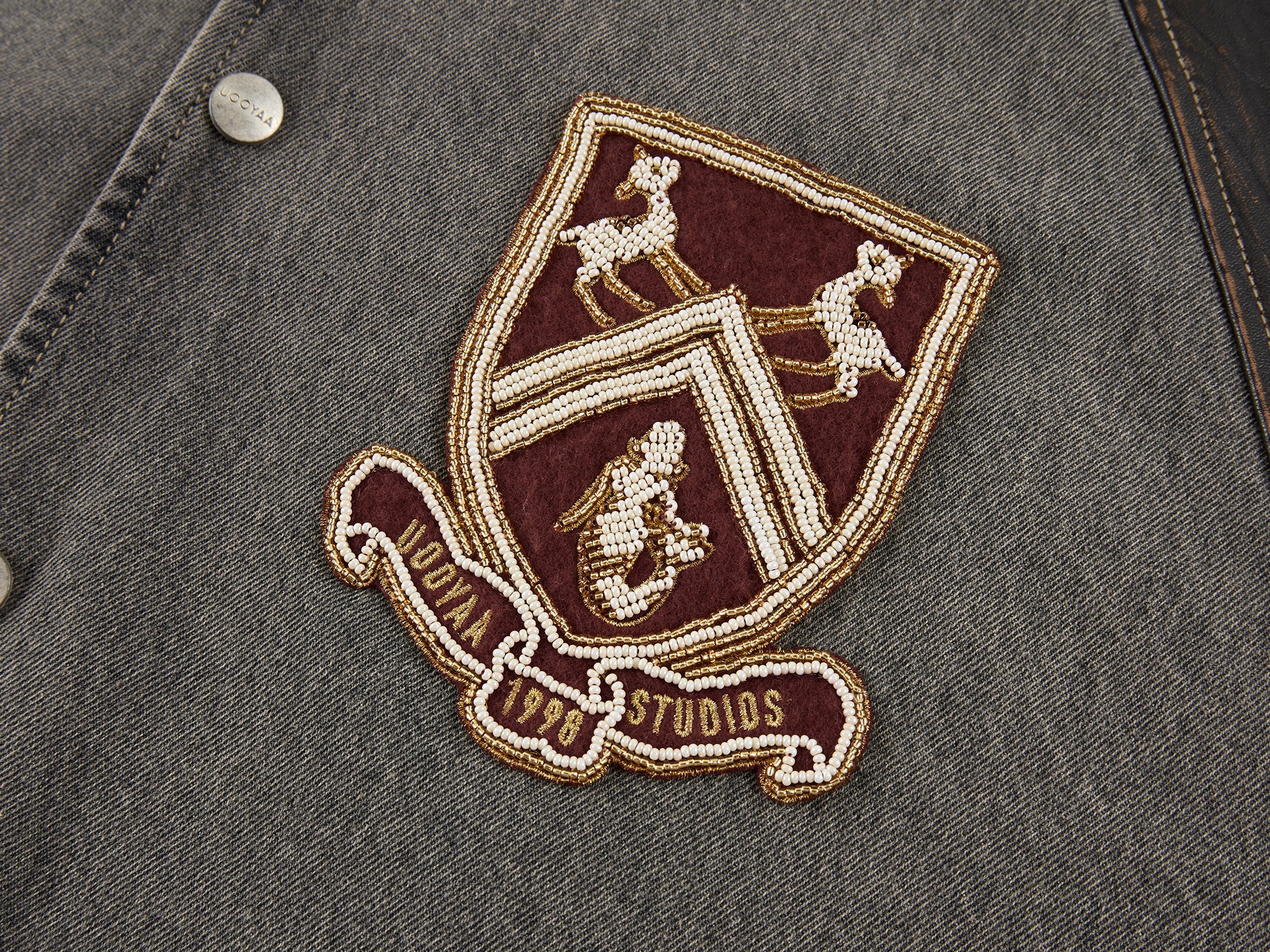 Fantasy deer and mermaid badges, crafted with beads and gold thread embroidery, offer exquisite luxury.Fabric: