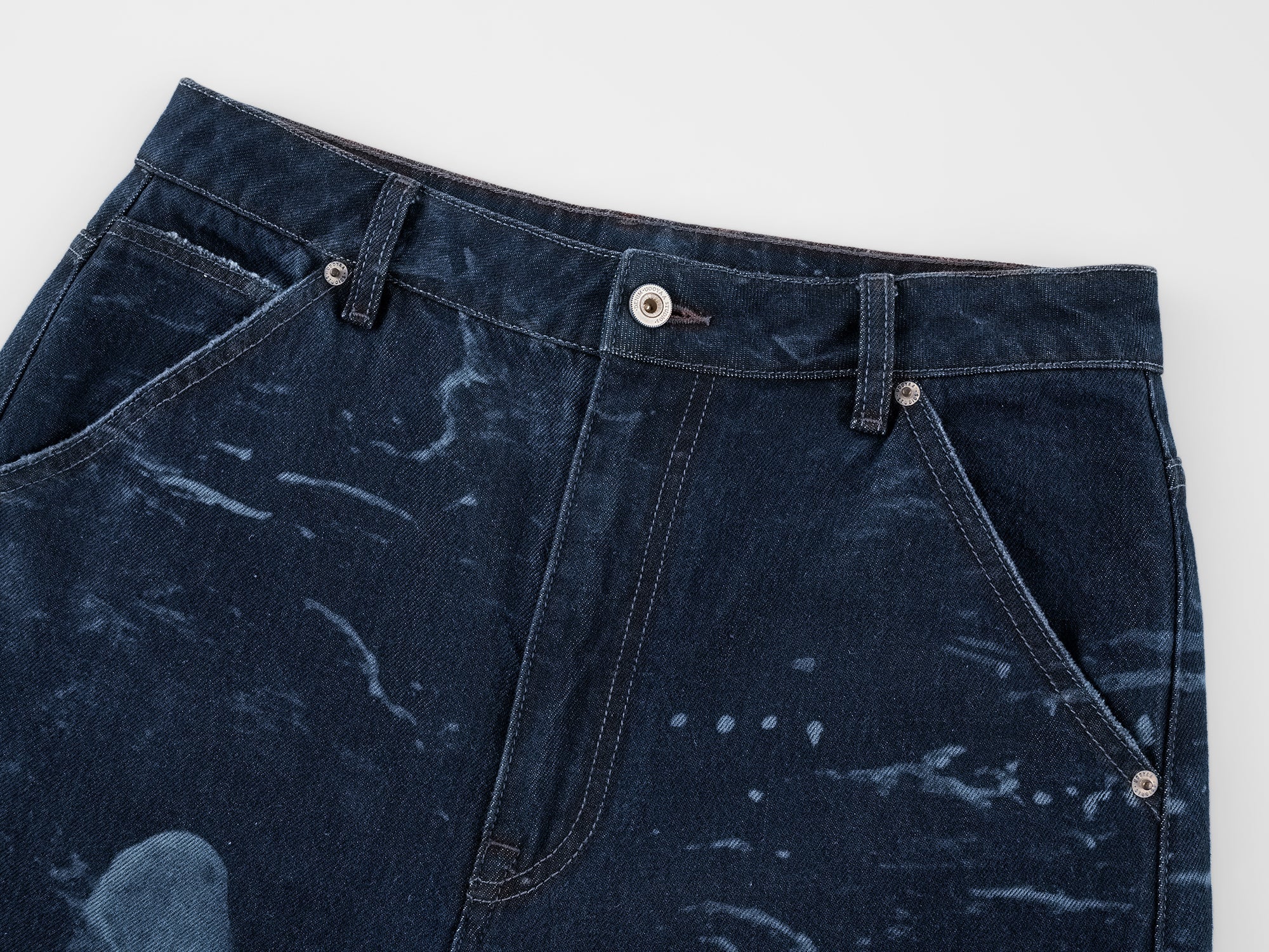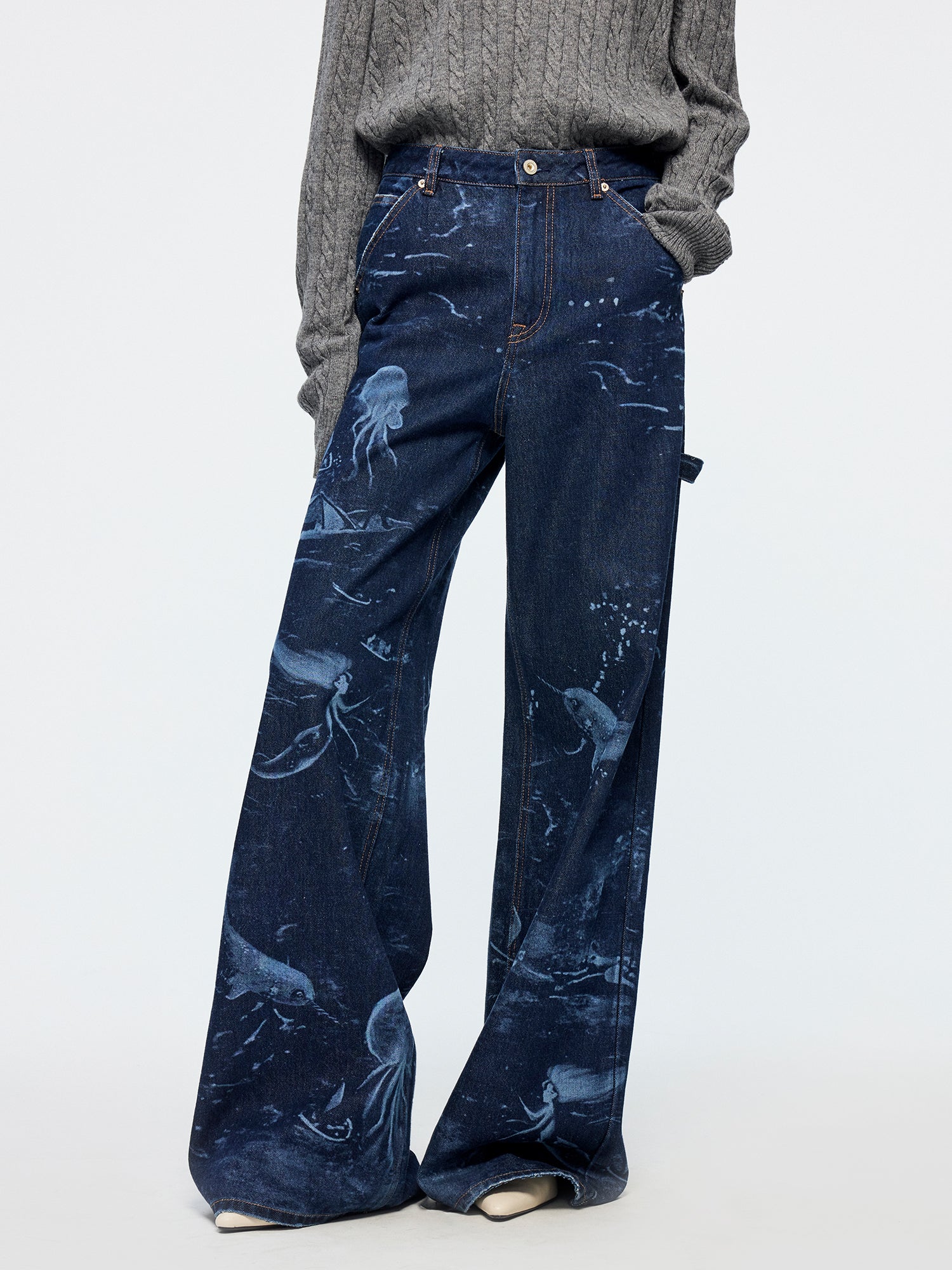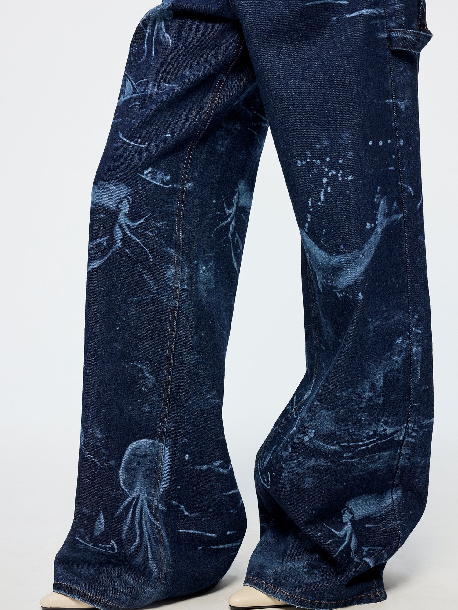 Classic carpenter pants in dark blue denim feature laser-etched undersea scenes, adding a whimsical touch.
