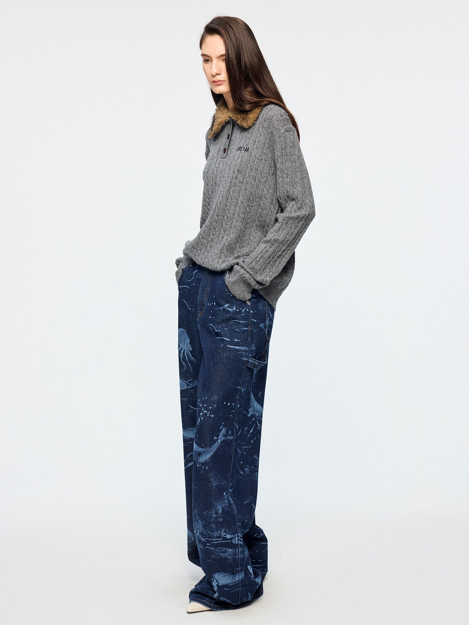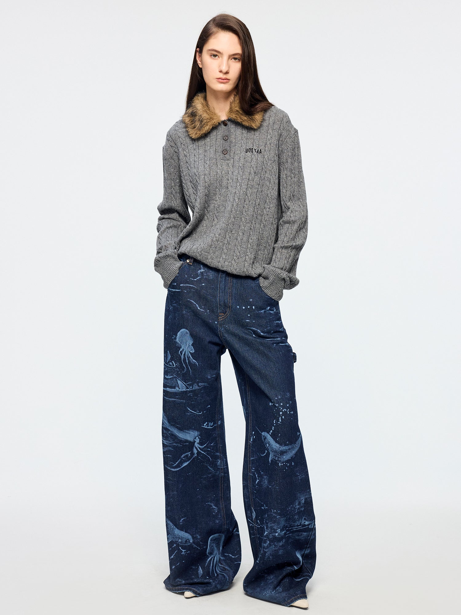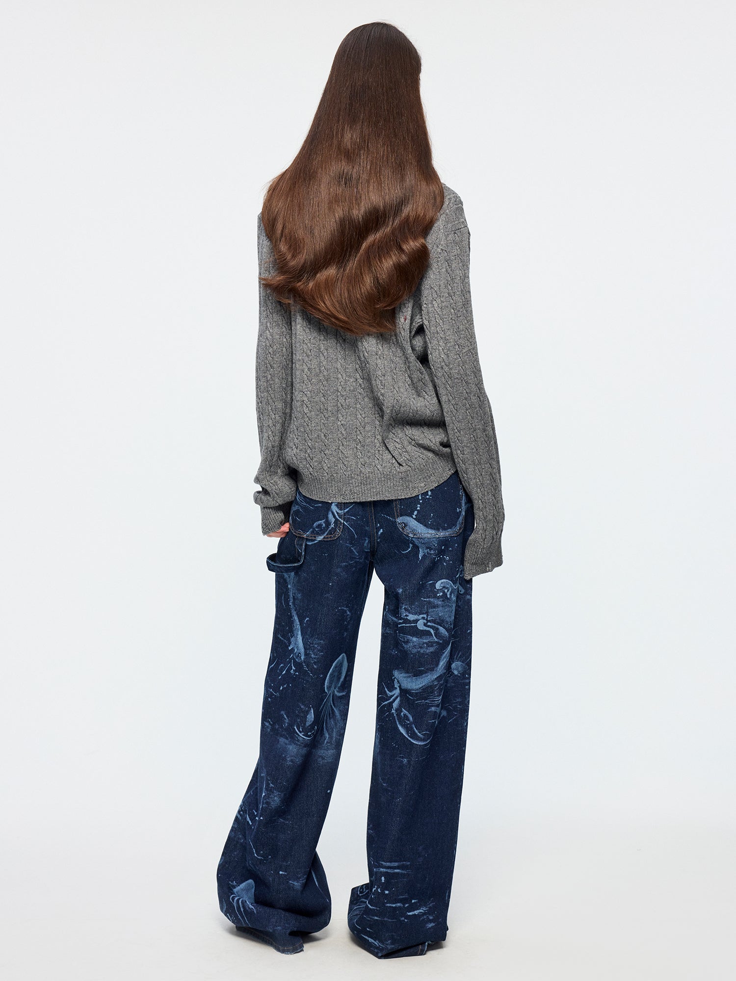 Classic carpenter pants in dark blue denim feature laser-etched undersea scenes, adding a whimsical touch.