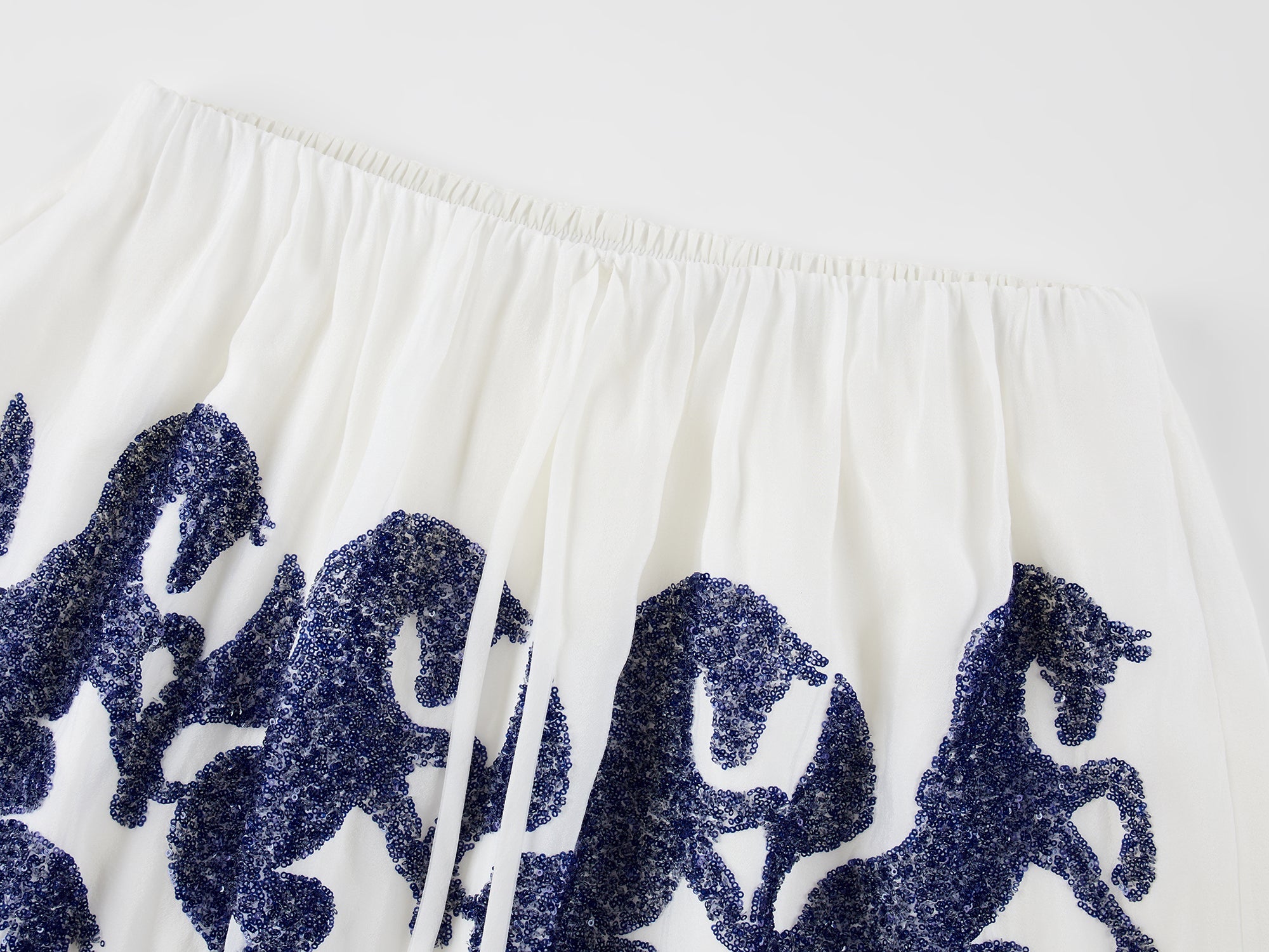 Classic blue and white colorway. Lightweight, comfortable cupro organza fabric pairs with an elastic drawstring waist for an inclusive, youthful fit.Fabric: