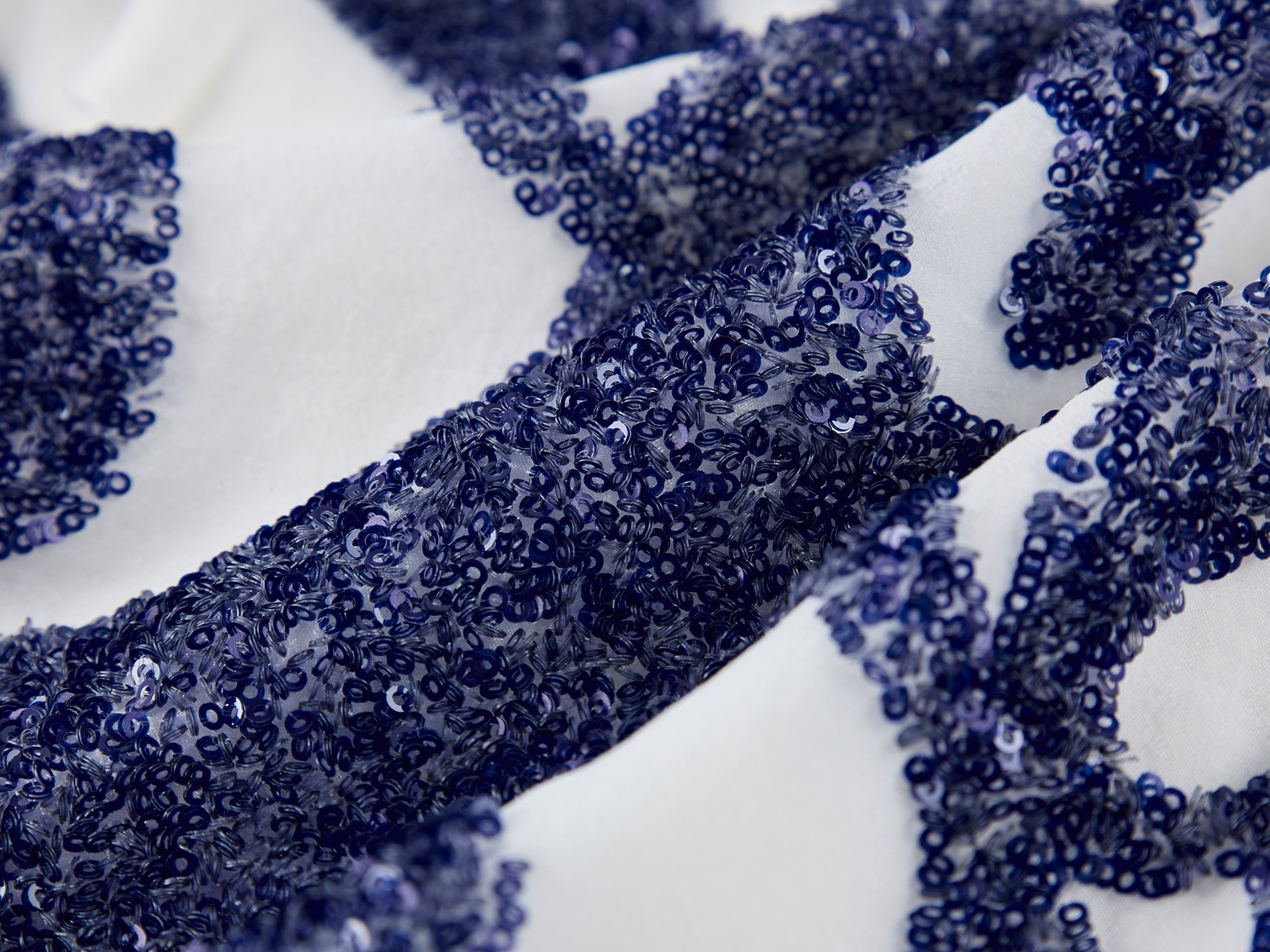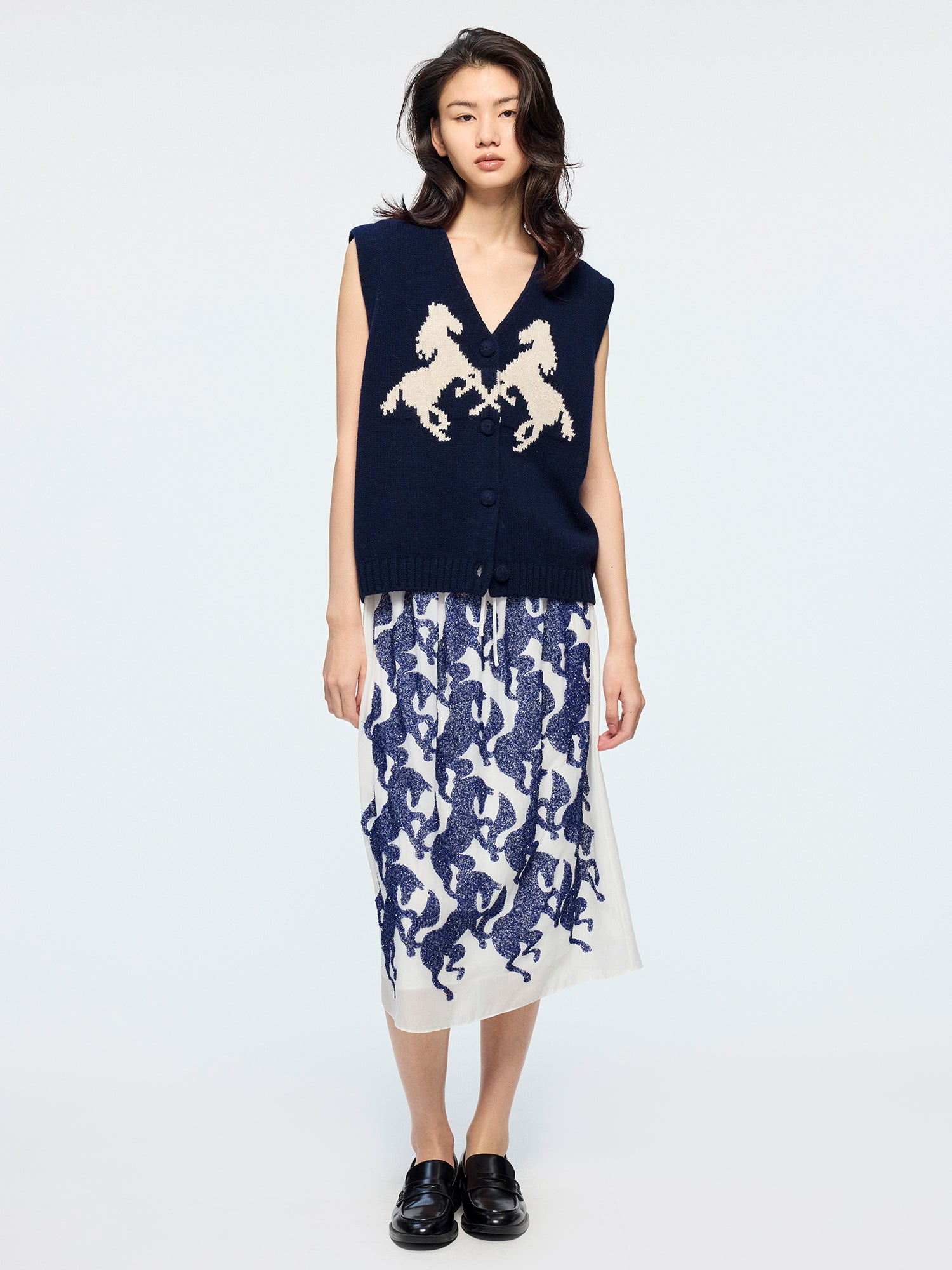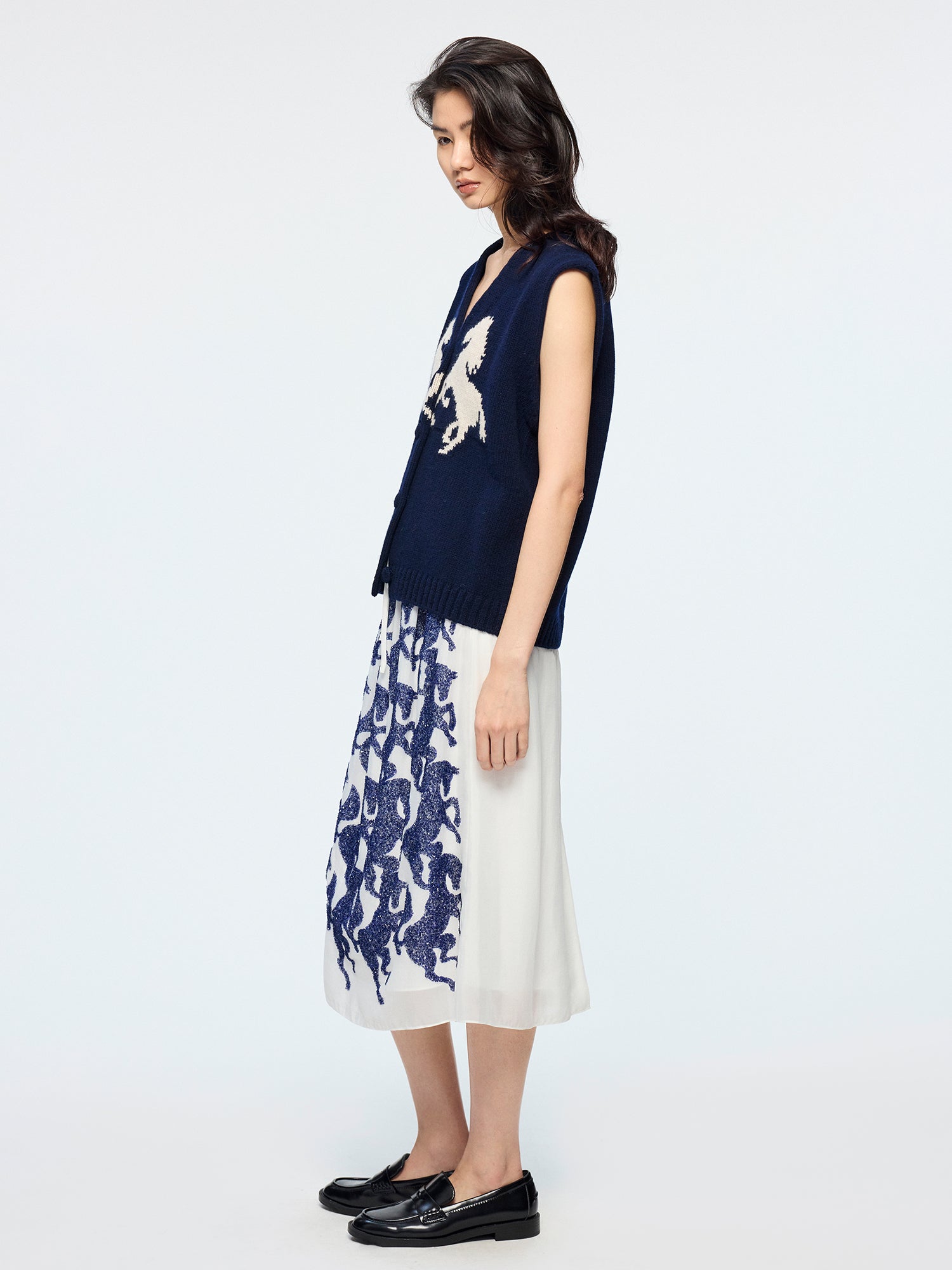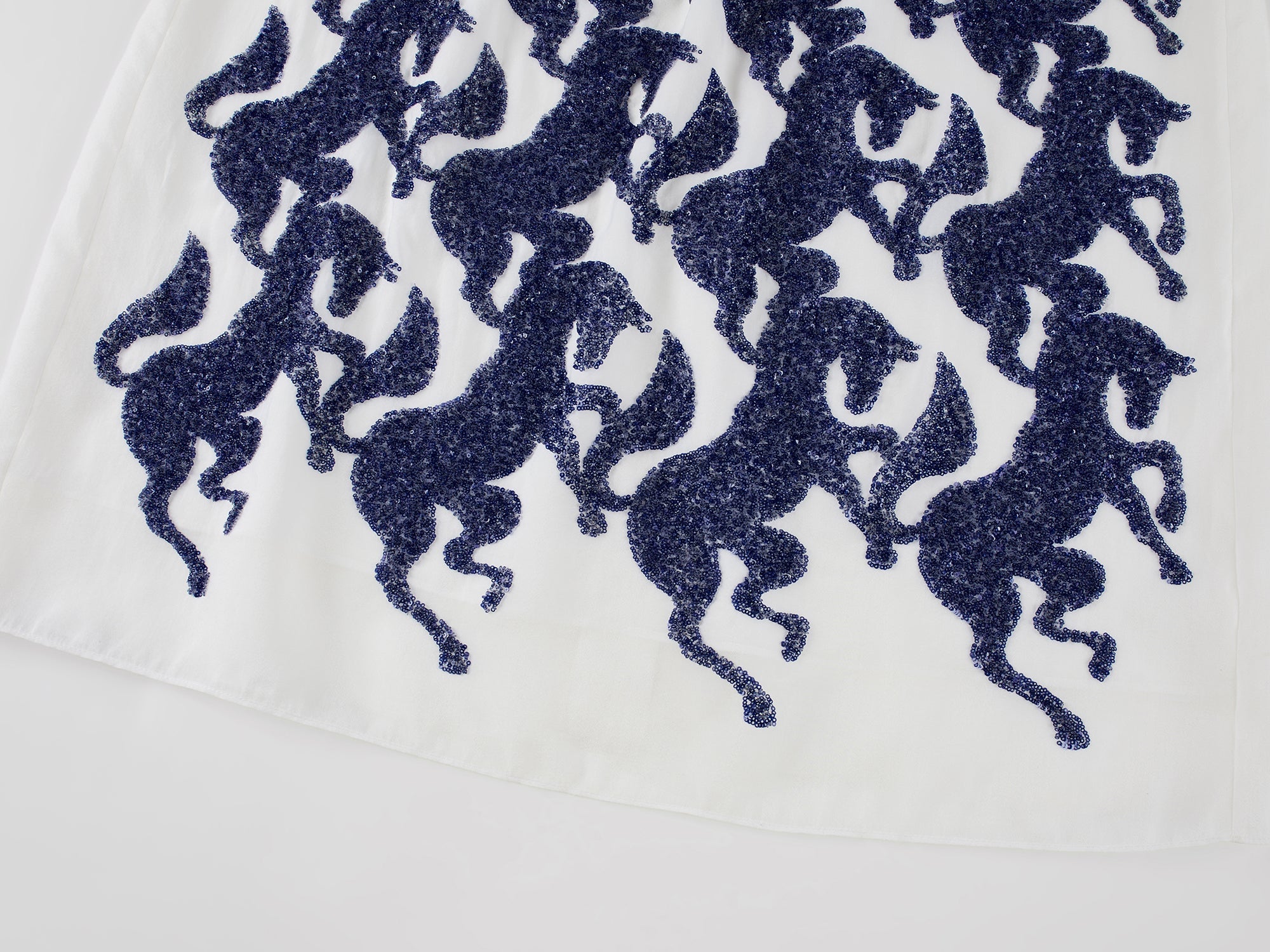 Little horse elements reinterpret the classic houndstooth pattern. Scattered sequin embroidery creates a rich texture and adds a whimsical, luxurious touch.