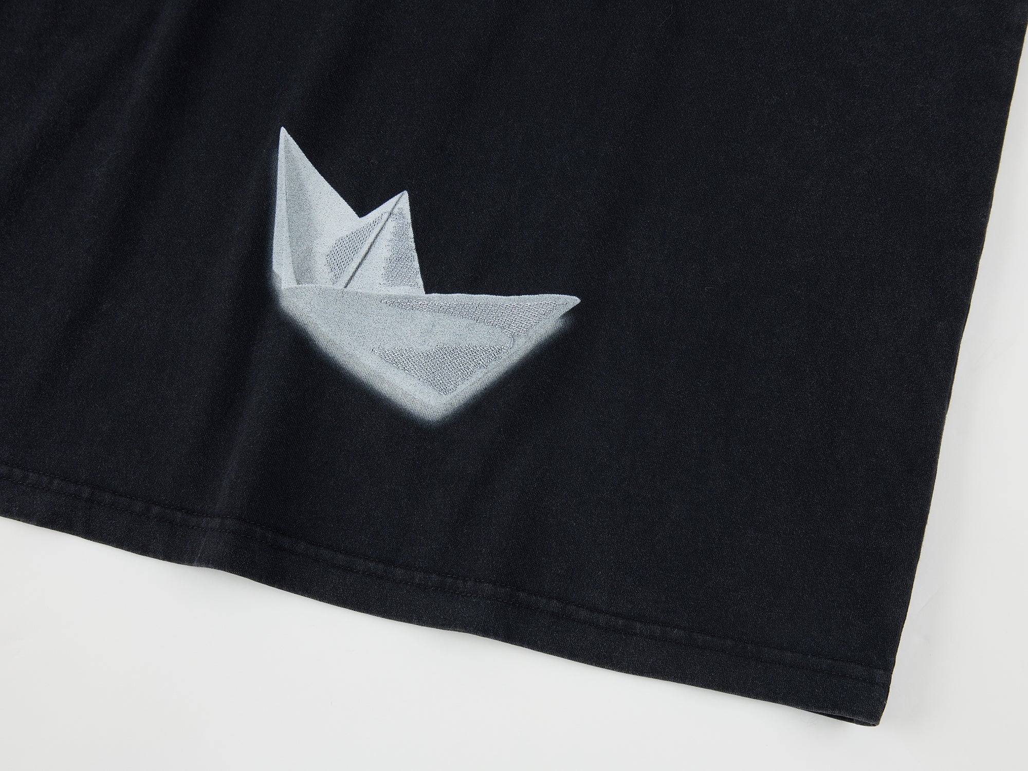 Print overlaying embroidery presents surreal origami birds and paper plane folding process.