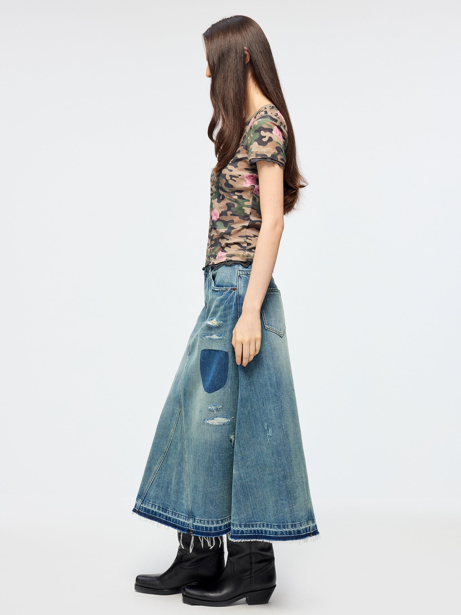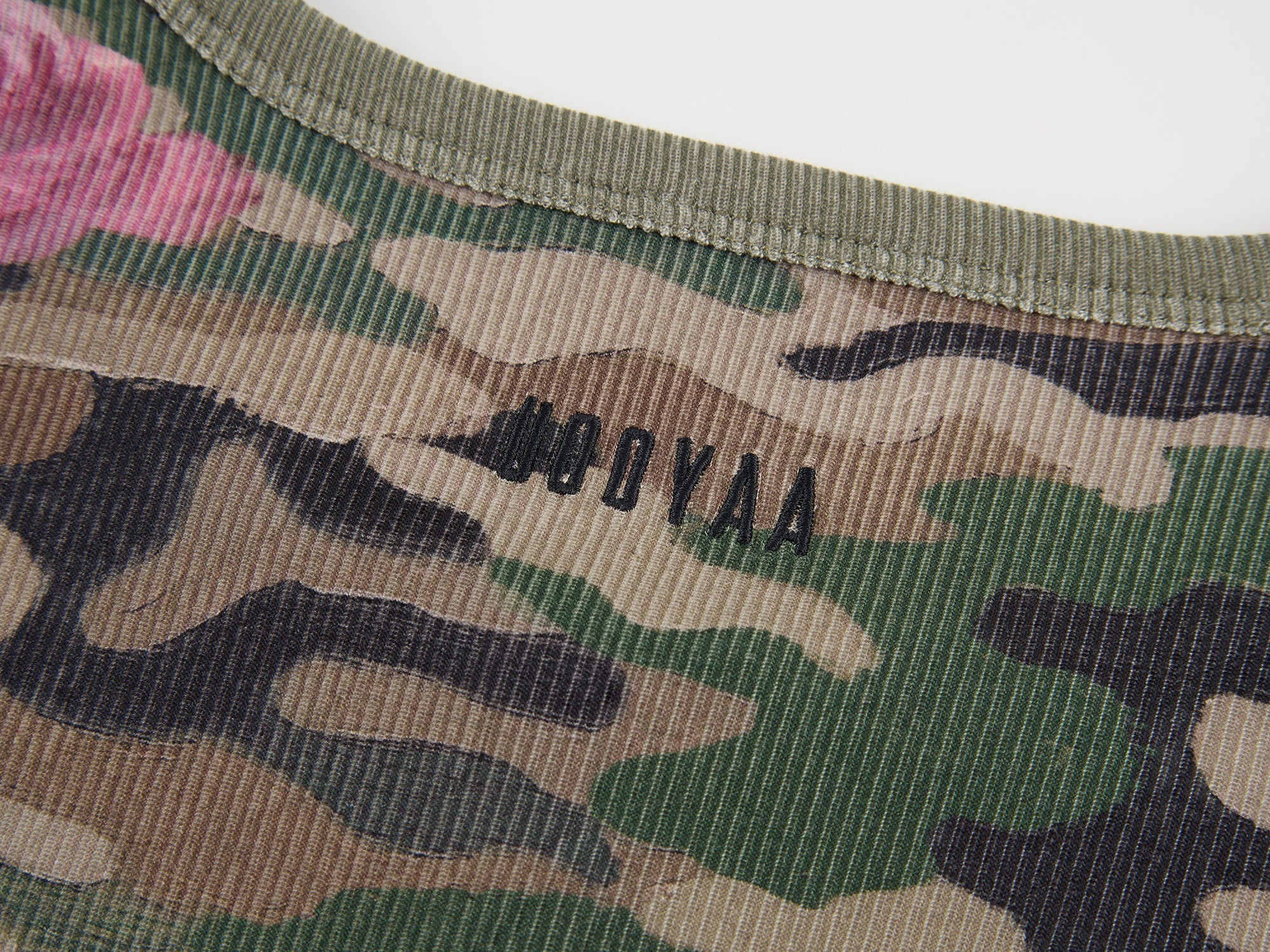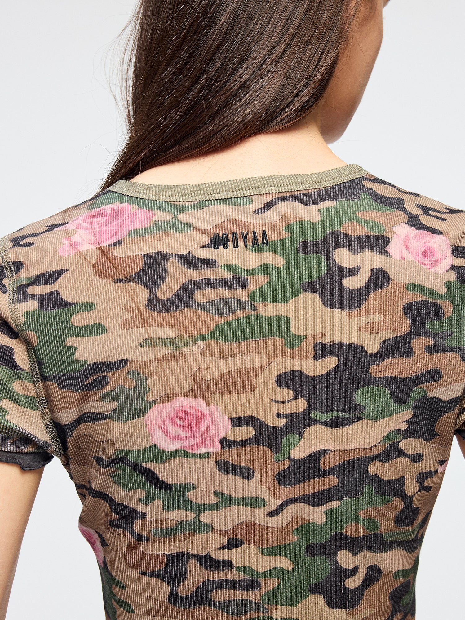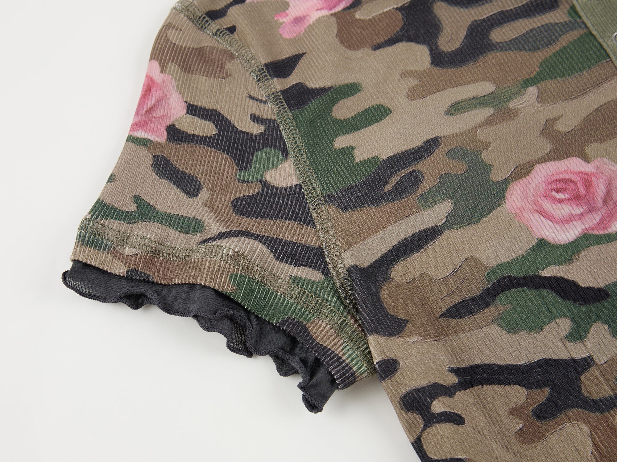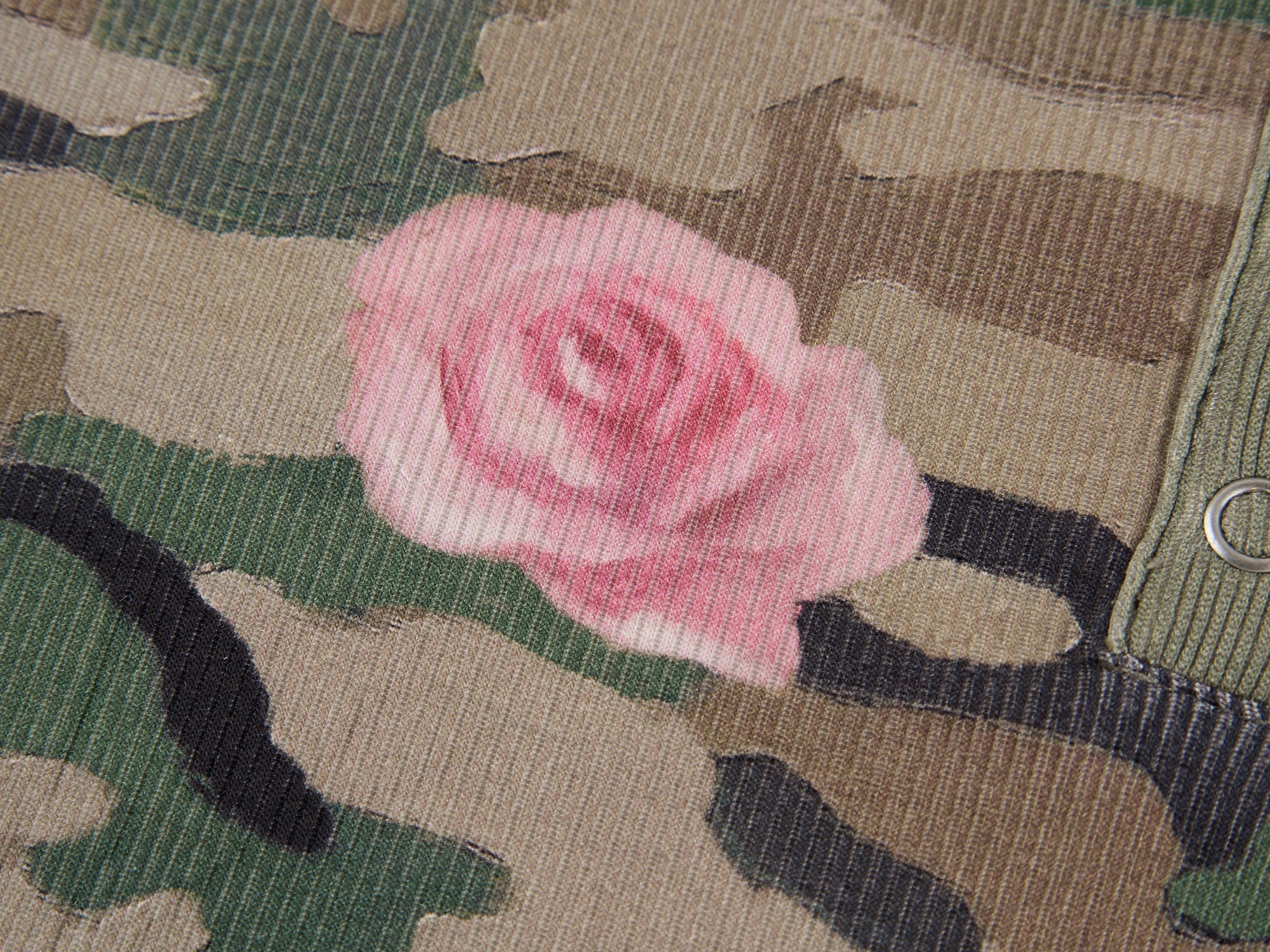 Oil painting texture expresses surreal rose camouflage for a whimsical, romantic style.