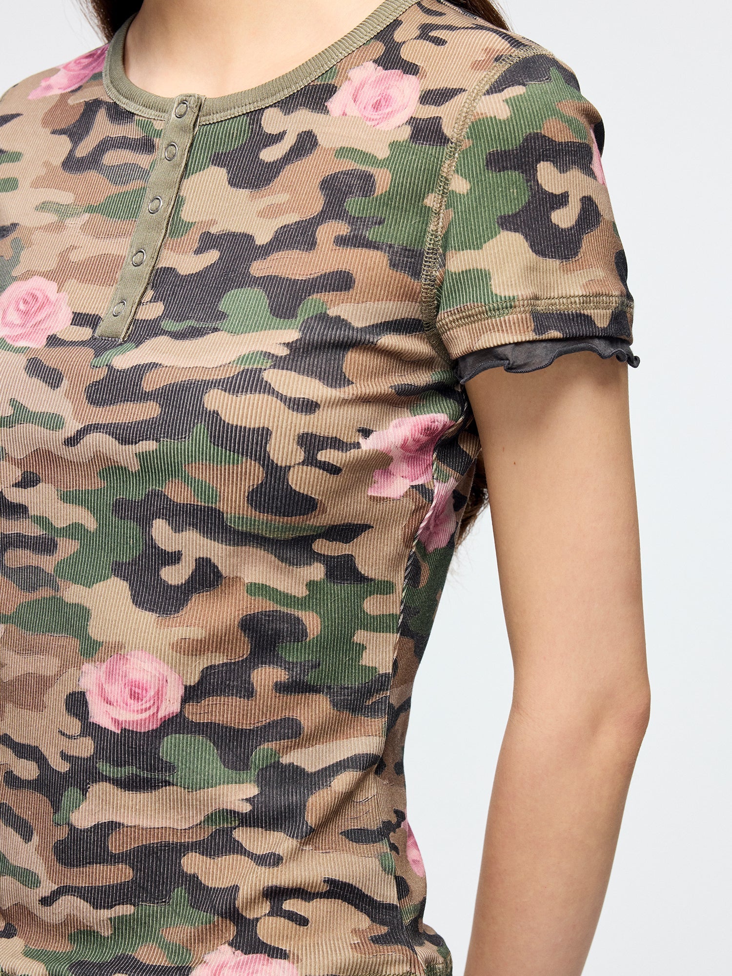 Classic Henley T-shirt with a fitted cropped fit and lettuce edge design adds youthful playfulness.