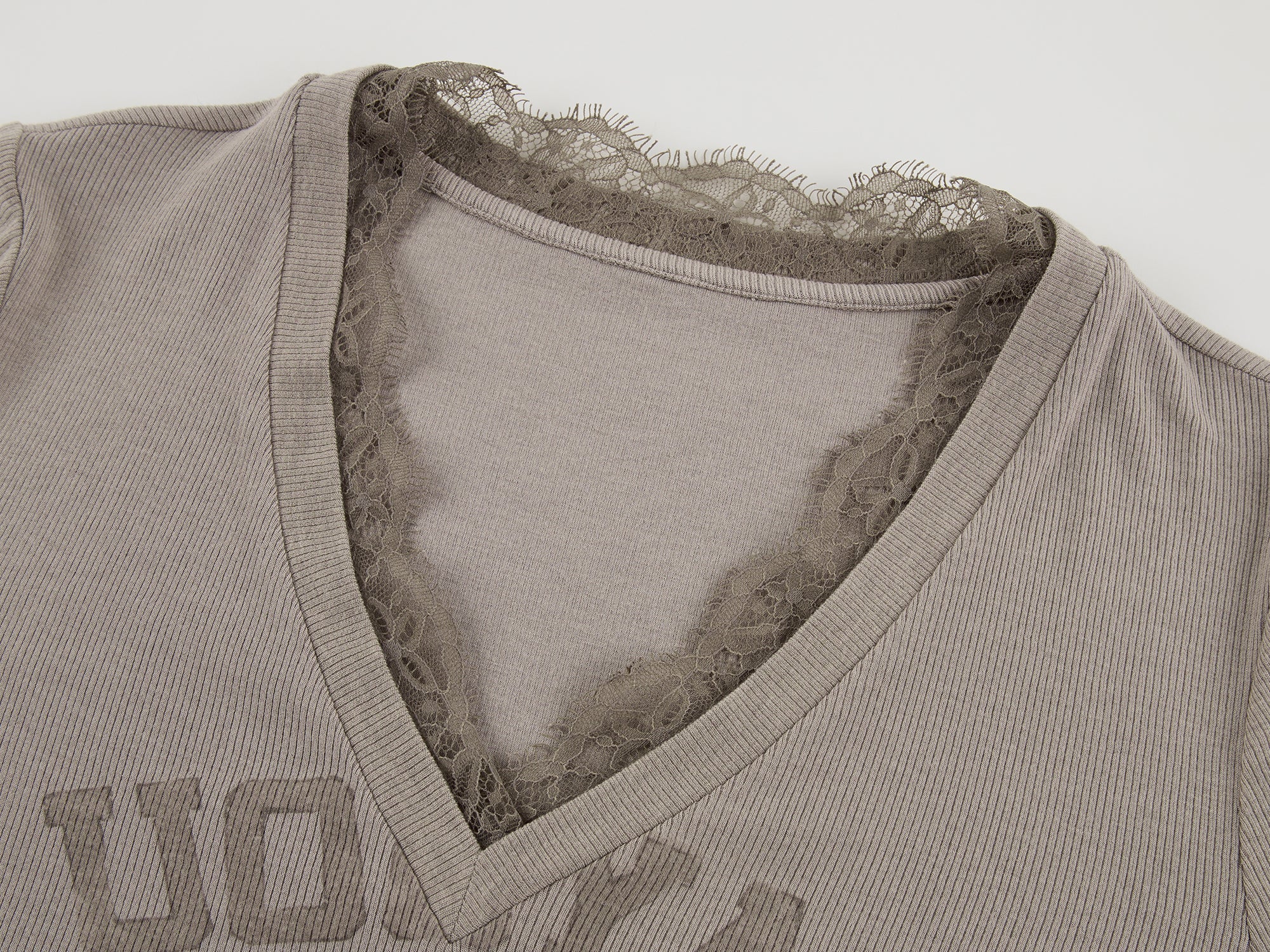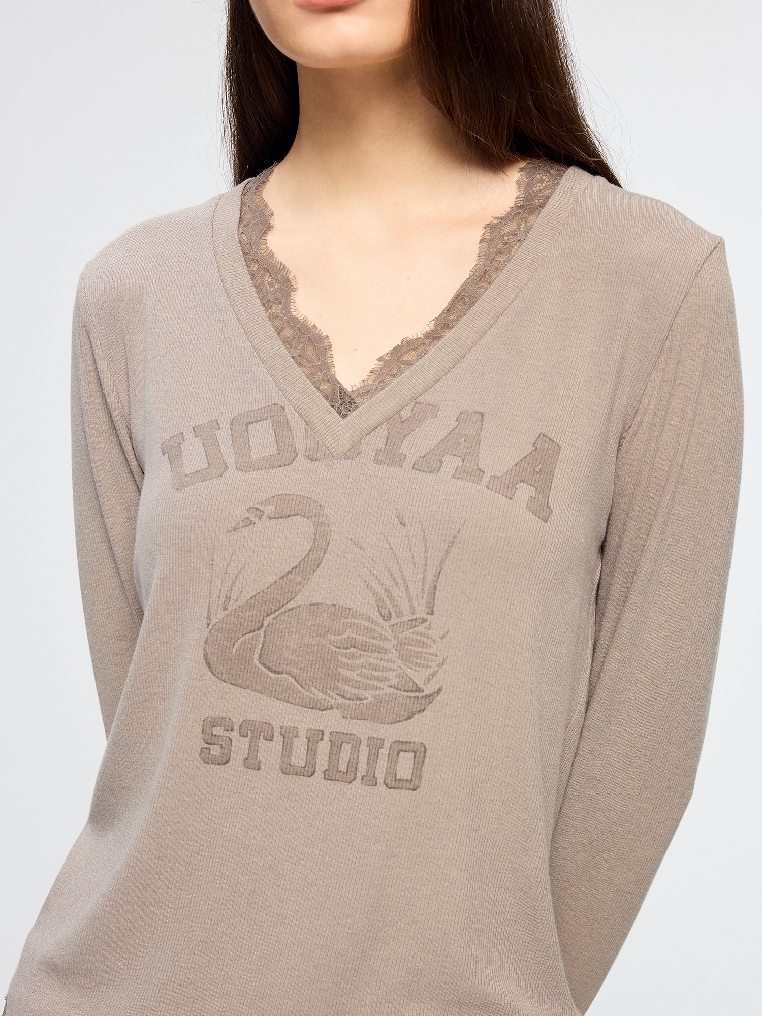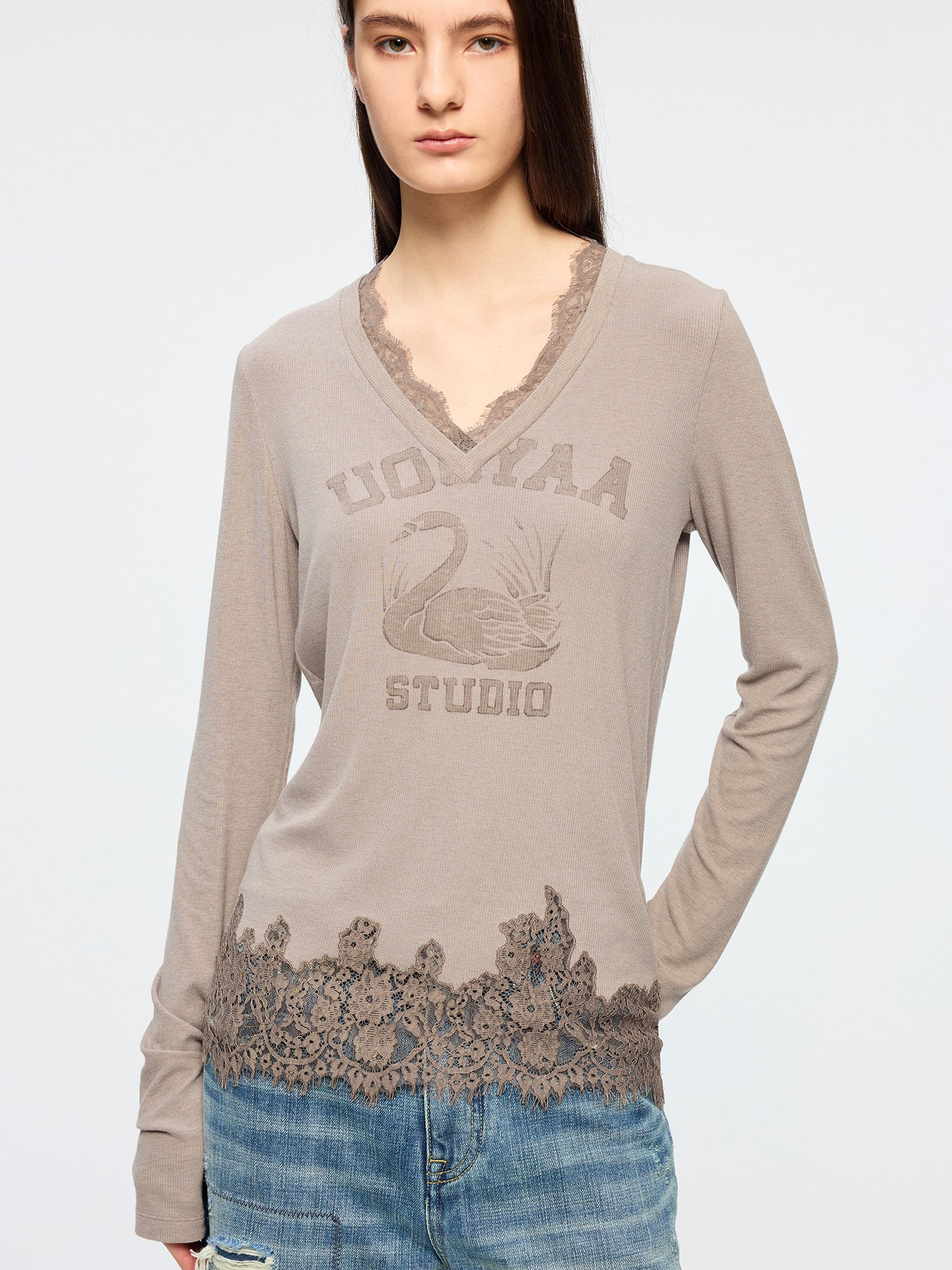 V-neck long sleeve T-shirt with garden swan collegiate print and irregular lace trim, creating a romantic, casual look.