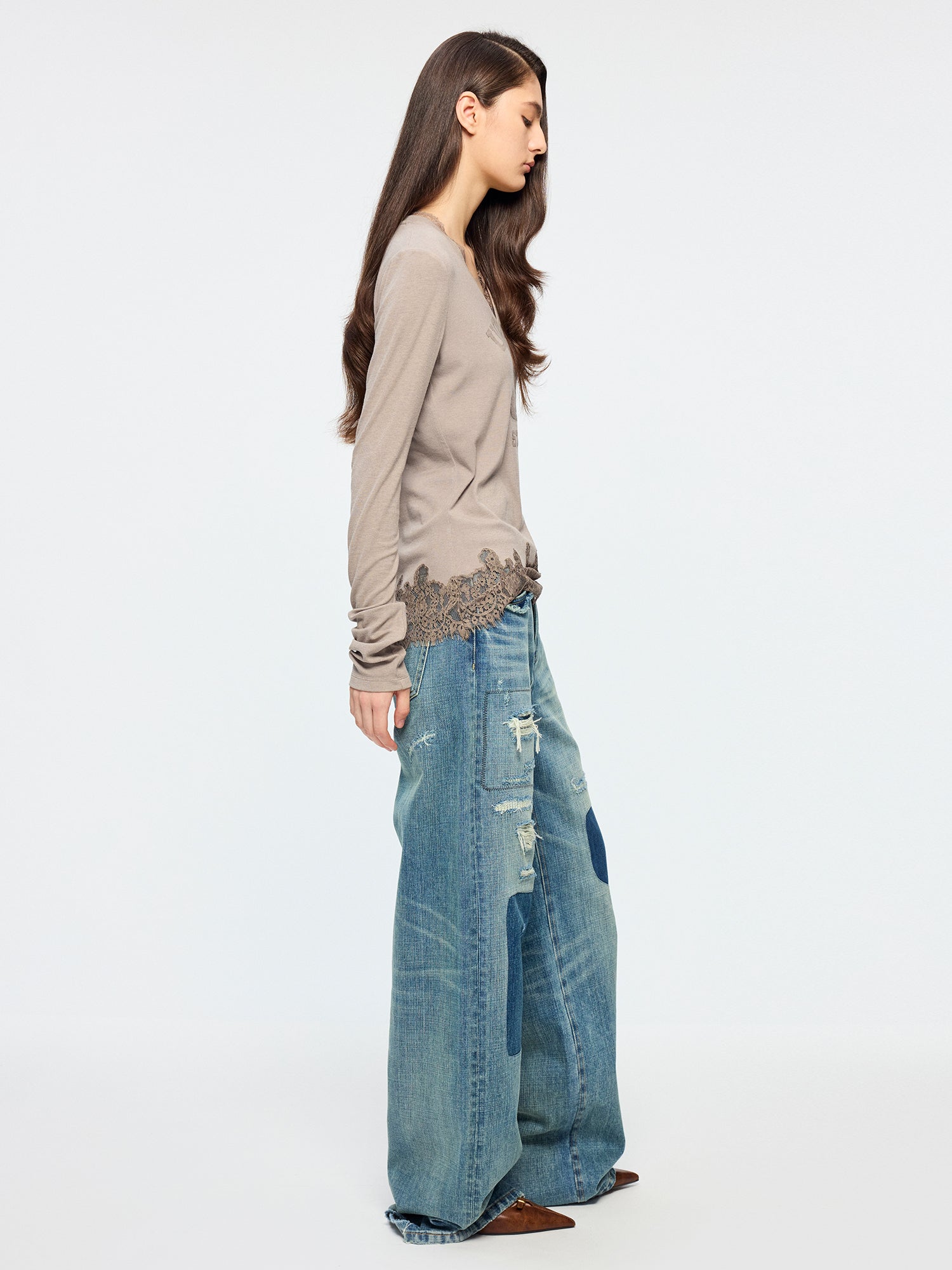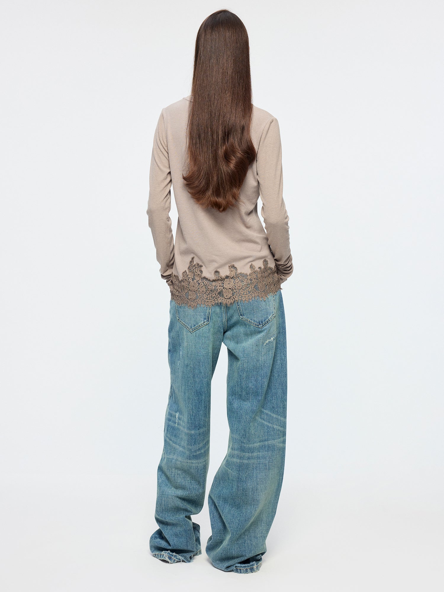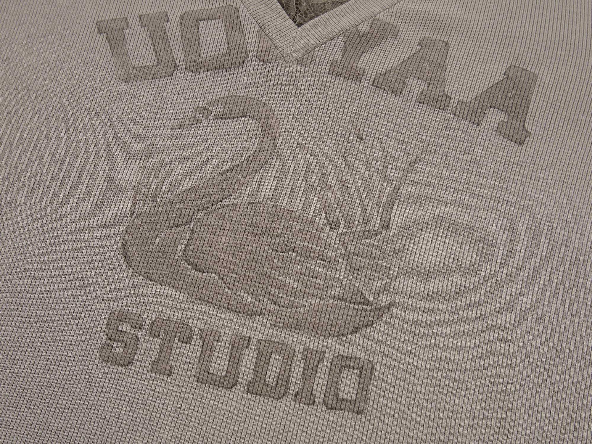 V-neck long sleeve T-shirt with garden swan collegiate print and irregular lace trim, creating a romantic, casual look.