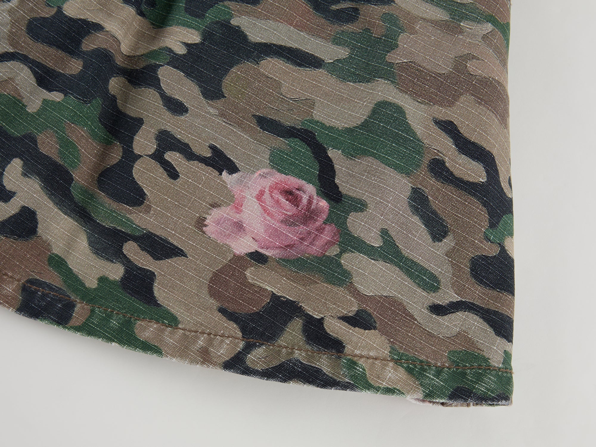 Oil painting texture expresses surreal rose camouflage, giving the youthful five-pocket mini skirt a whimsical, romantic style.