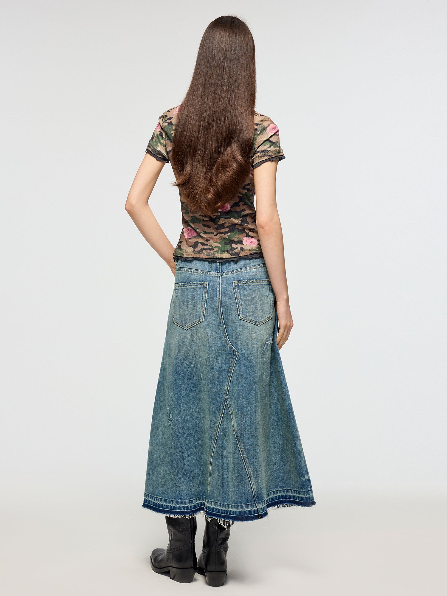 Distressed patchwork denim skirt