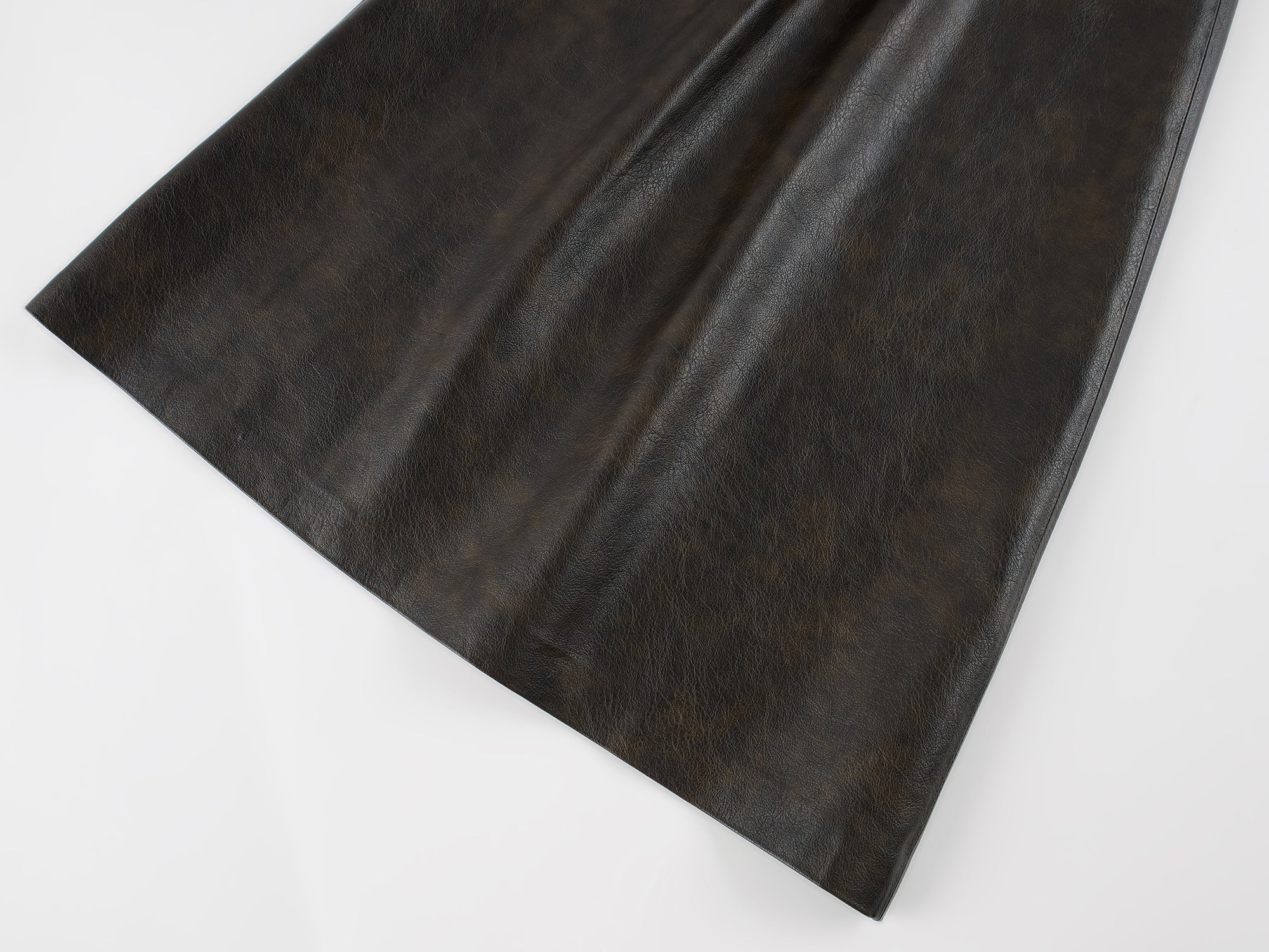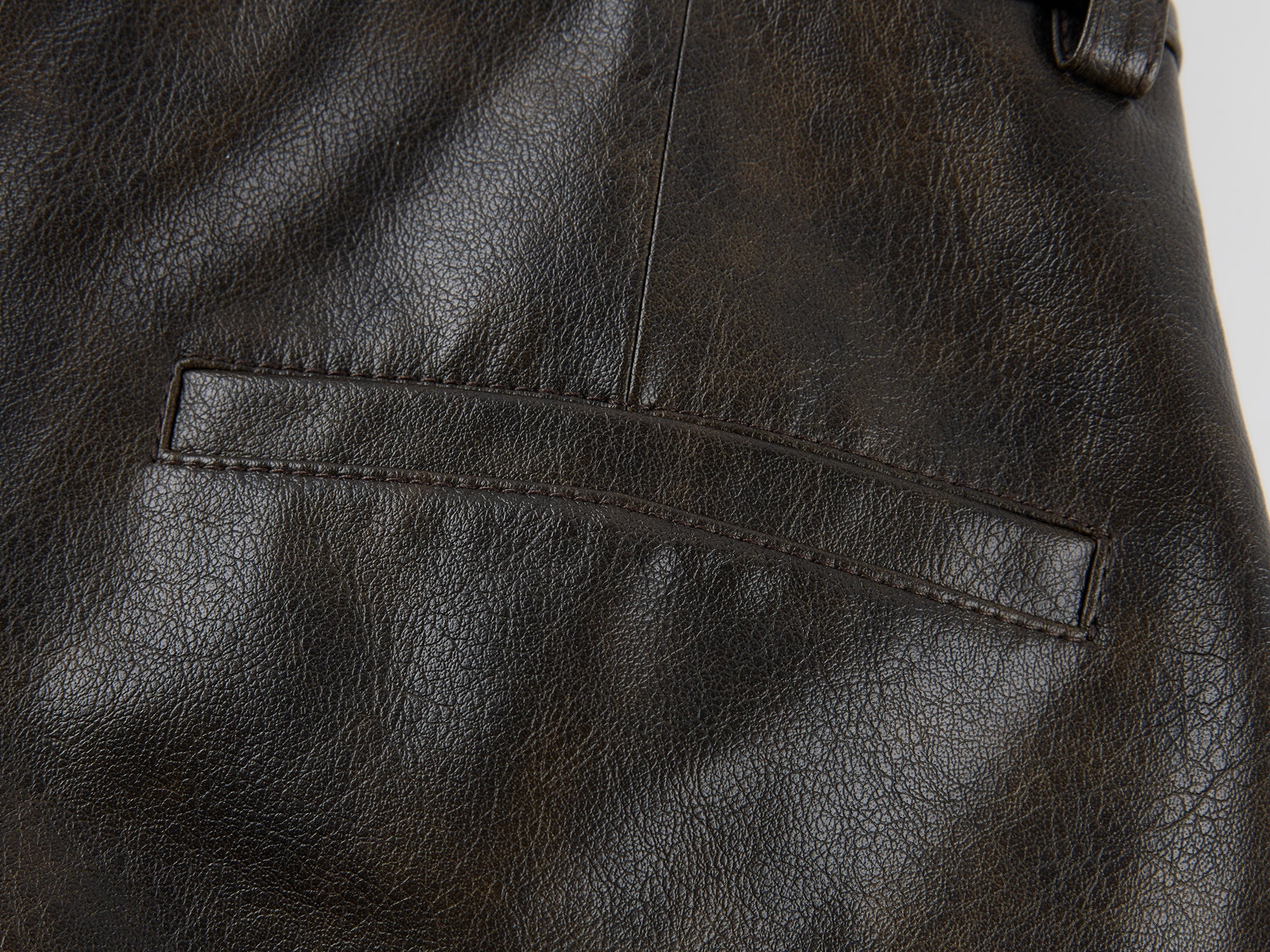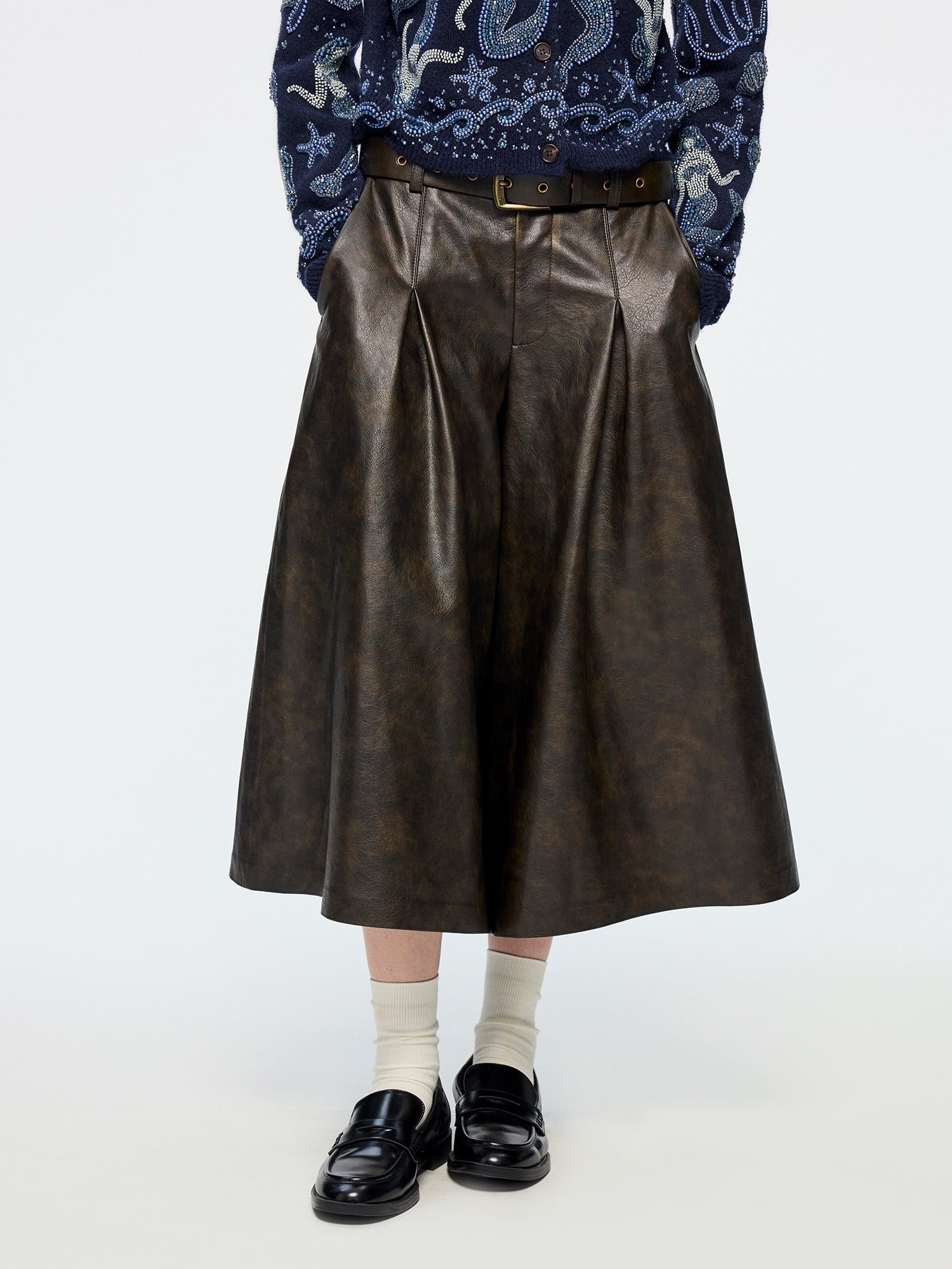 Cropped wide-leg silhouette features a pleated waist, rubbed PU fabric, and an antique gold belt for a vintage urban look.