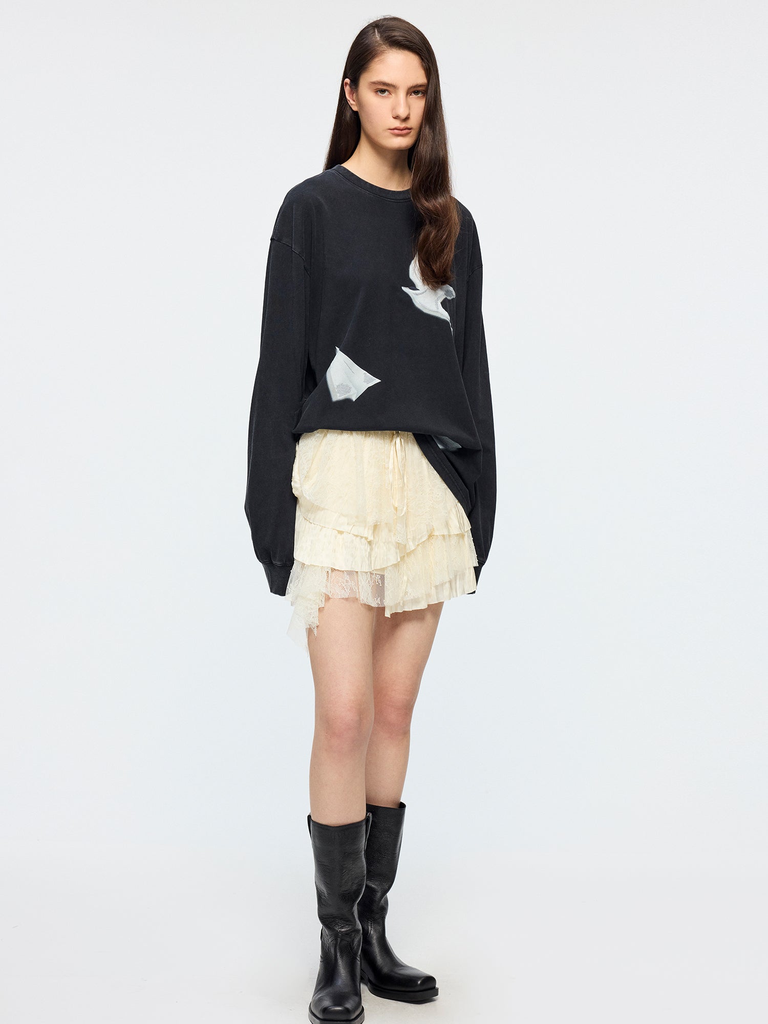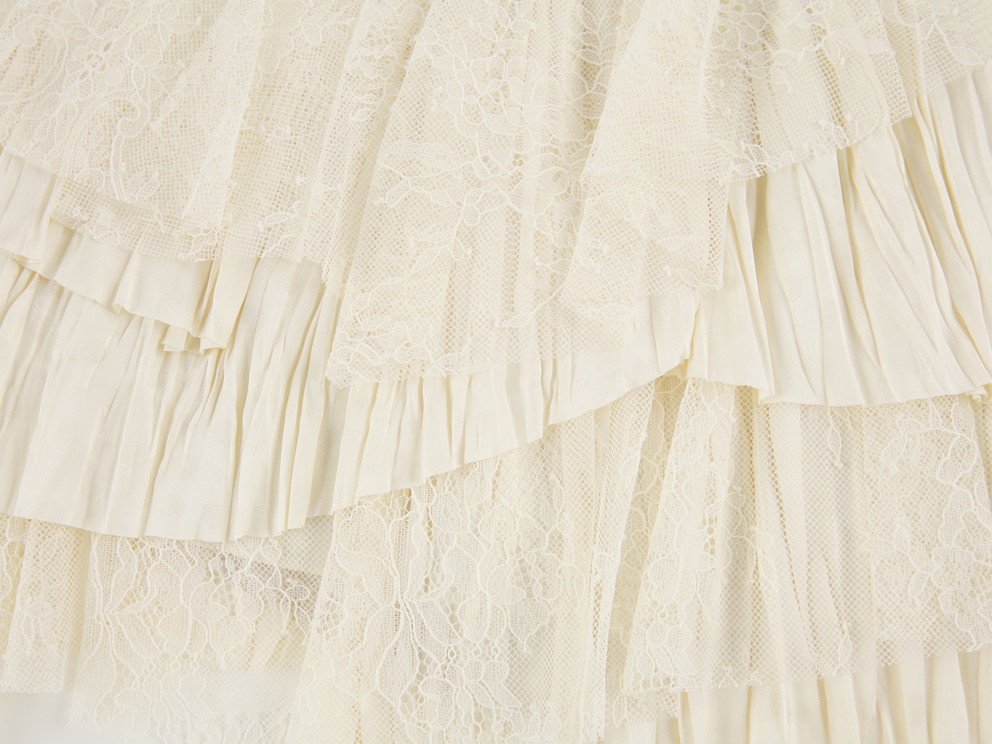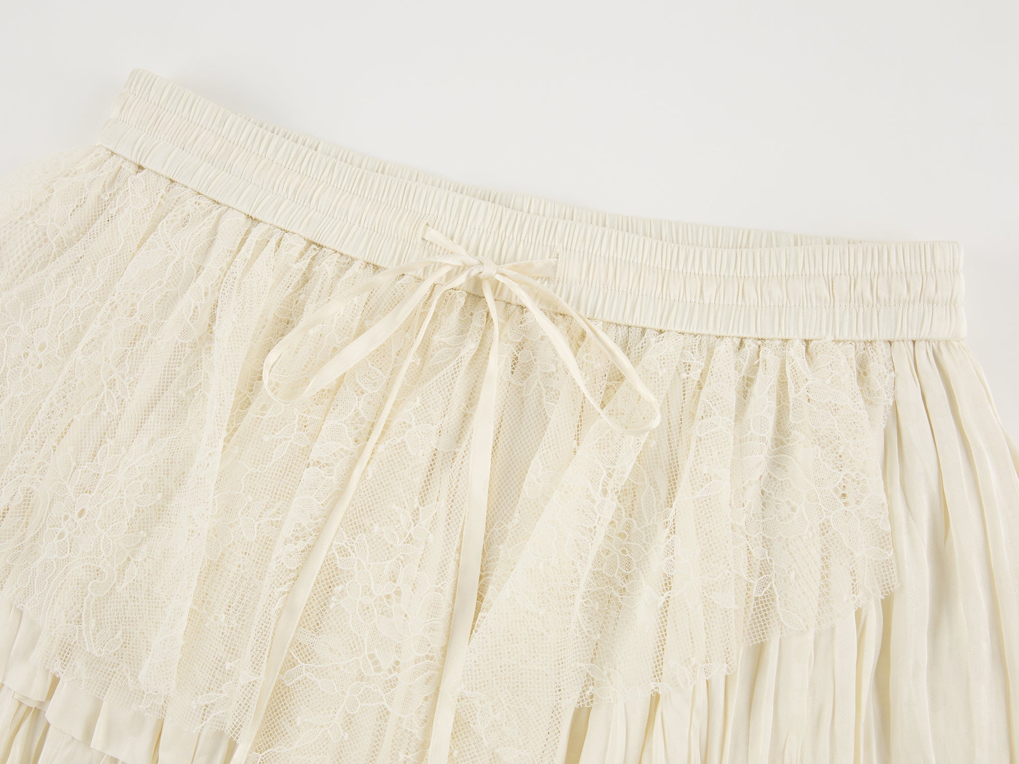 Staggered patchwork of lace and jacquard fabrics creates a tiered skirt style, adding casual playfulness.