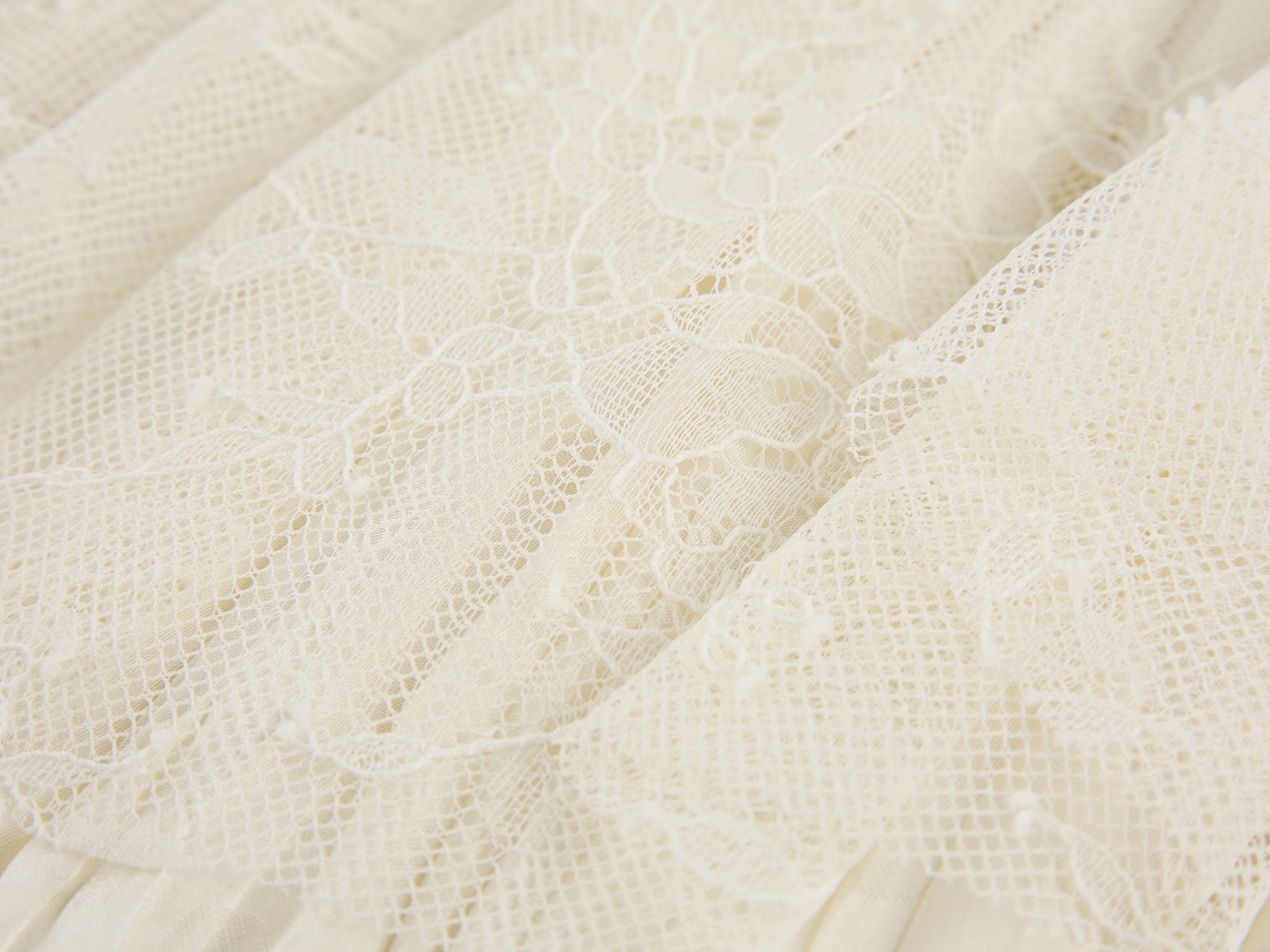 Staggered patchwork of lace and jacquard maximizes visual depth.Fabric: