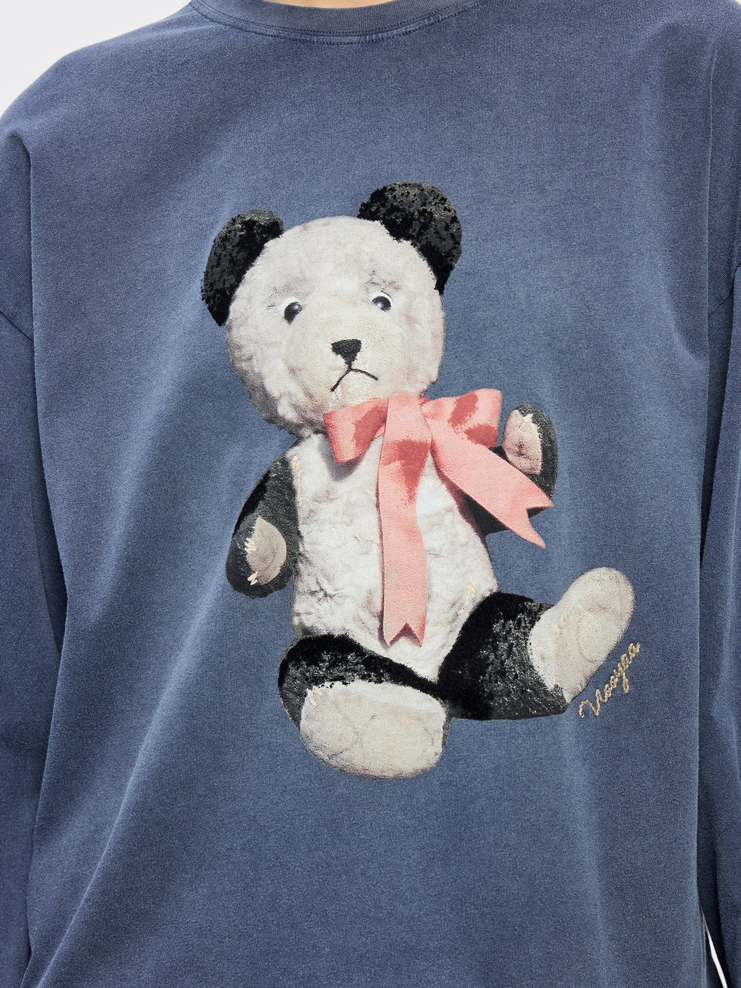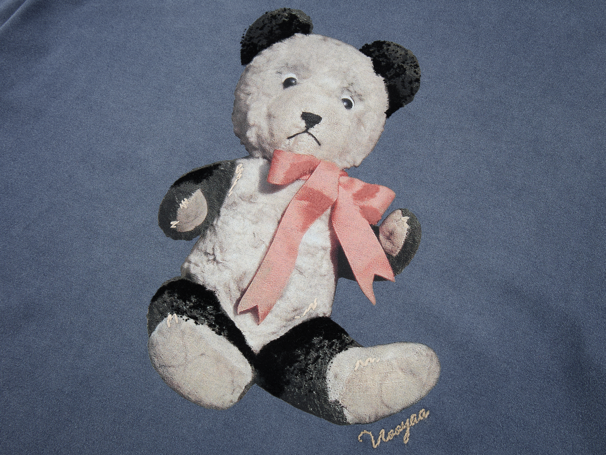 Old toy evoking childhood memories created with distressed flocking and mending stitches. Allover floral print conveys warm nostalgia.