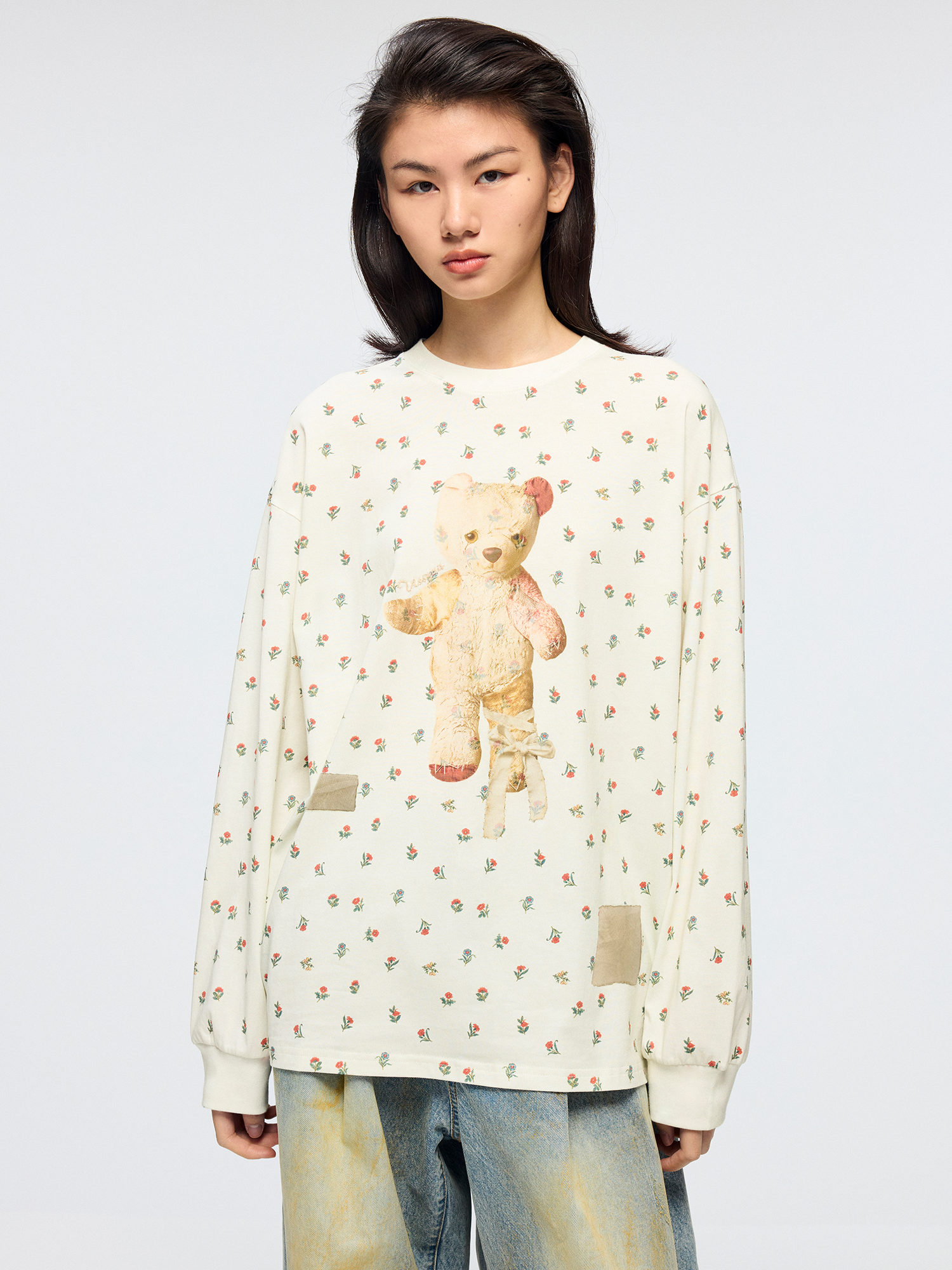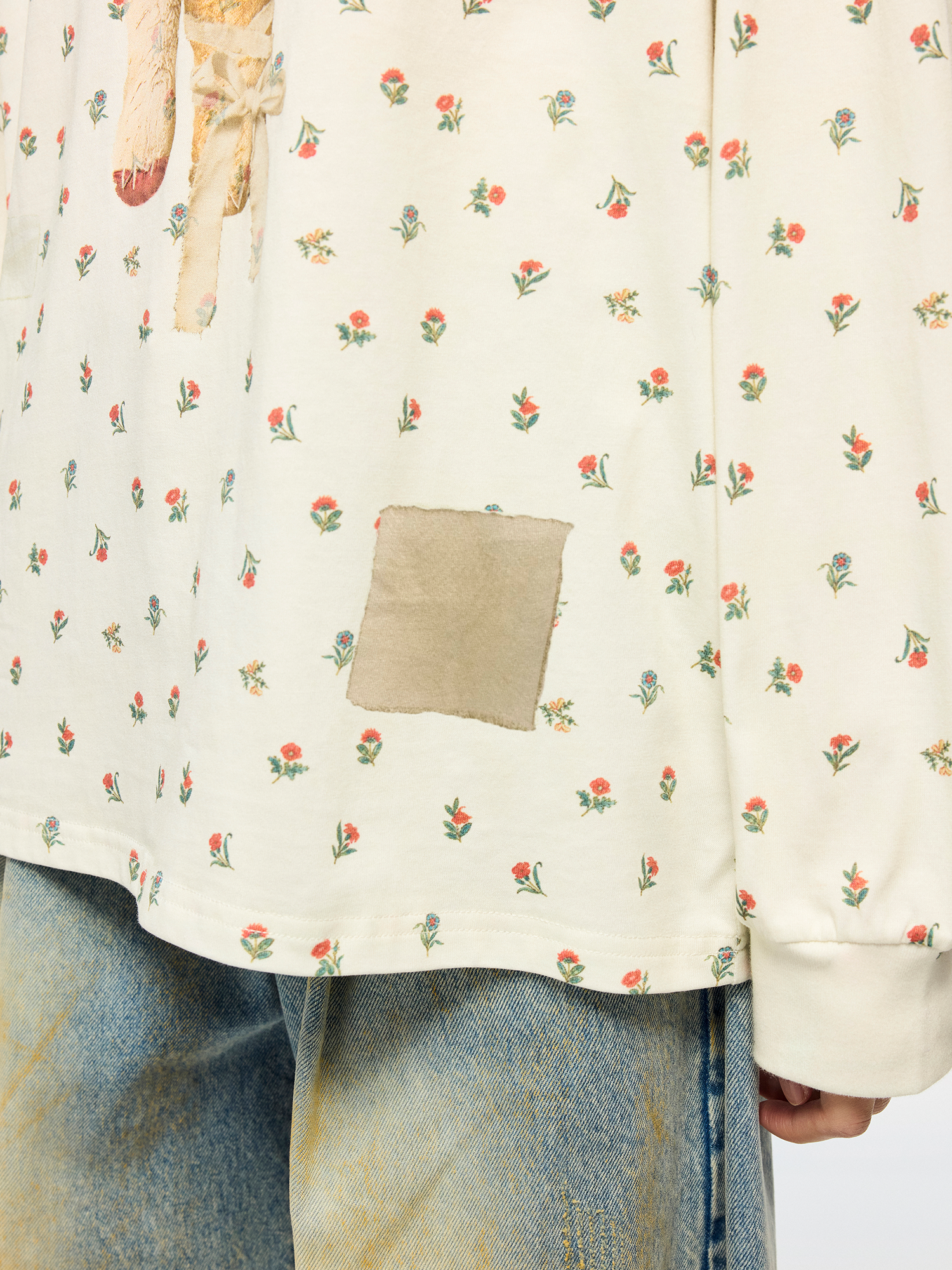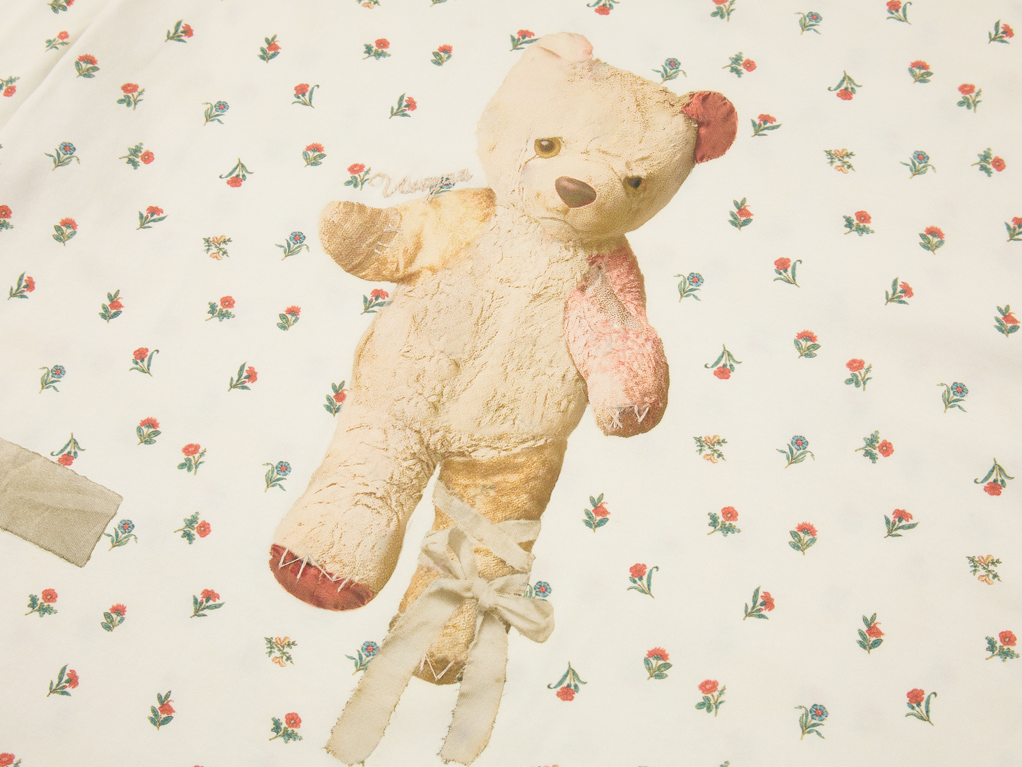 Old toy evoking childhood memories created with distressed flocking and mending stitches. Allover floral print conveys warm nostalgia.