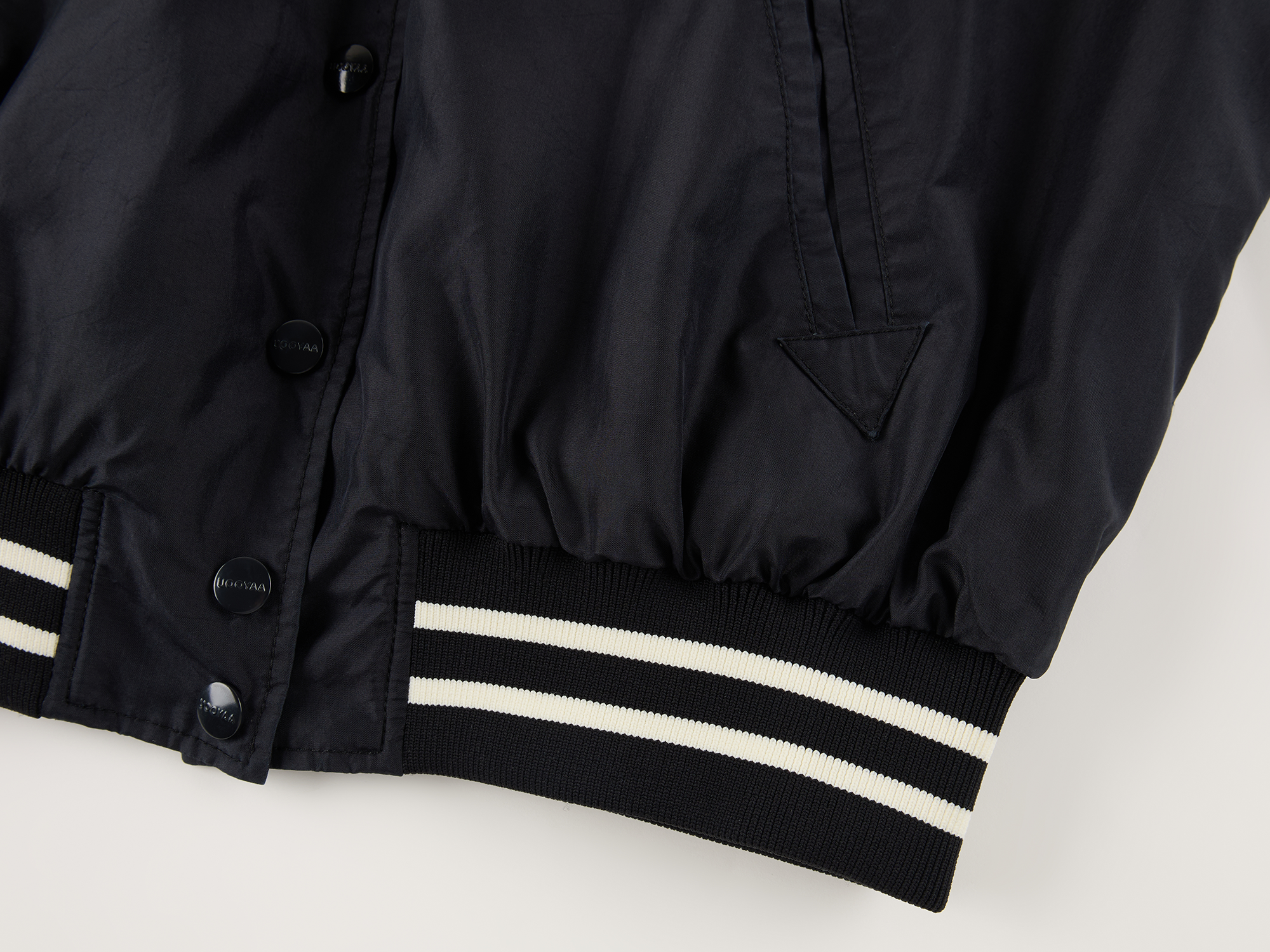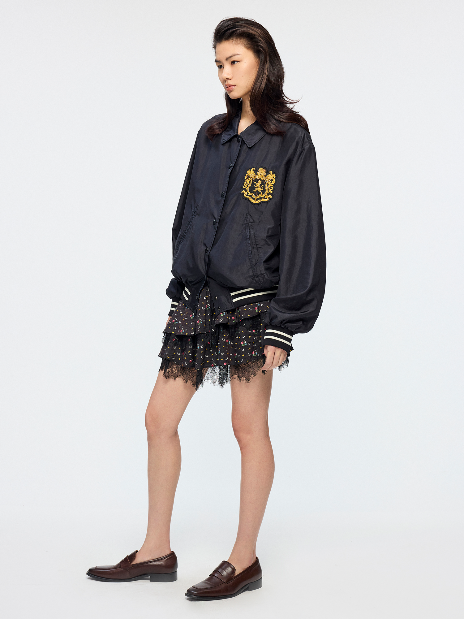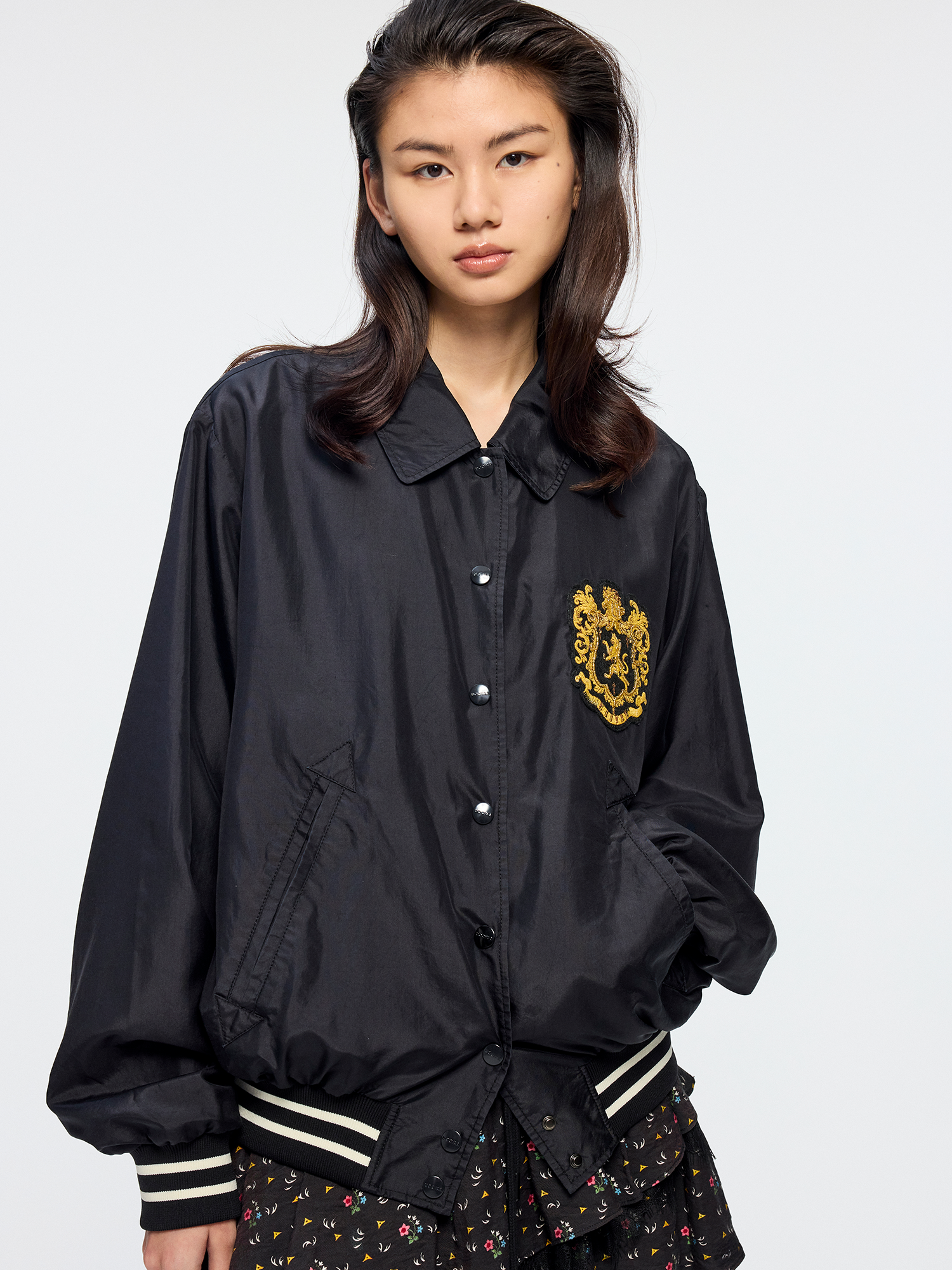 Classic varsity jacket crafted from silk taffeta features beaded embroidered badges for a luxurious texture.