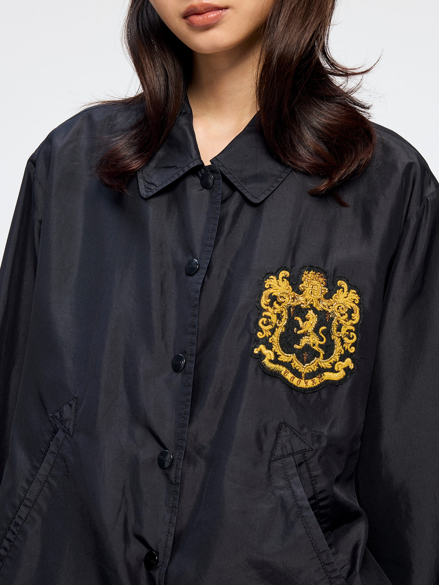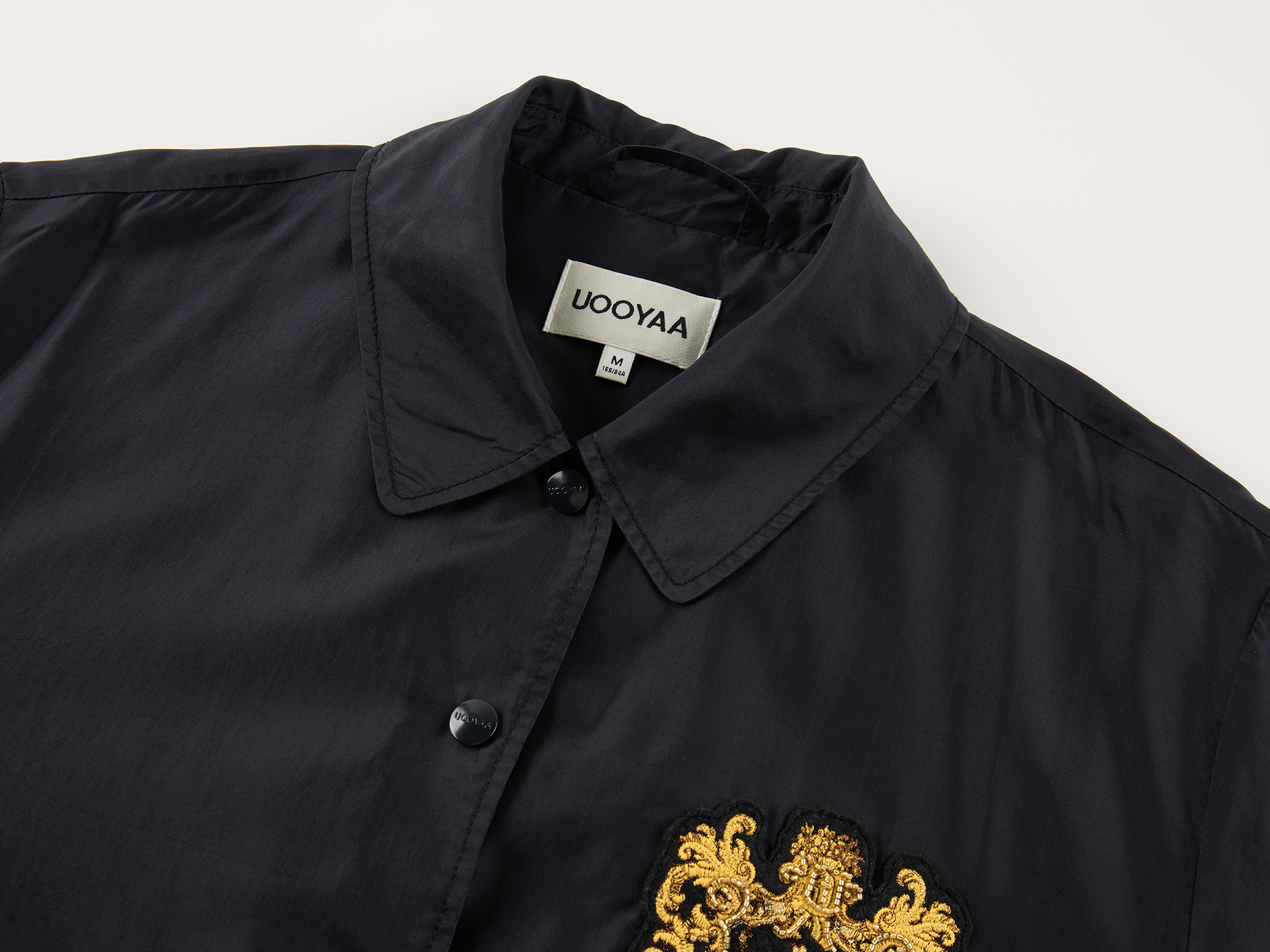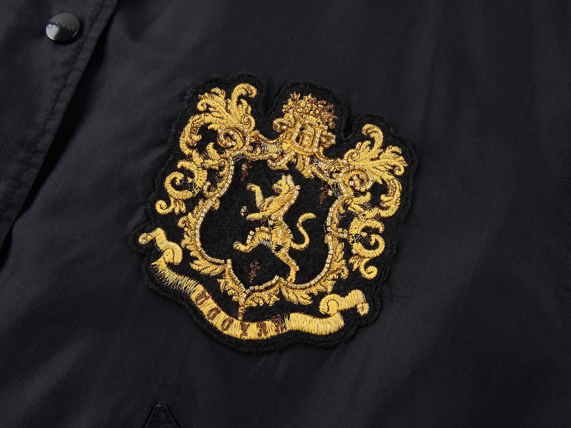 Classic varsity jacket crafted from silk taffeta features beaded embroidered badges for a luxurious texture.