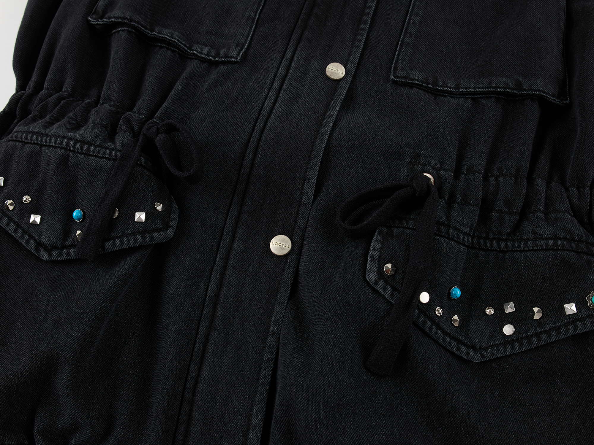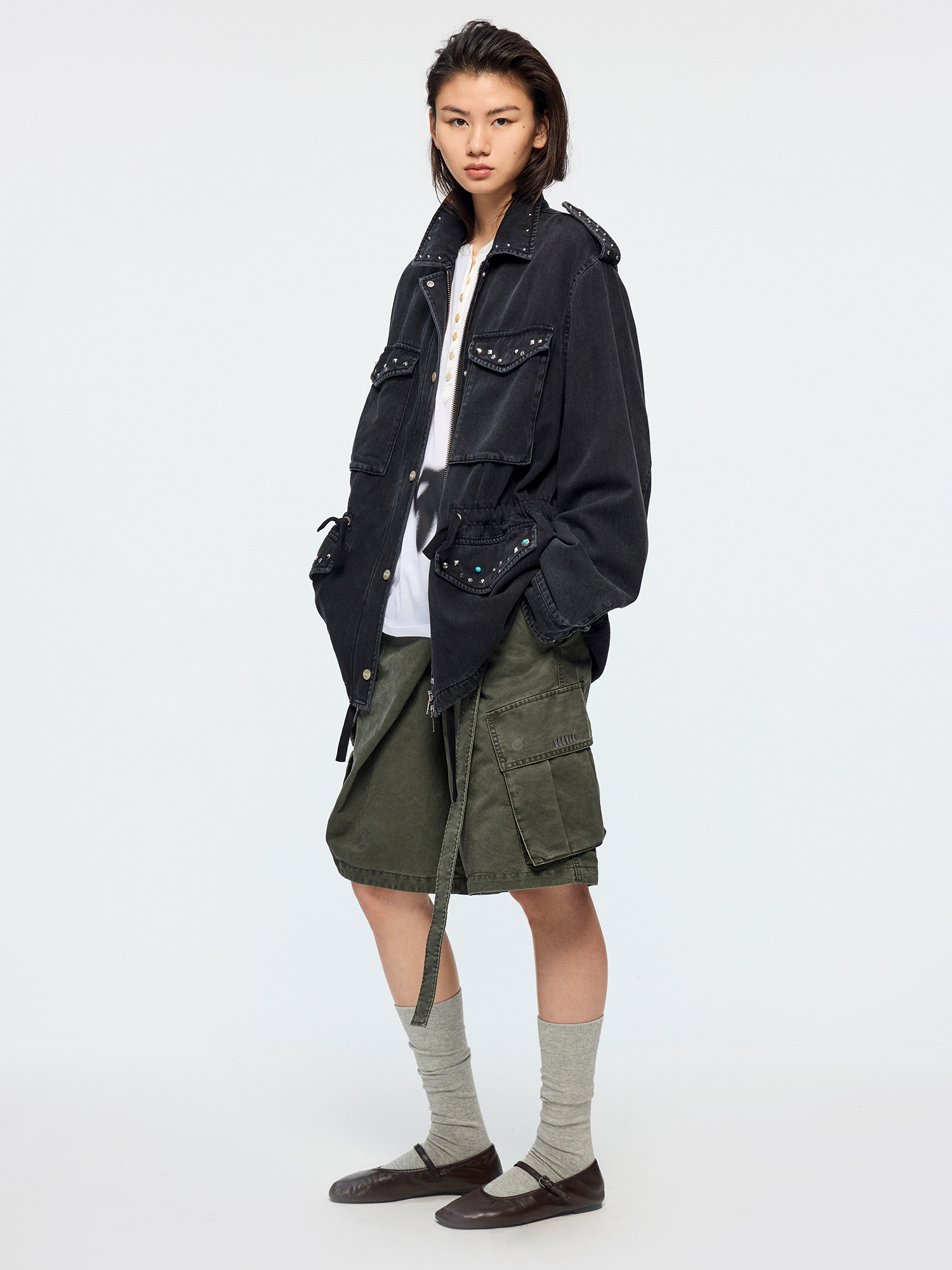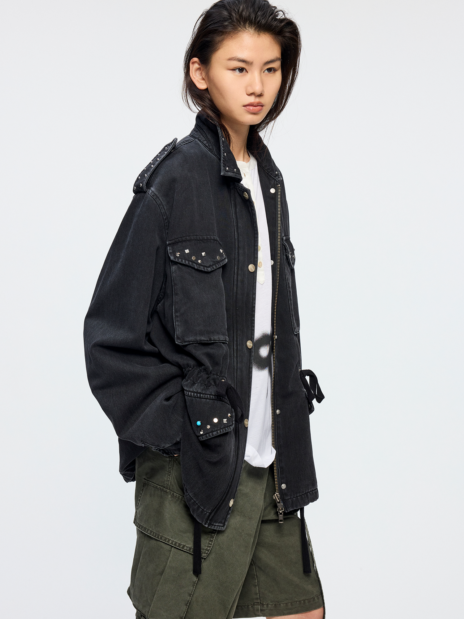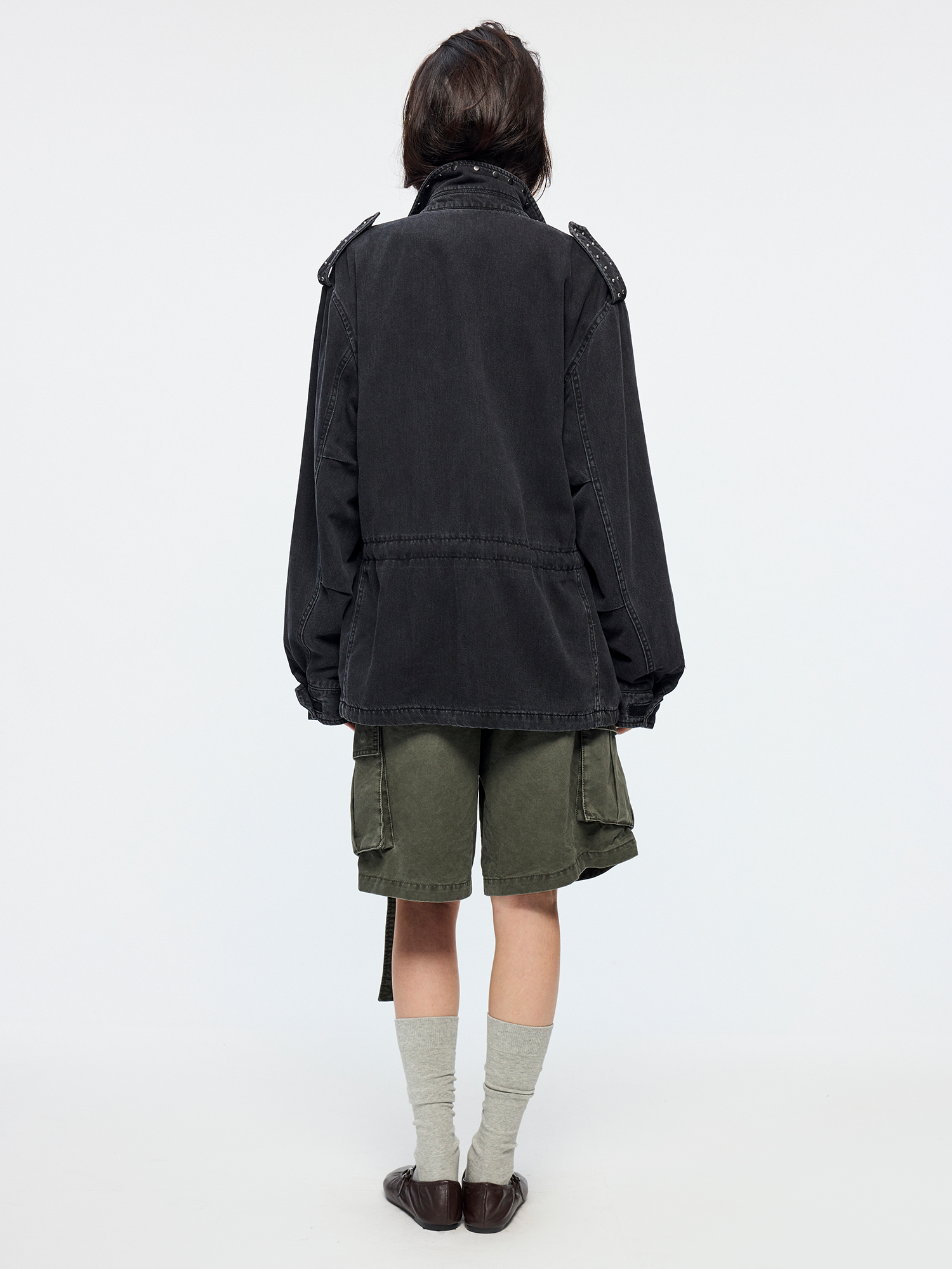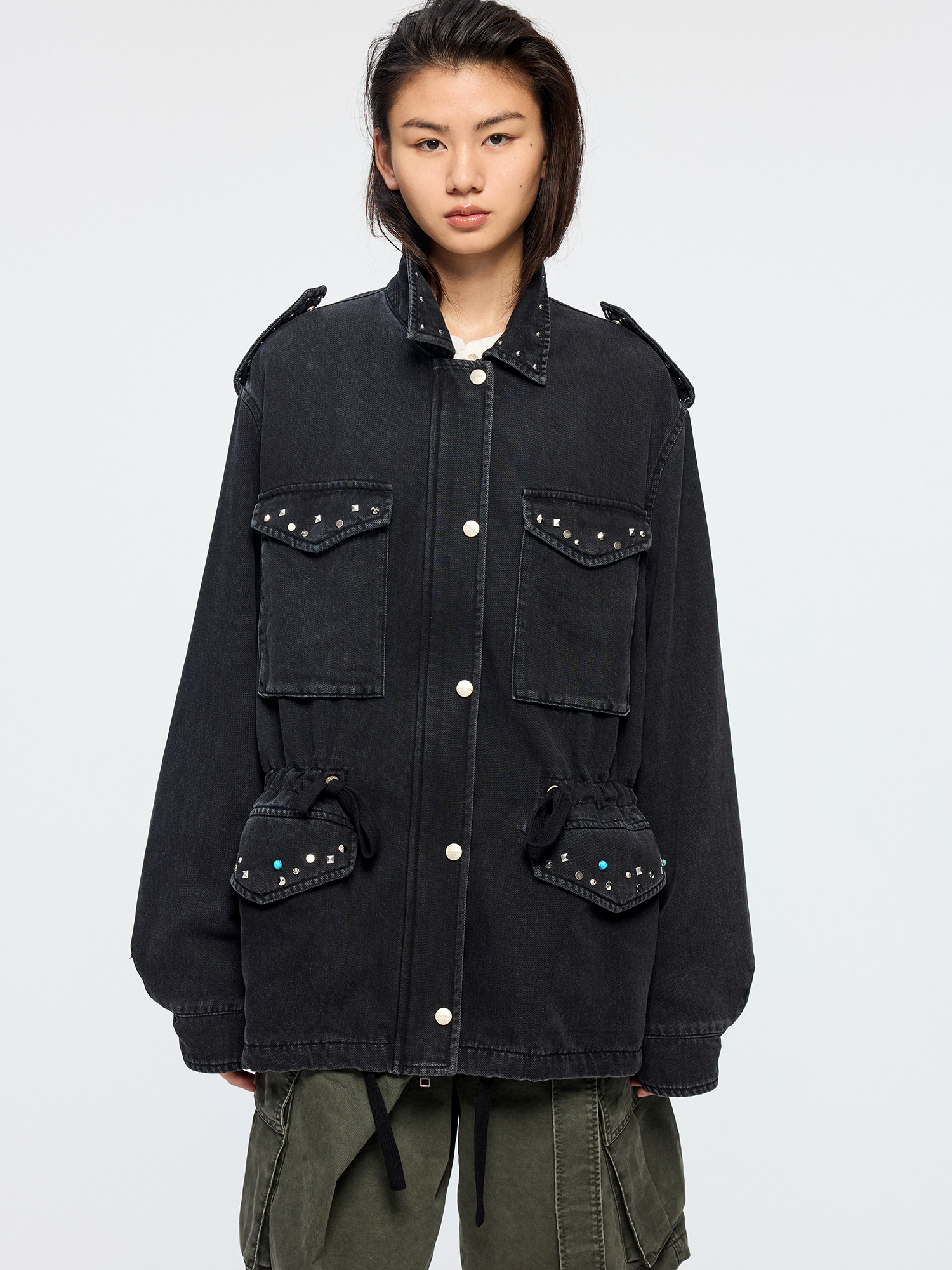 Classic M43 jacket features an adjustable waist drawstring. Irregularly shaped studs add a romantic, rebellious touch to the powerful silhouette.