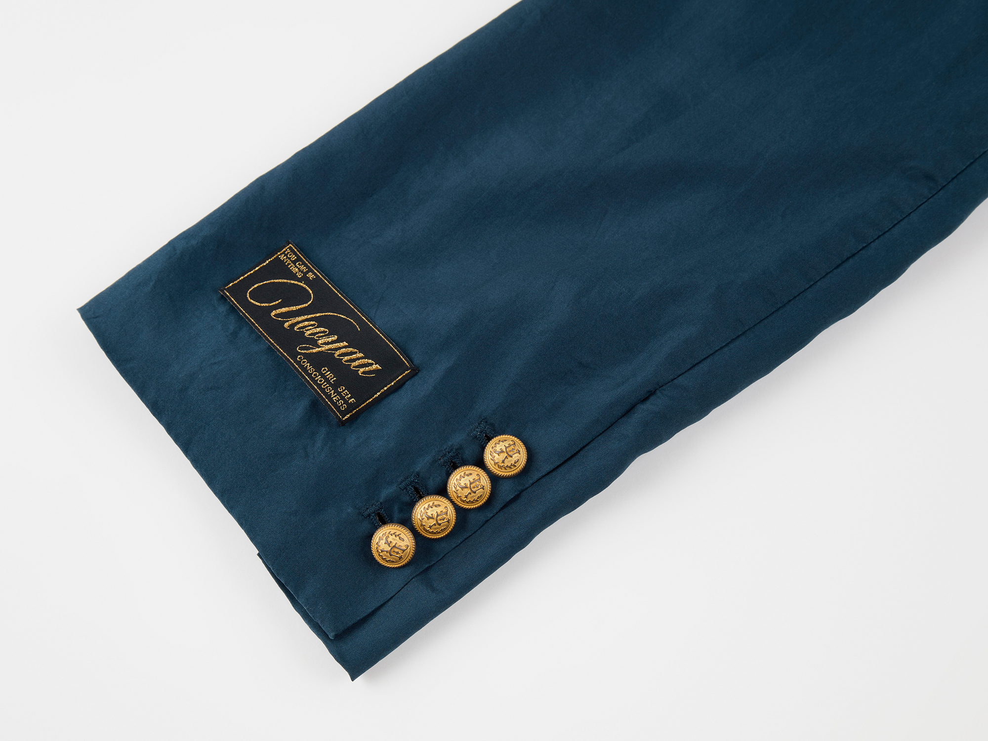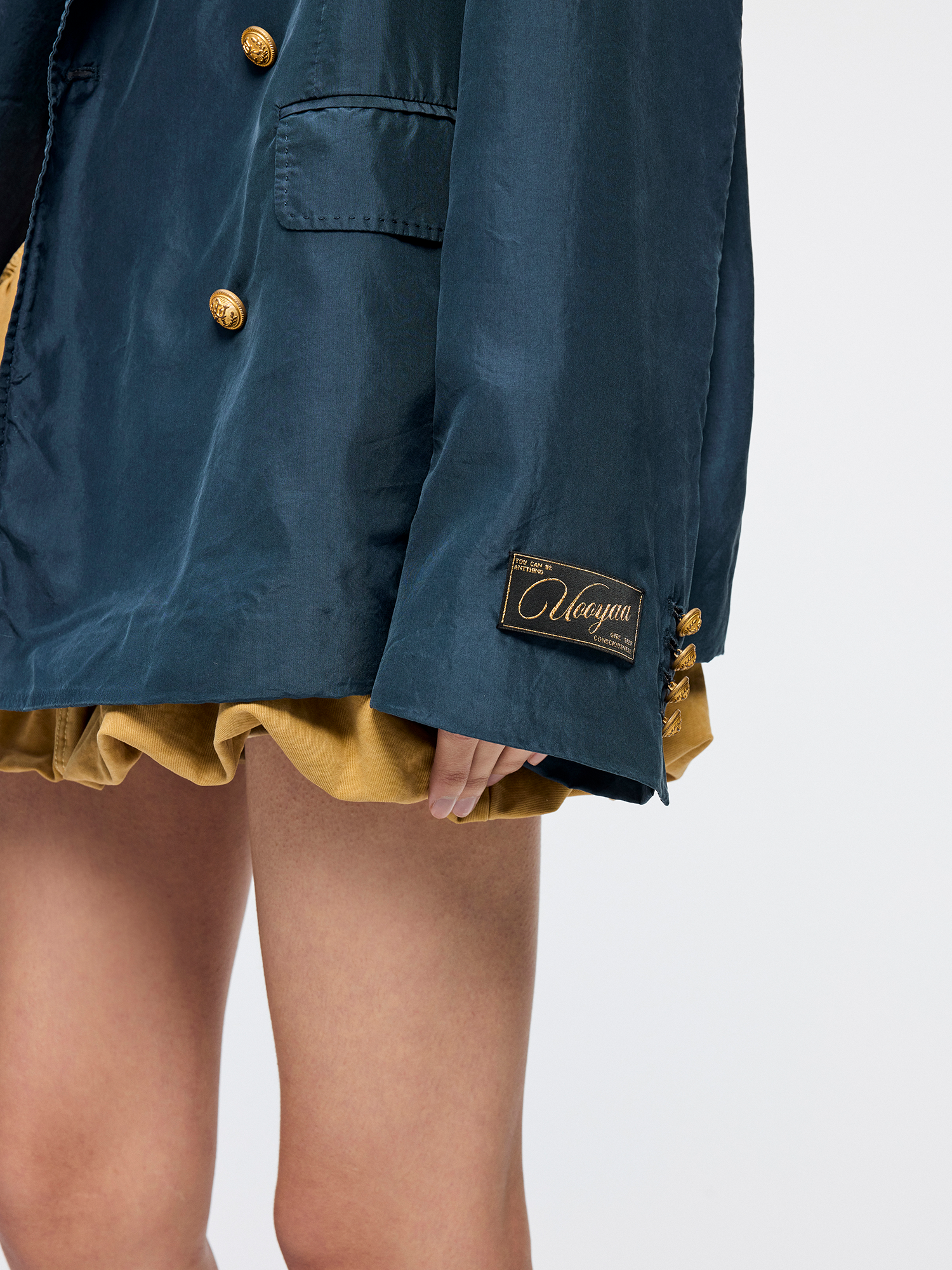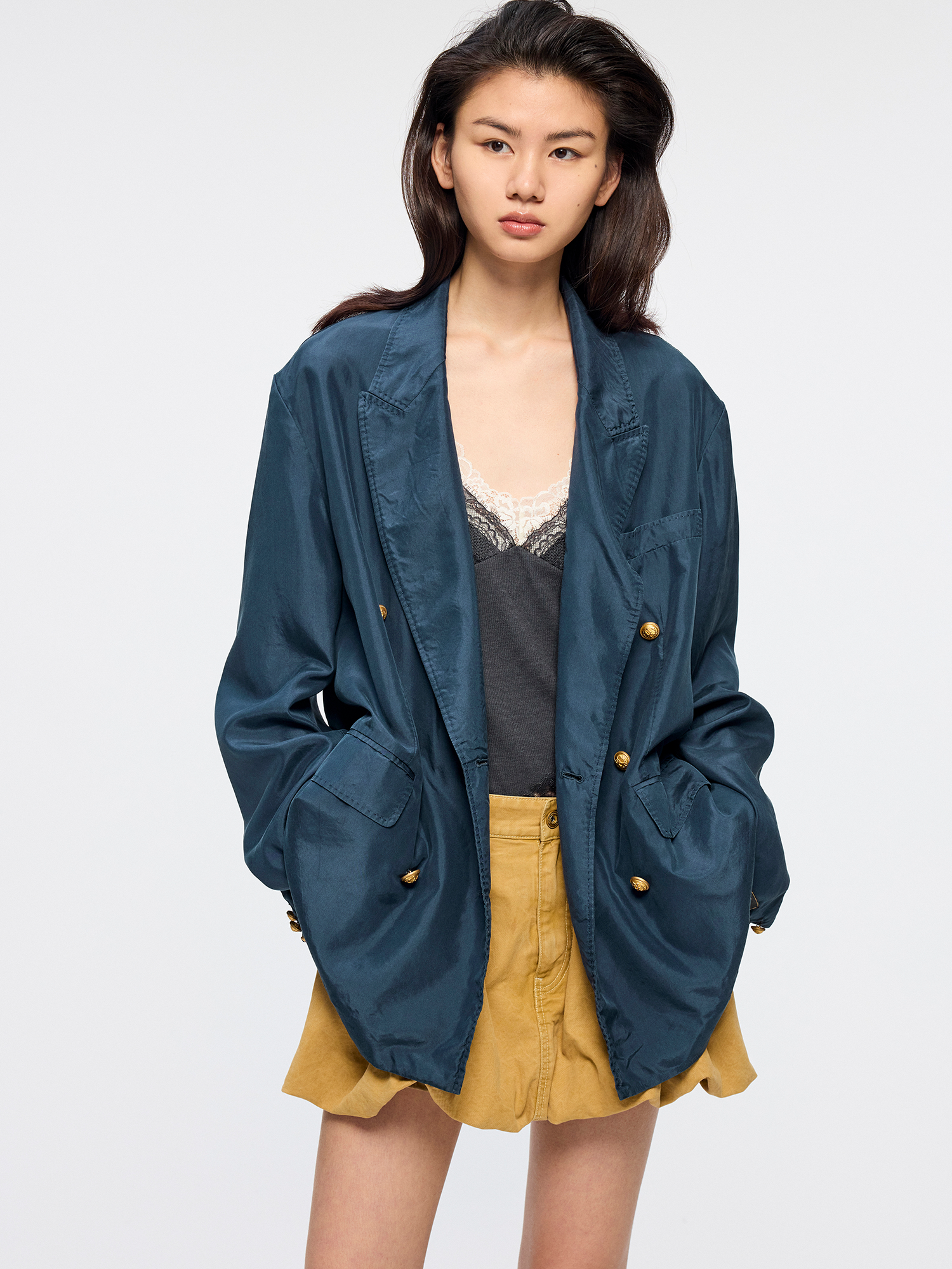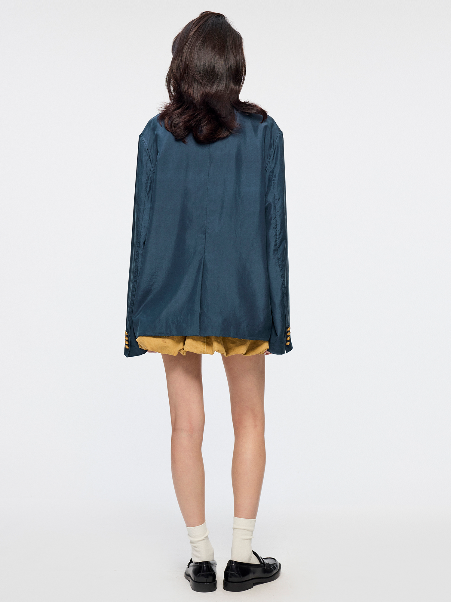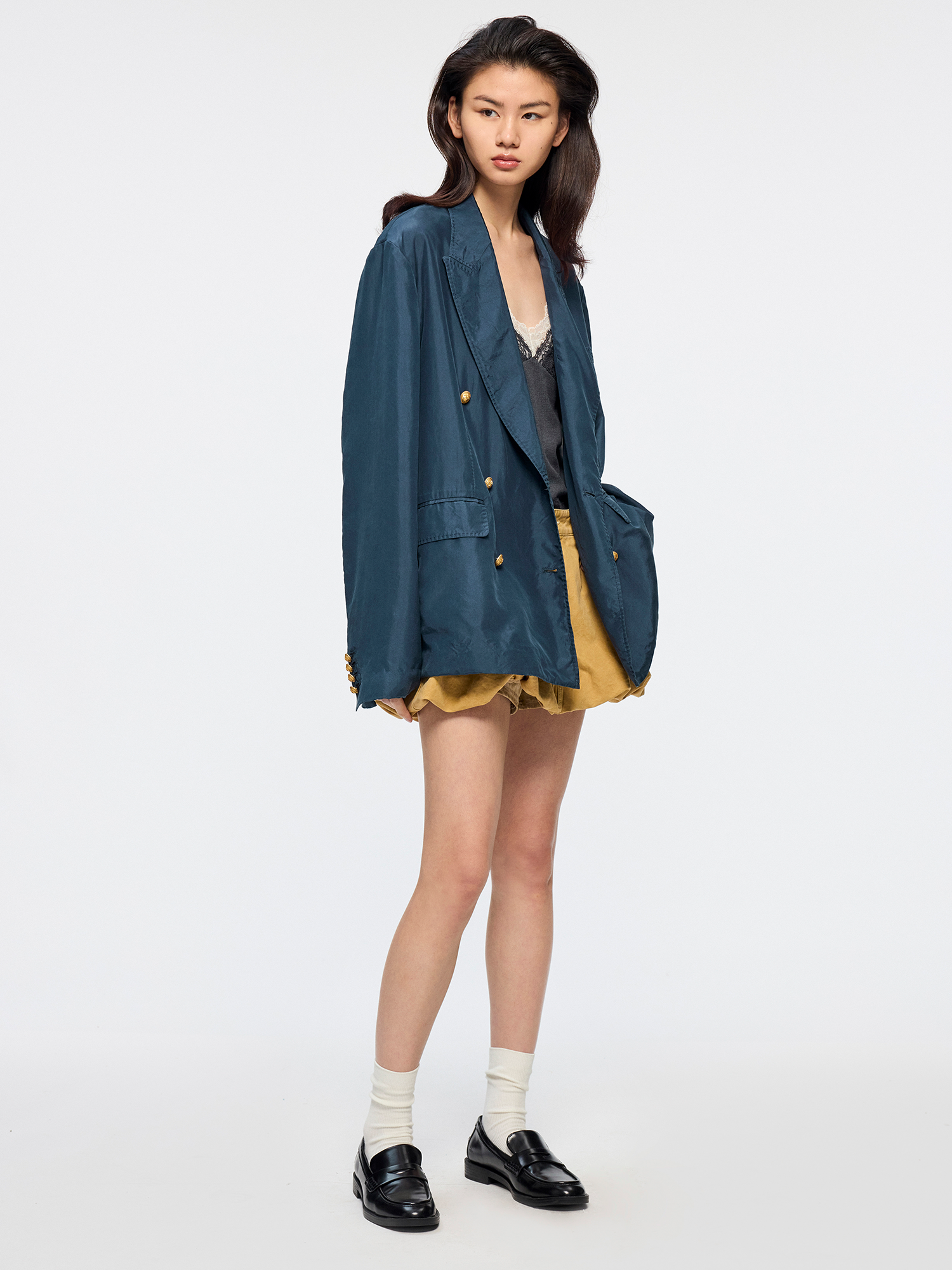 Silk taffeta creates a relaxed version of the classic peak lapel double-breasted blazer. Fine texture and soft luster convey luxury.