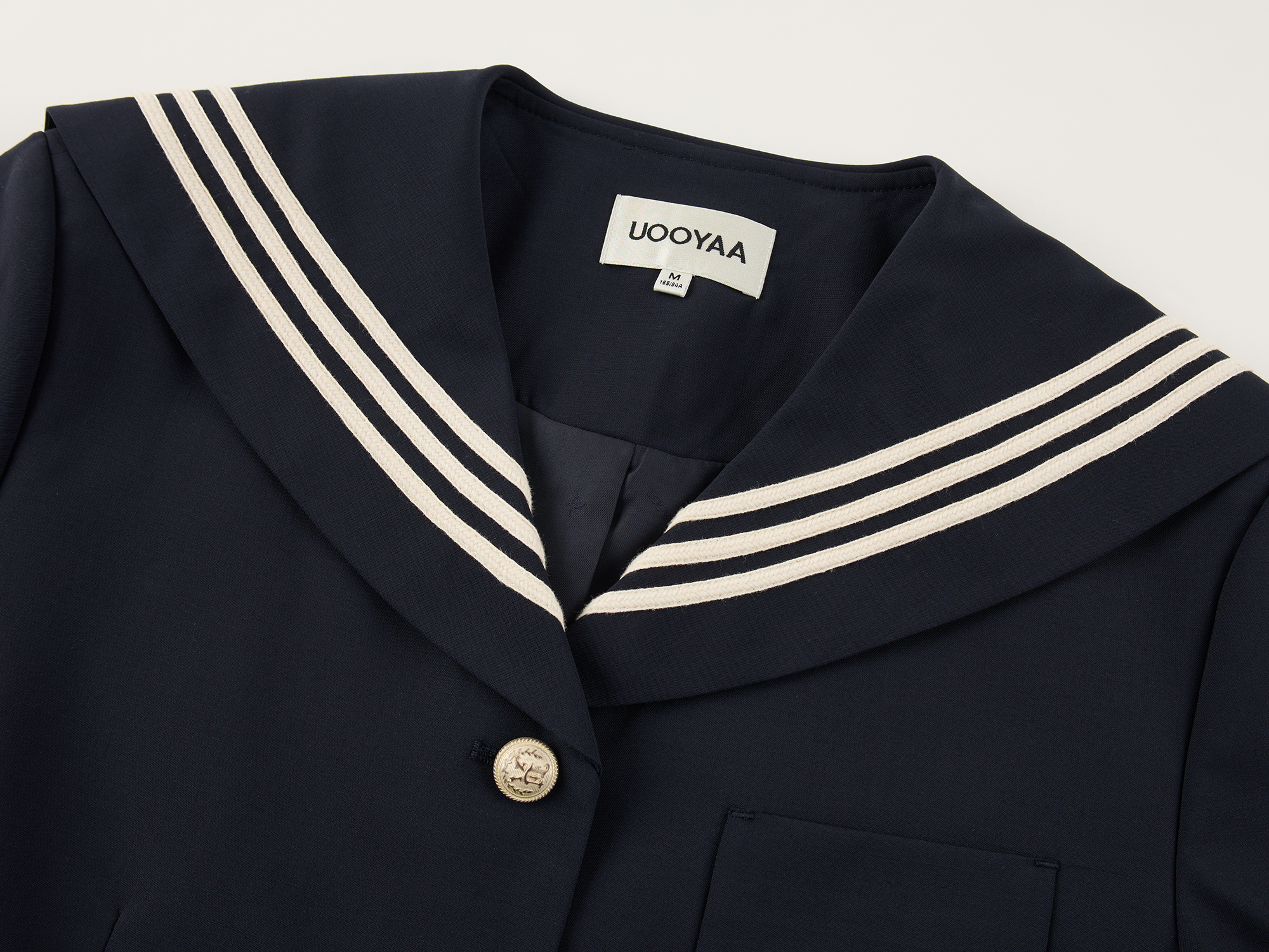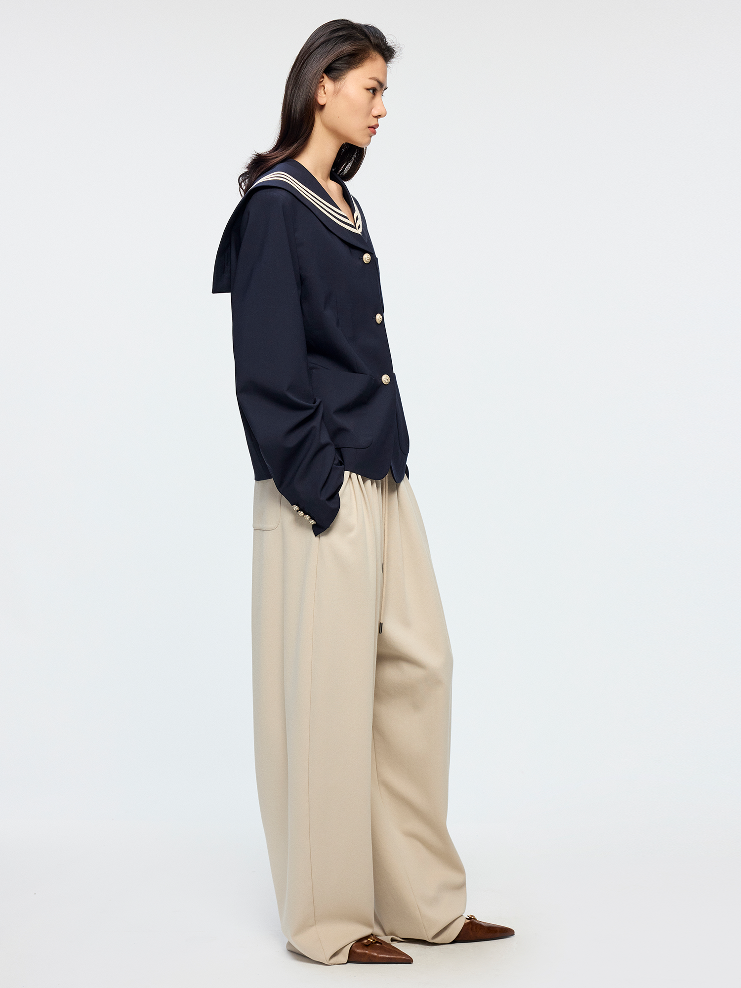 Classic sailor collar blazer features refined tape details and star embroidered badges. Cropped fit highlights youthful energy.