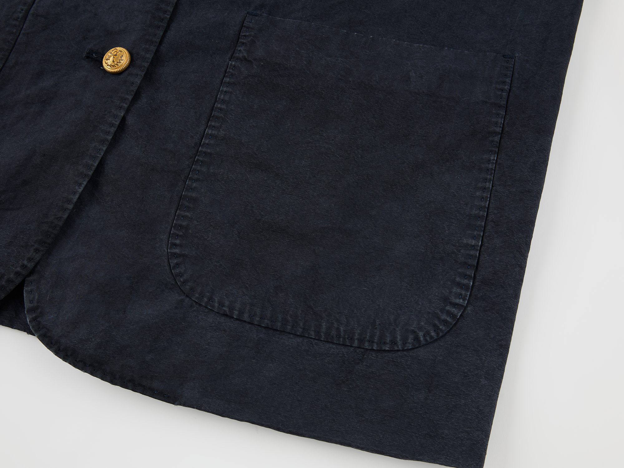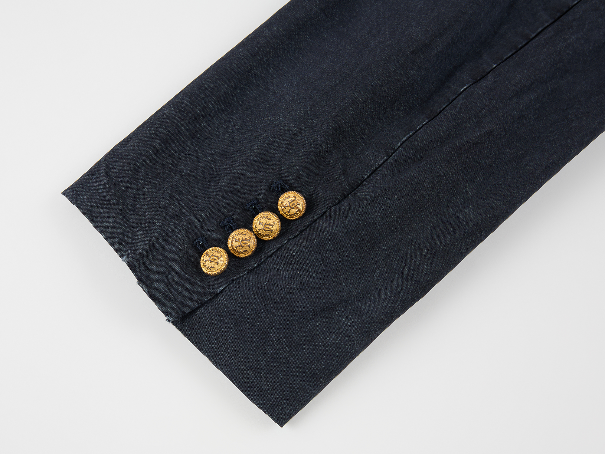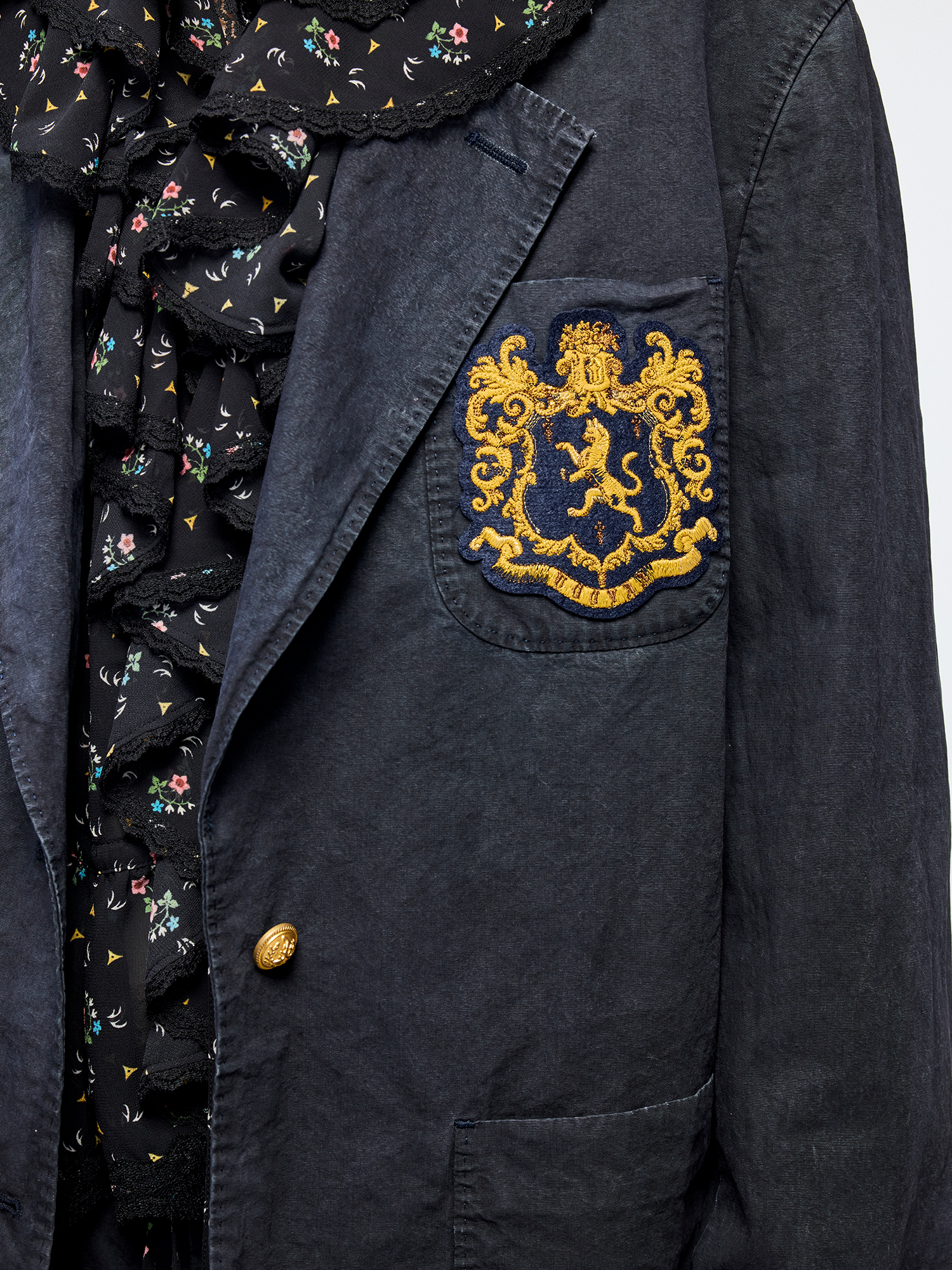 Classic collegiate blazer features a vintage badge and antique gold logo buttons. Overdyed vintage wash creates a casual, luxurious style.