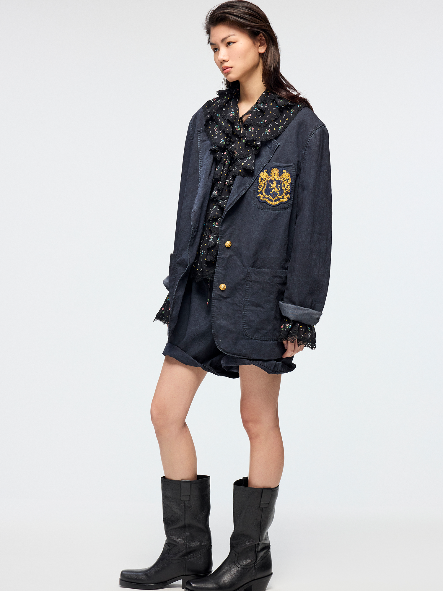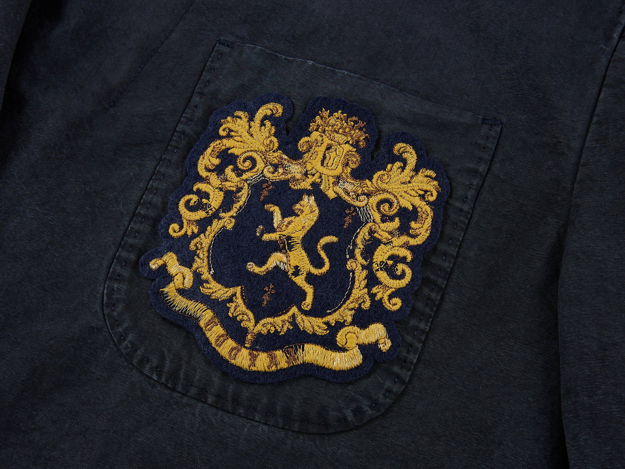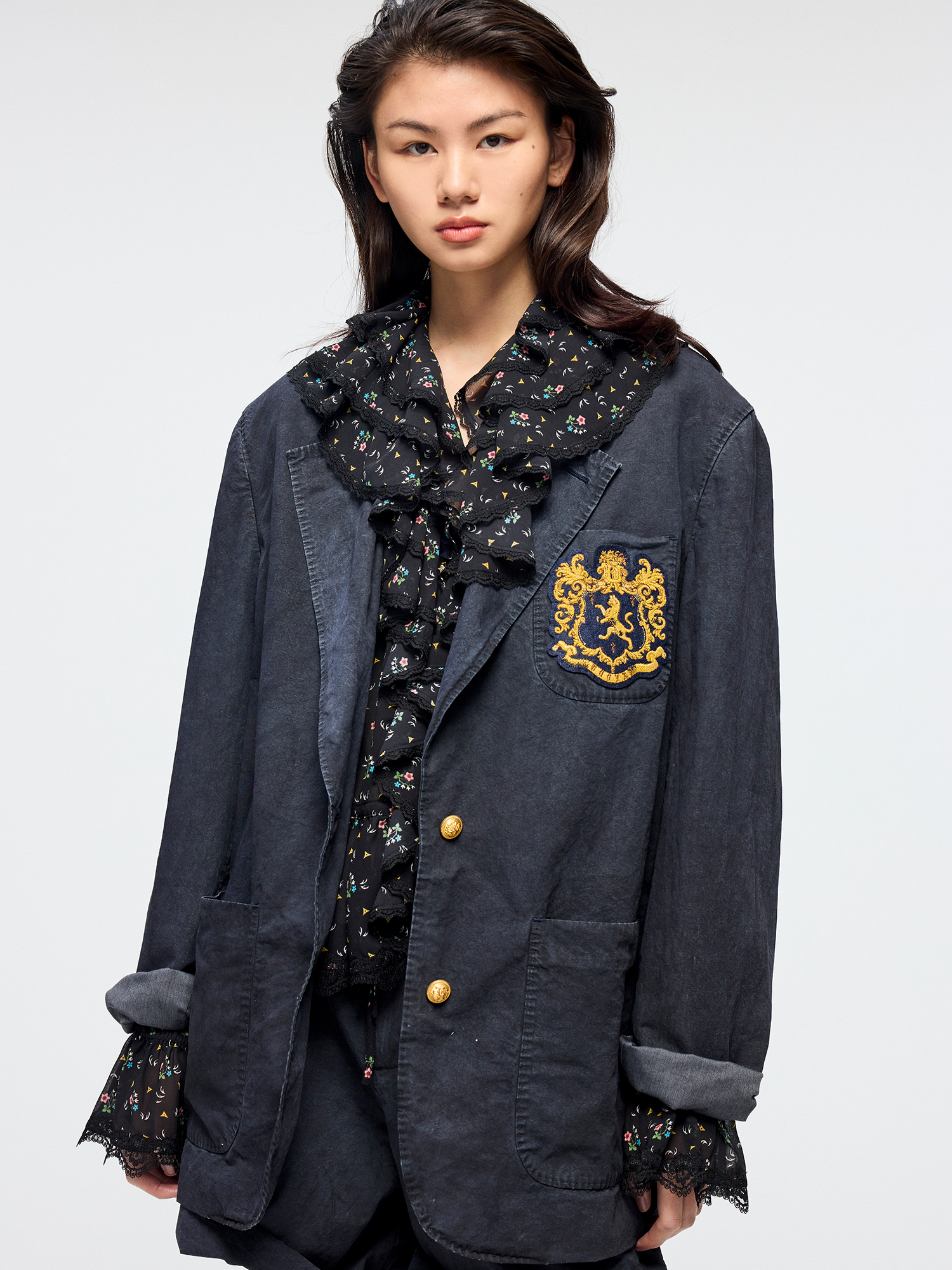 Classic collegiate blazer features a vintage badge and antique gold logo buttons. Overdyed vintage wash creates a casual, luxurious style.