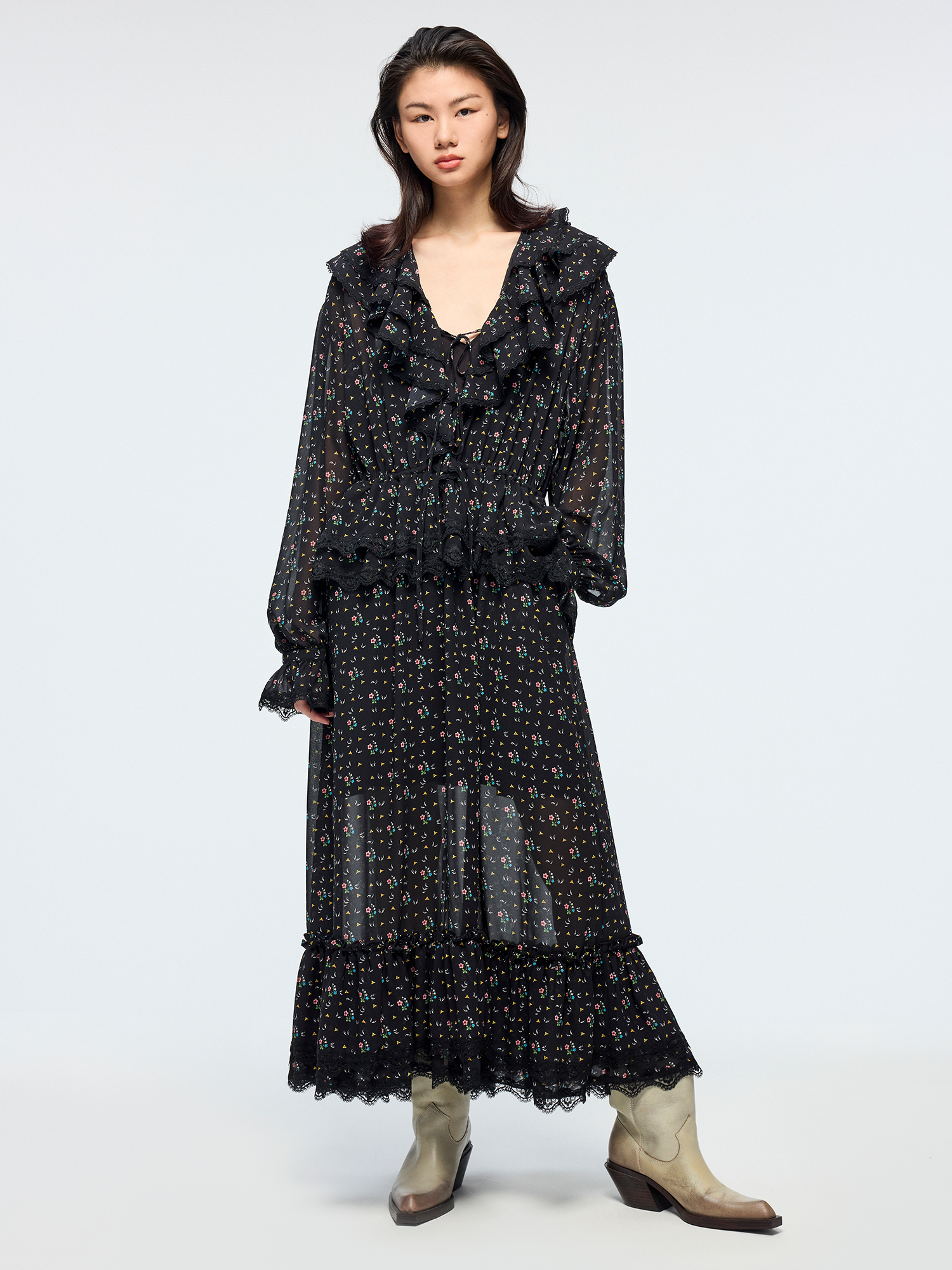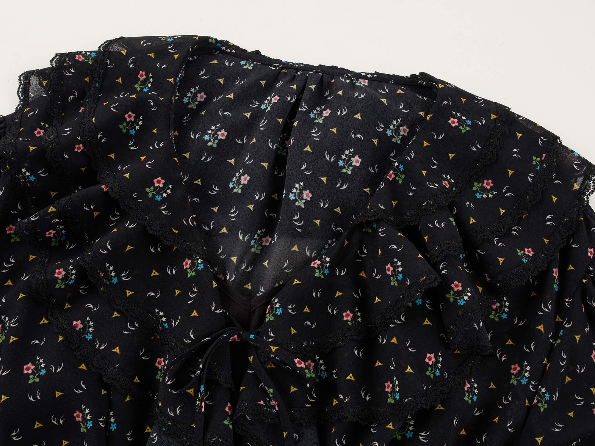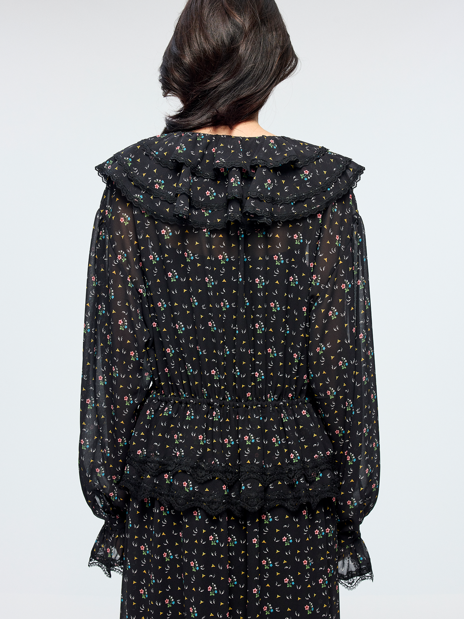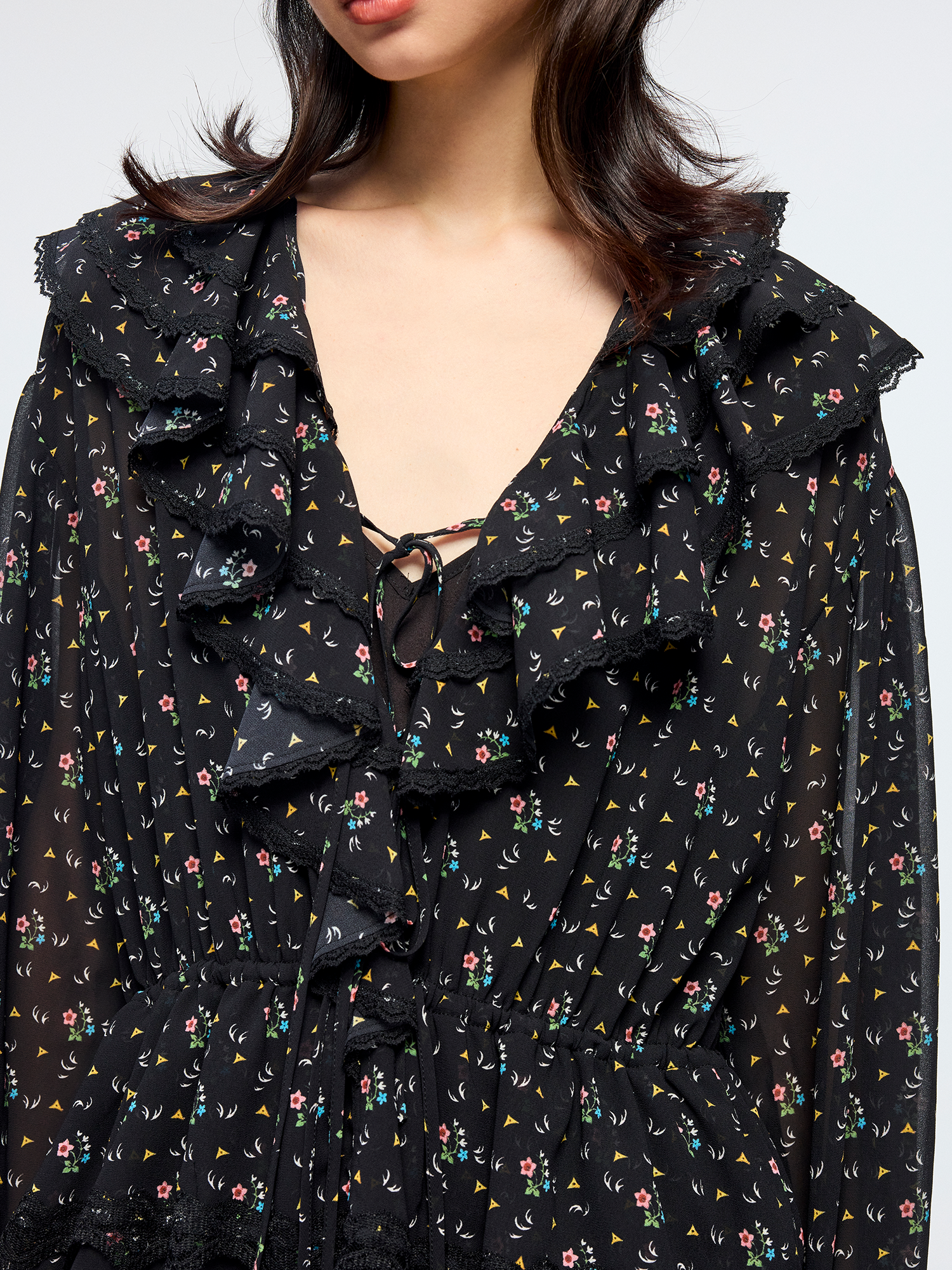 Lightweight chiffon with tiered ruffles and a tie-neck design adds movement. Small floral print creates a romantic, playful look.
