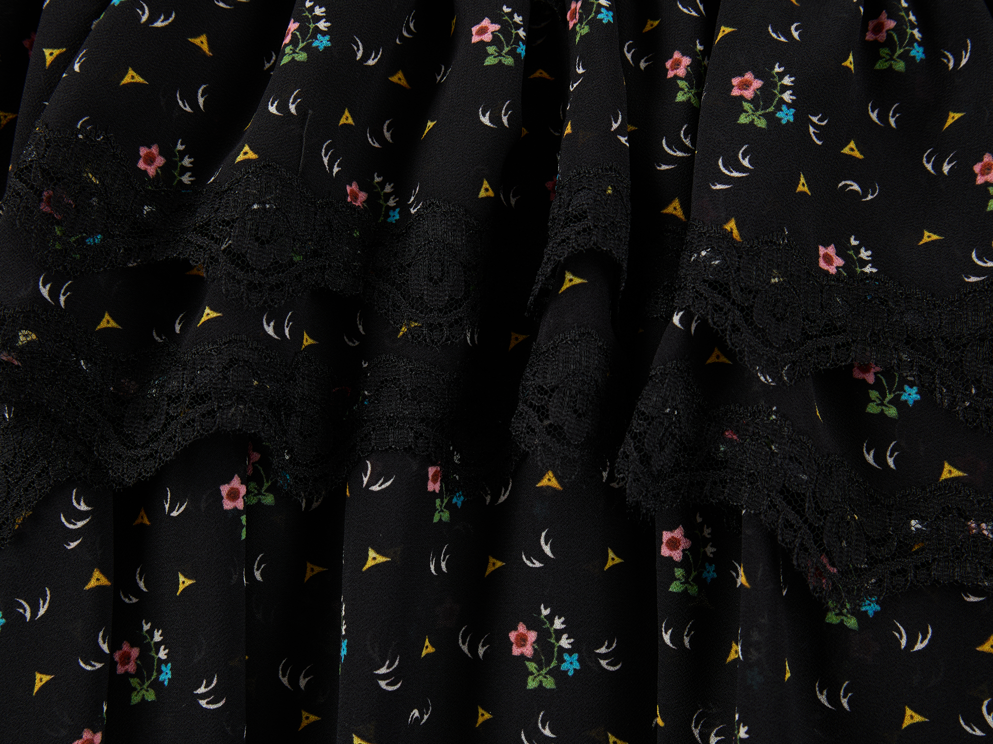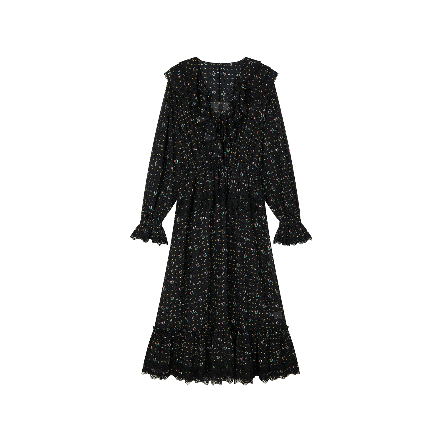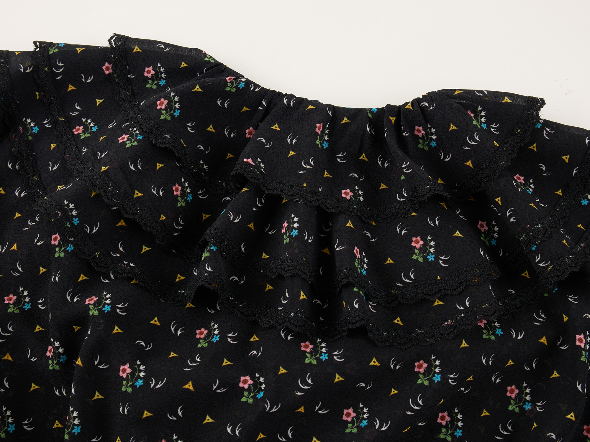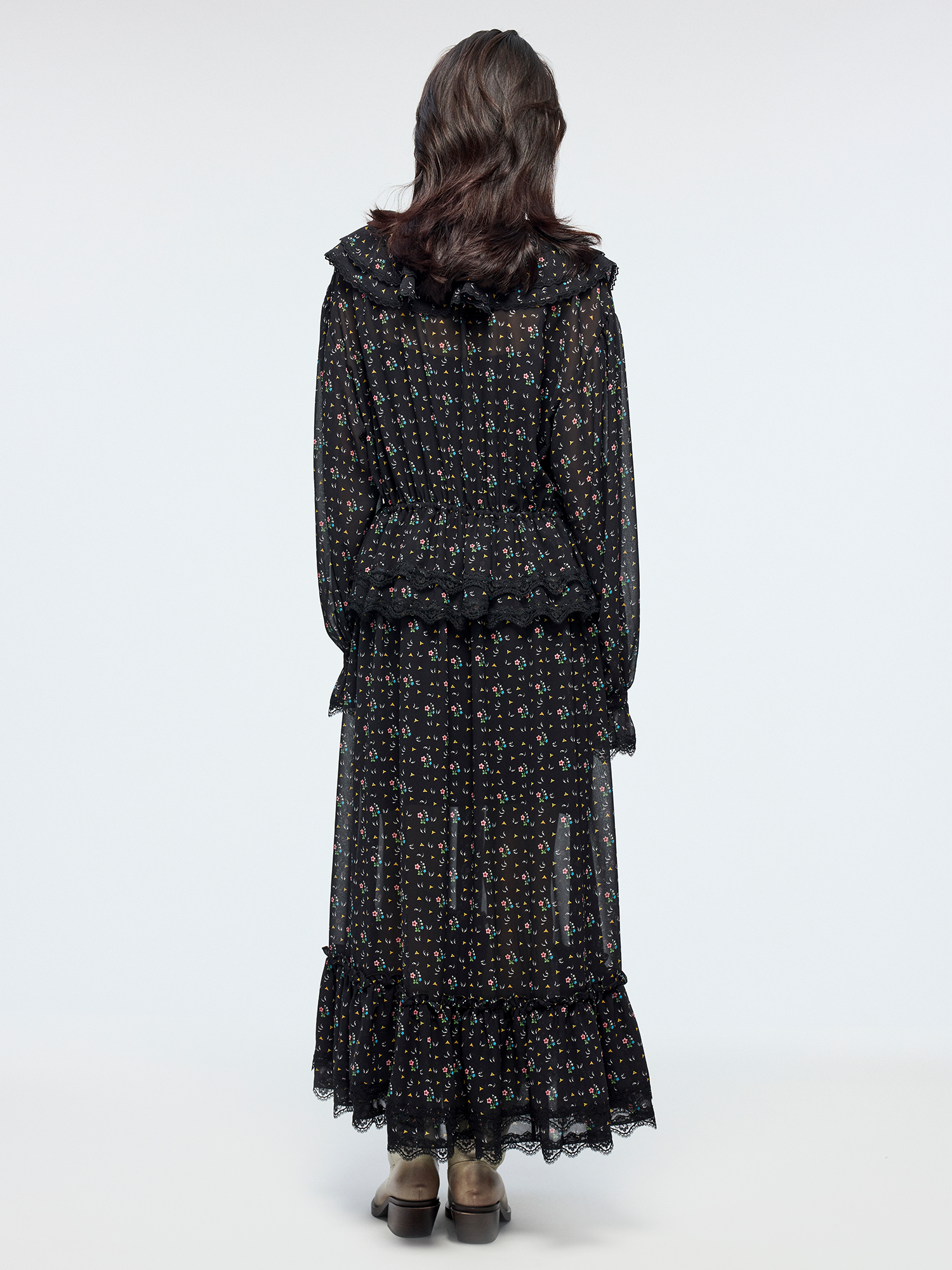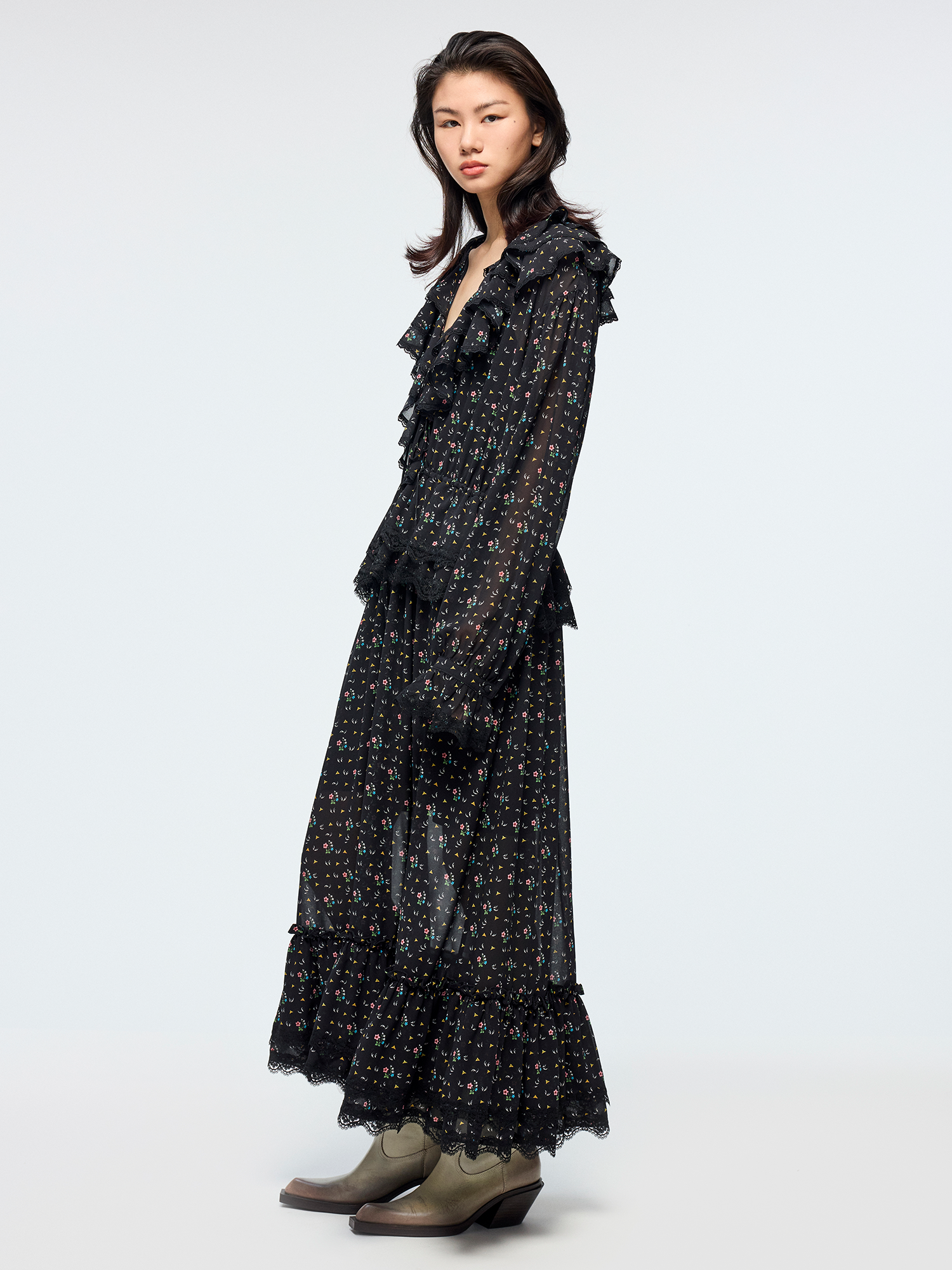 Lightweight chiffon with tiered ruffles and a tie-neck design adds movement. Small floral print creates a romantic, playful look.