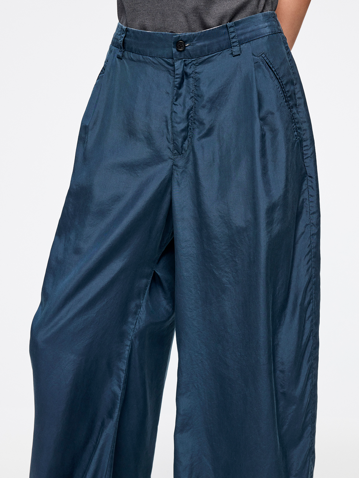Silk taffeta curved-leg trousers offer fine texture and comfort. Soft luster adds a luxurious atmosphere for instant relaxation.