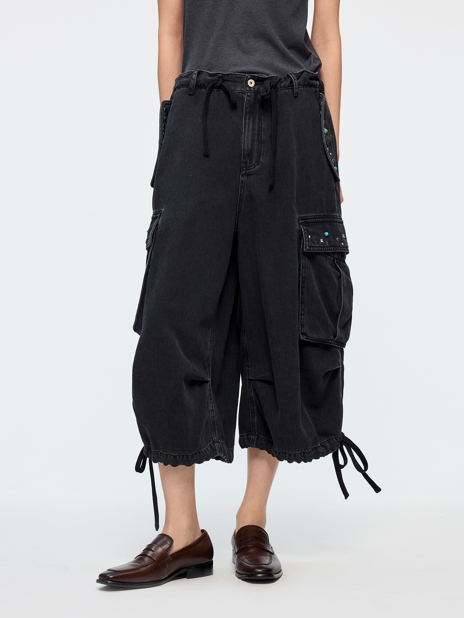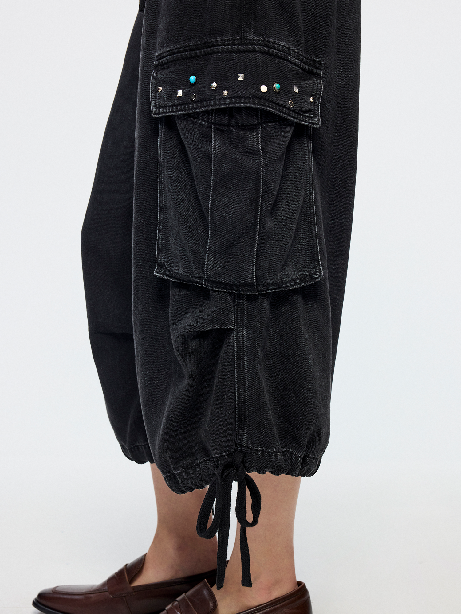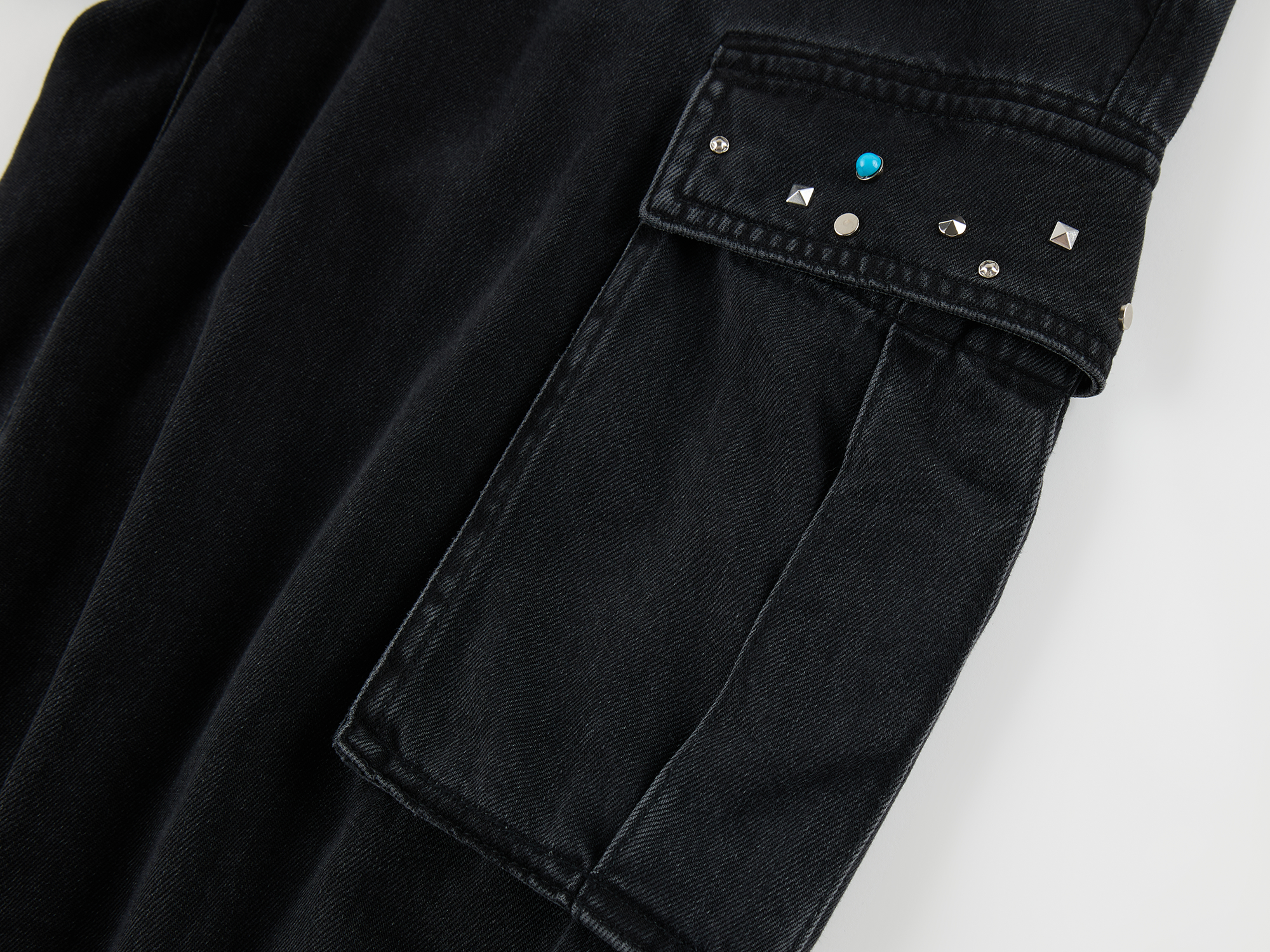 Classic cropped cargo pants feature irregularly shaped studs, adding a romantic, rebellious touch to the utilitarian style.