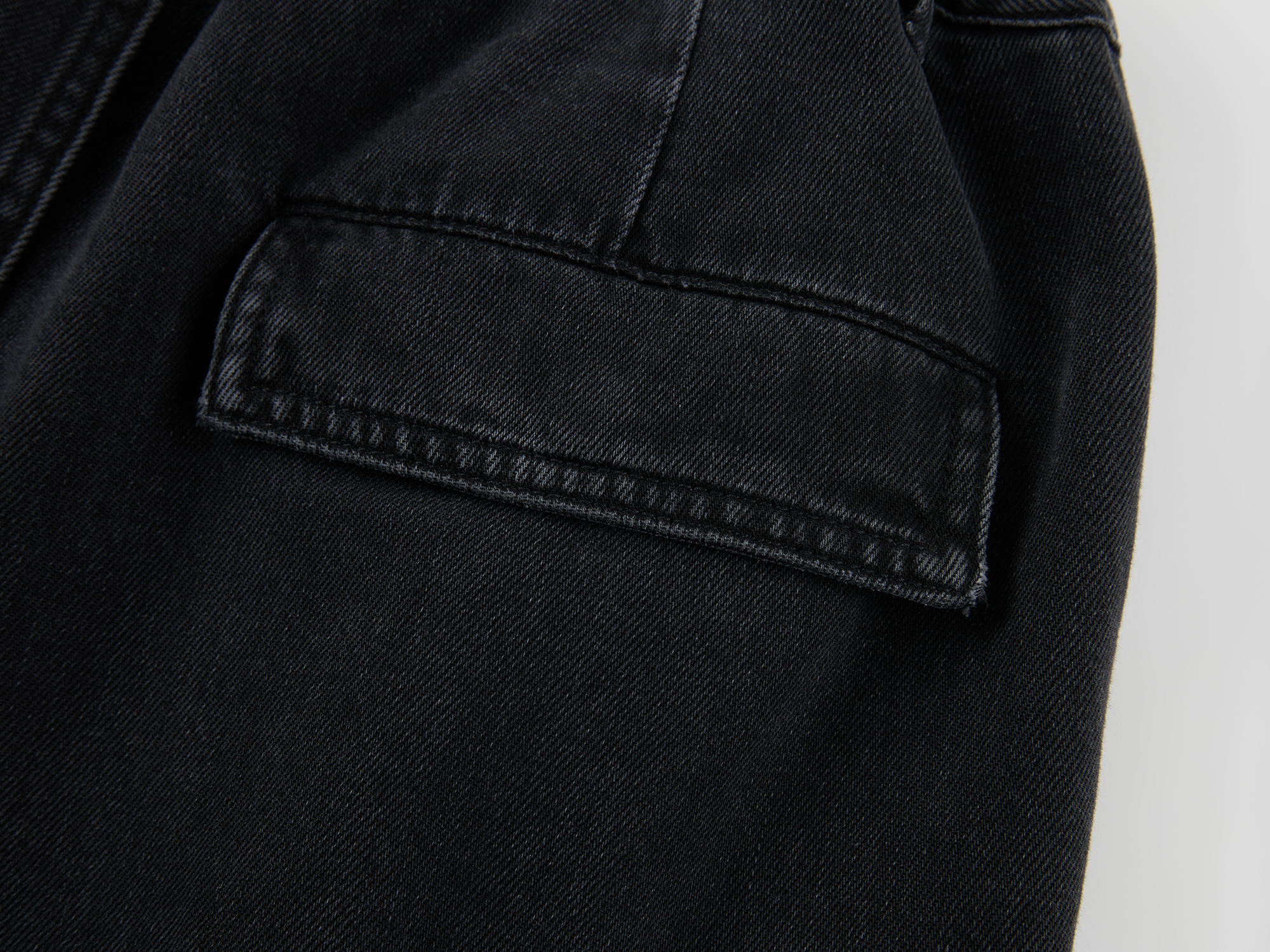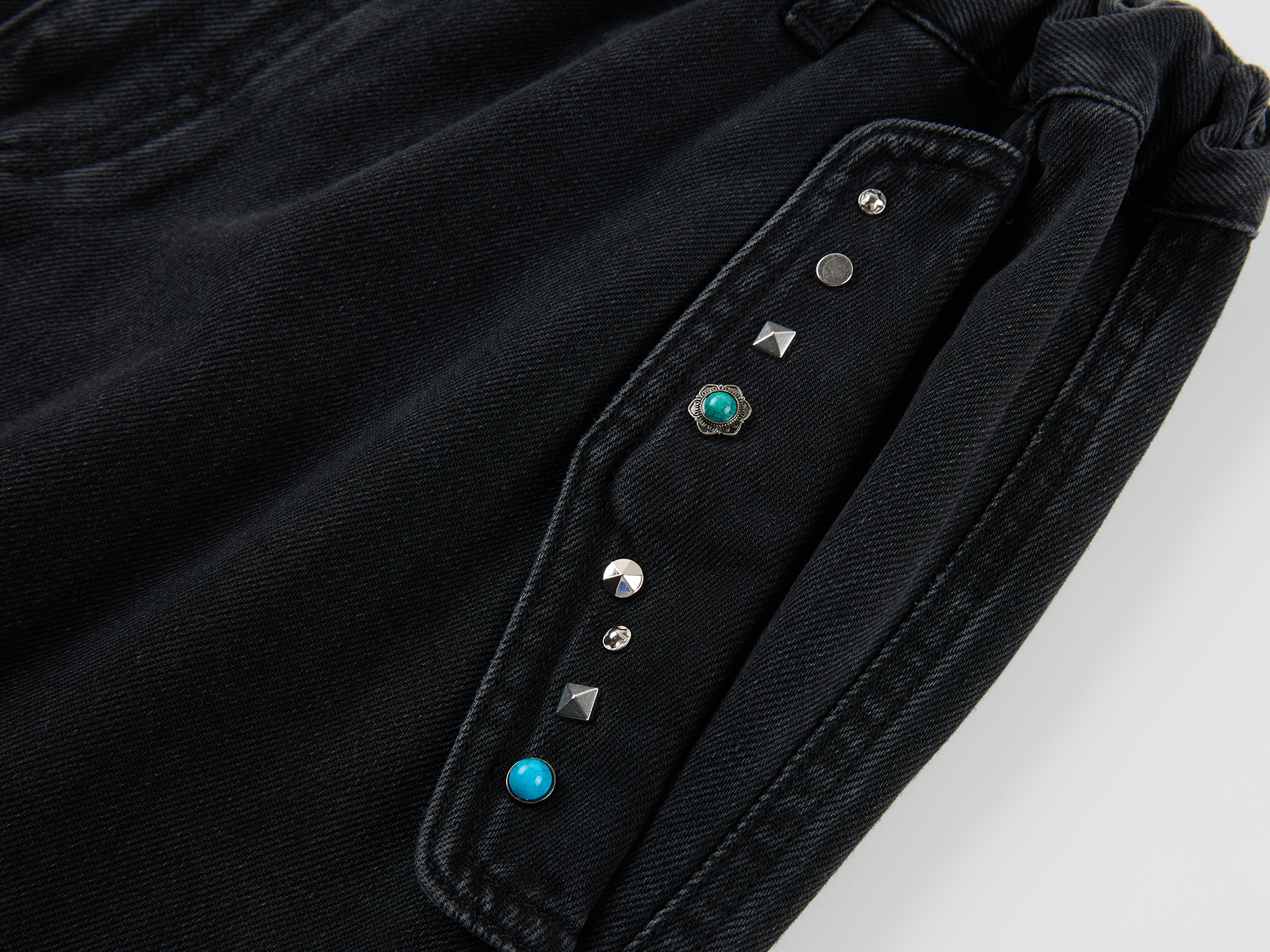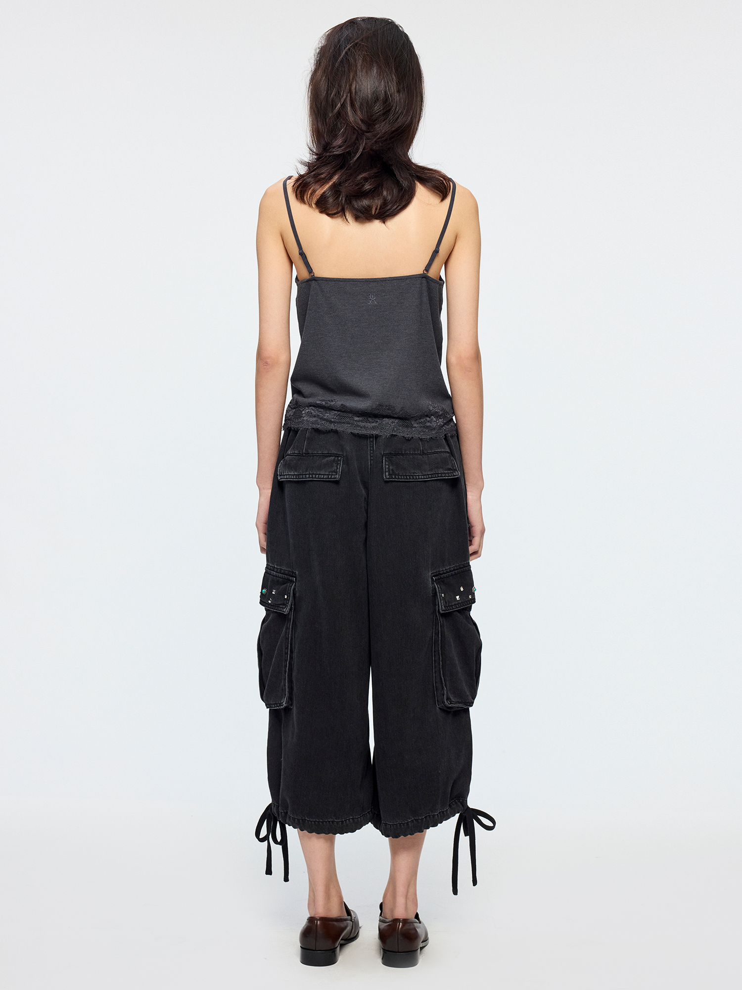 Classic cropped cargo pants feature irregularly shaped studs, adding a romantic, rebellious touch to the utilitarian style.