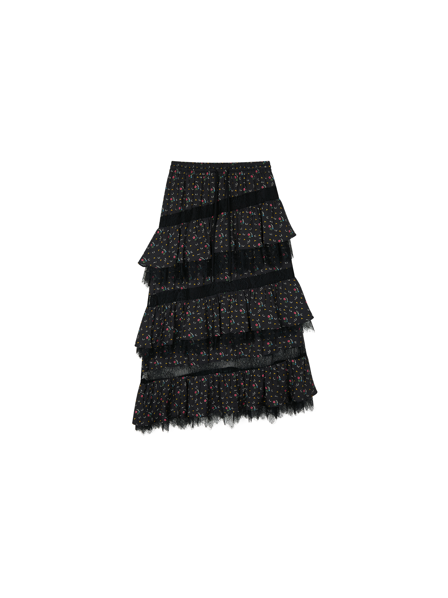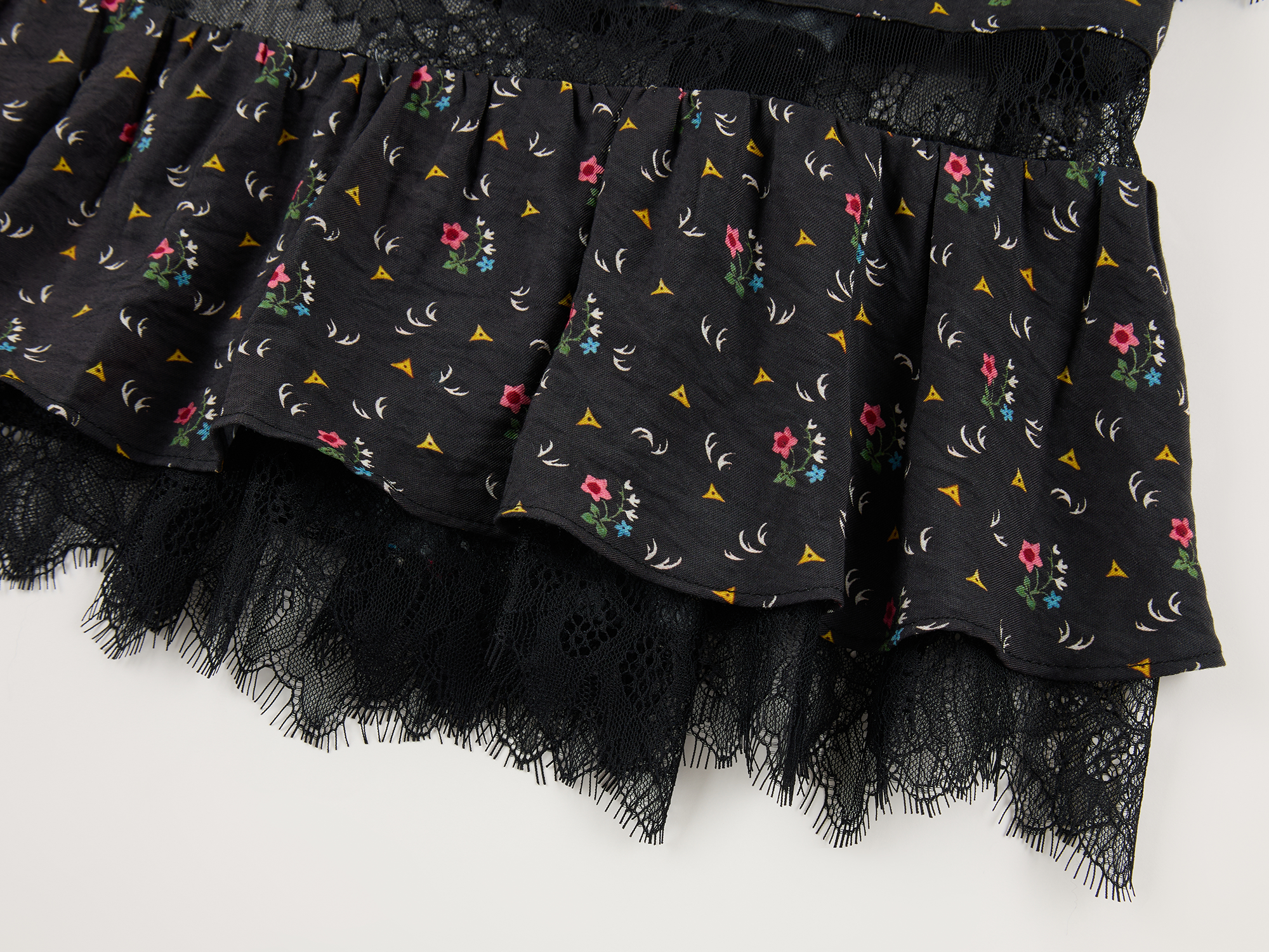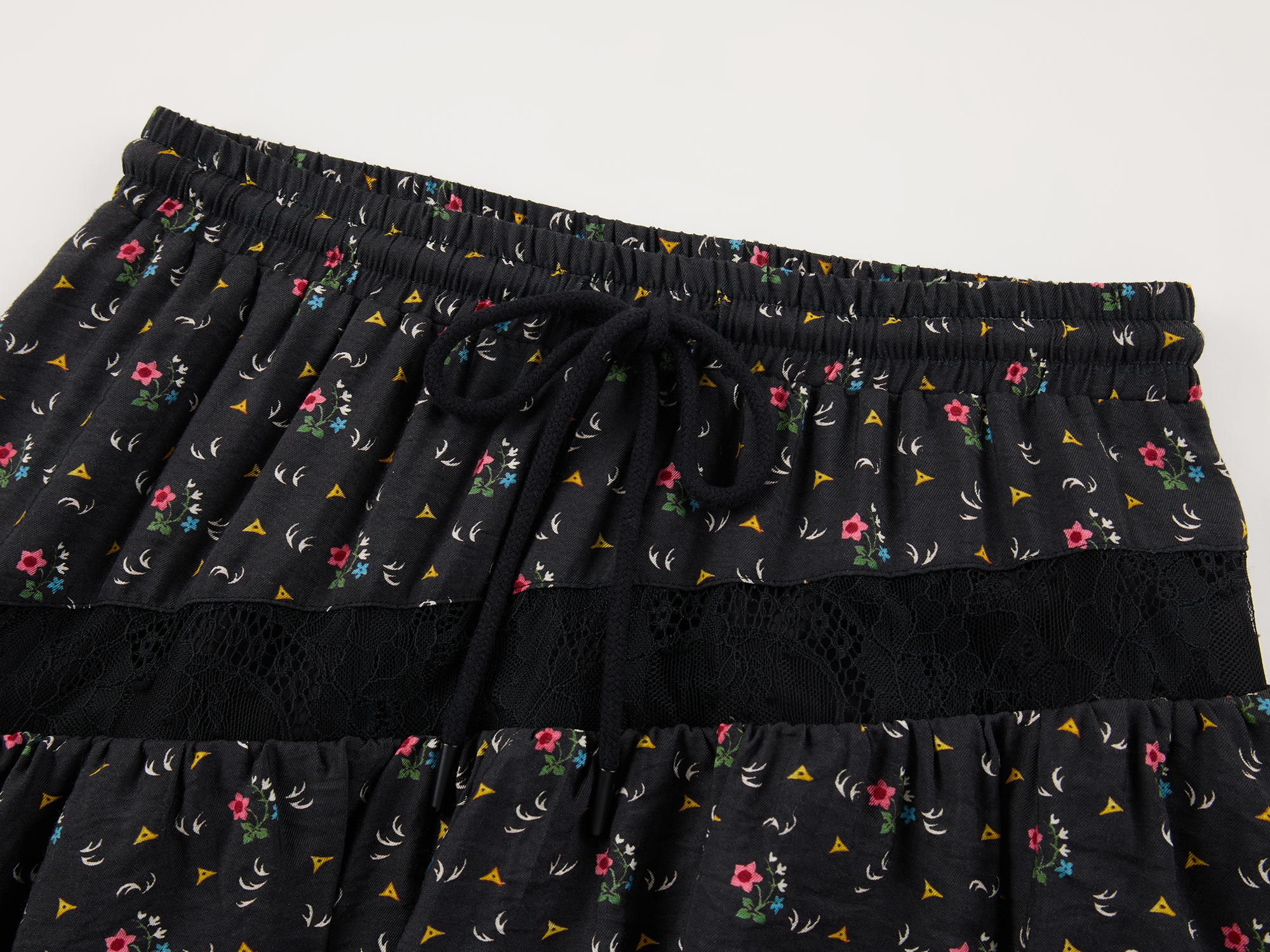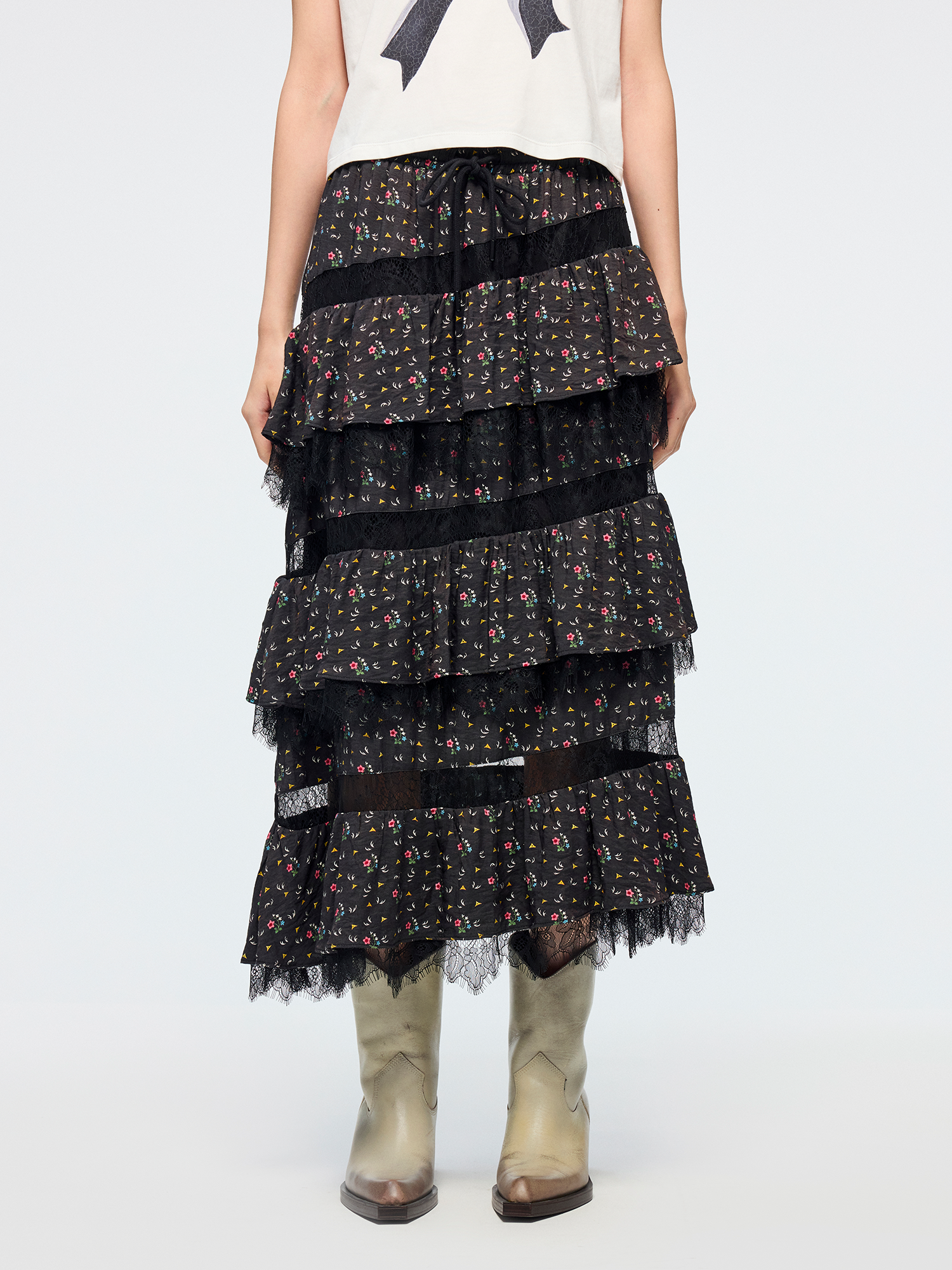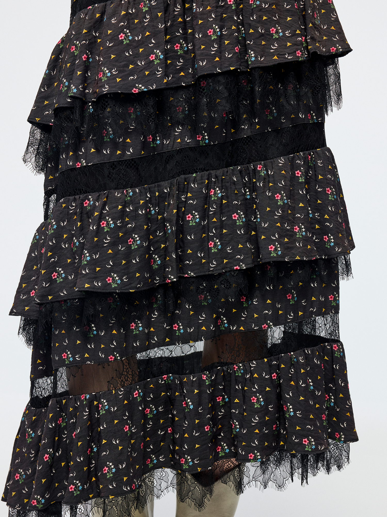 Small floral print fabric spliced with lace creates a tiered cake skirt. Bias cut adds a romantic, casual flow.