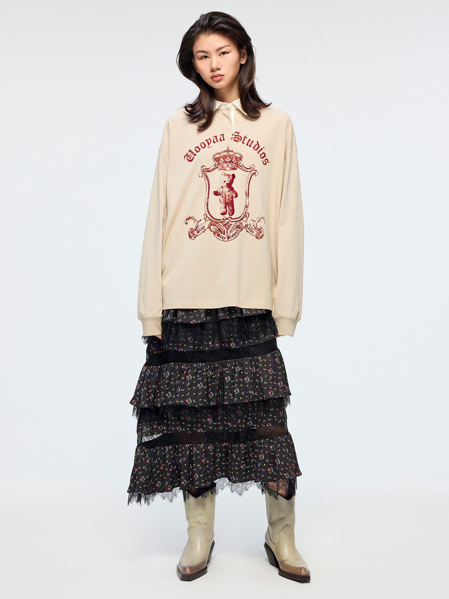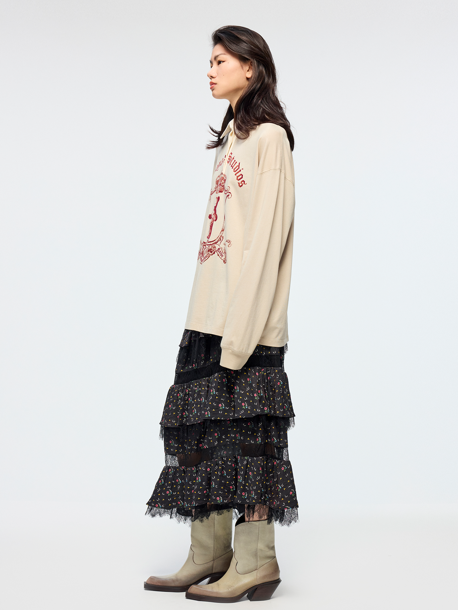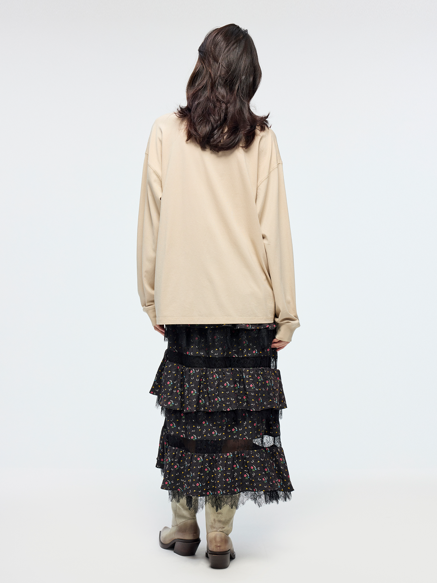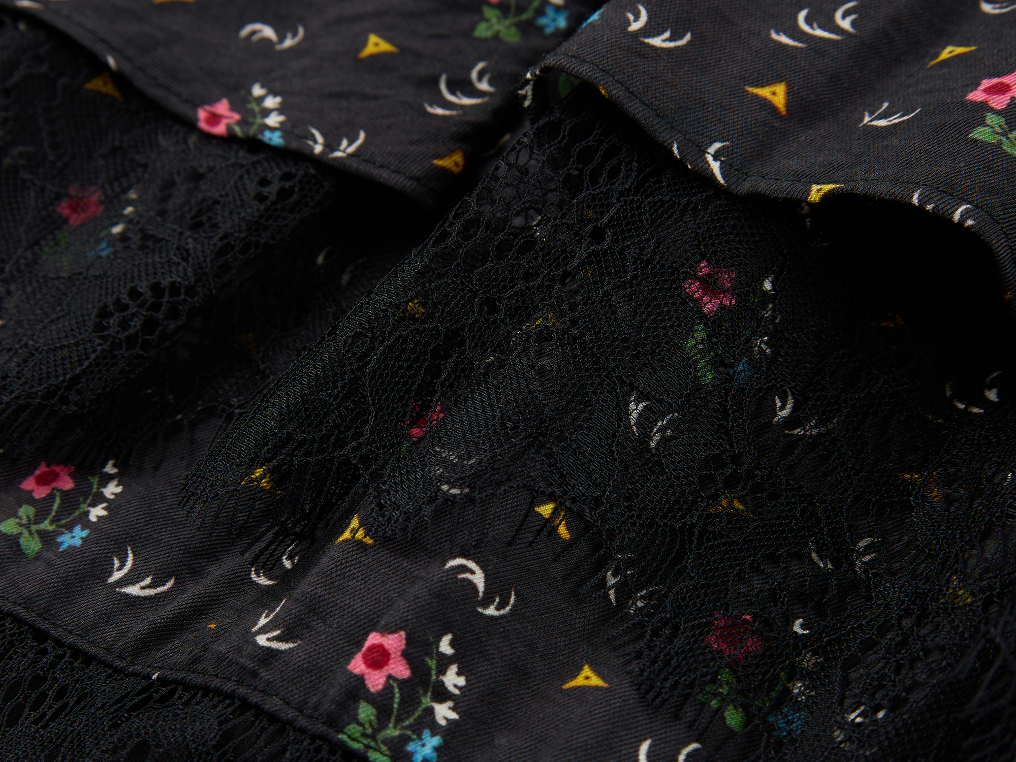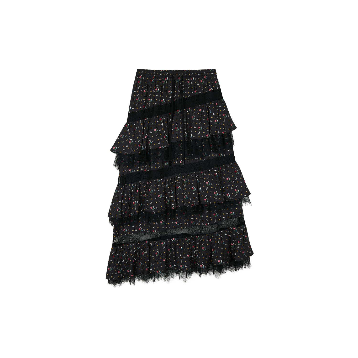 Small floral print fabric spliced with lace creates a tiered cake skirt. Bias cut adds a romantic, casual flow.