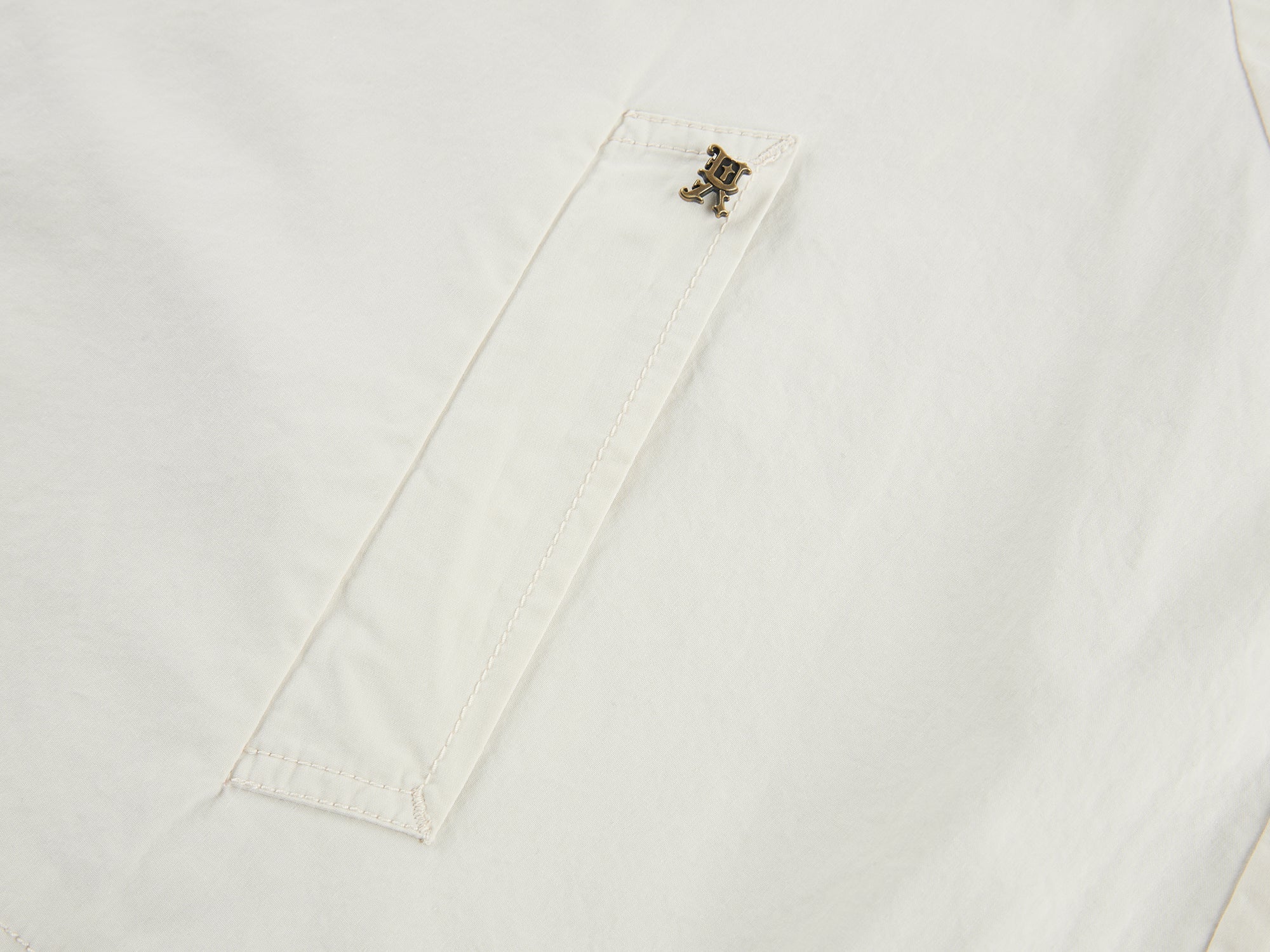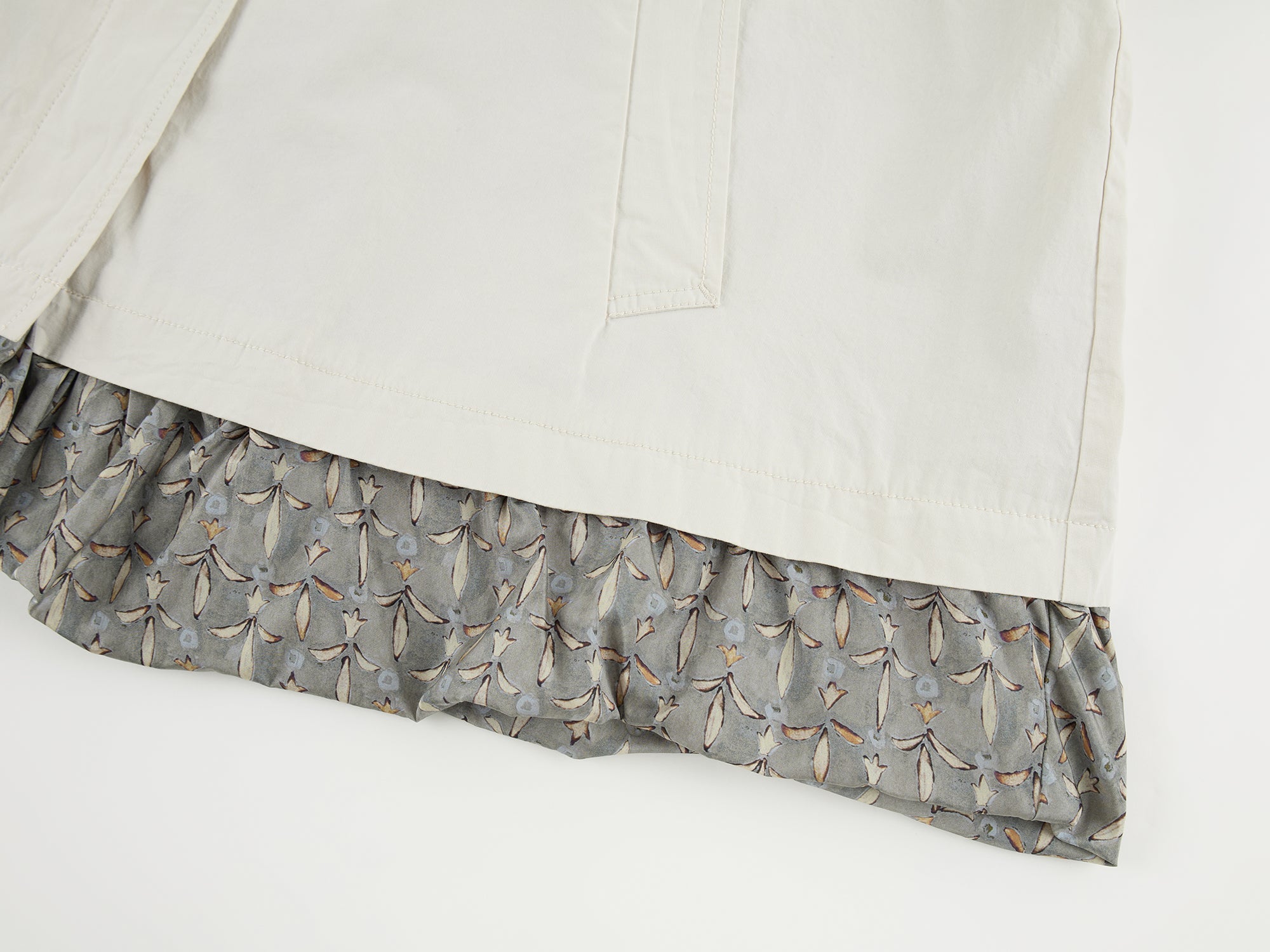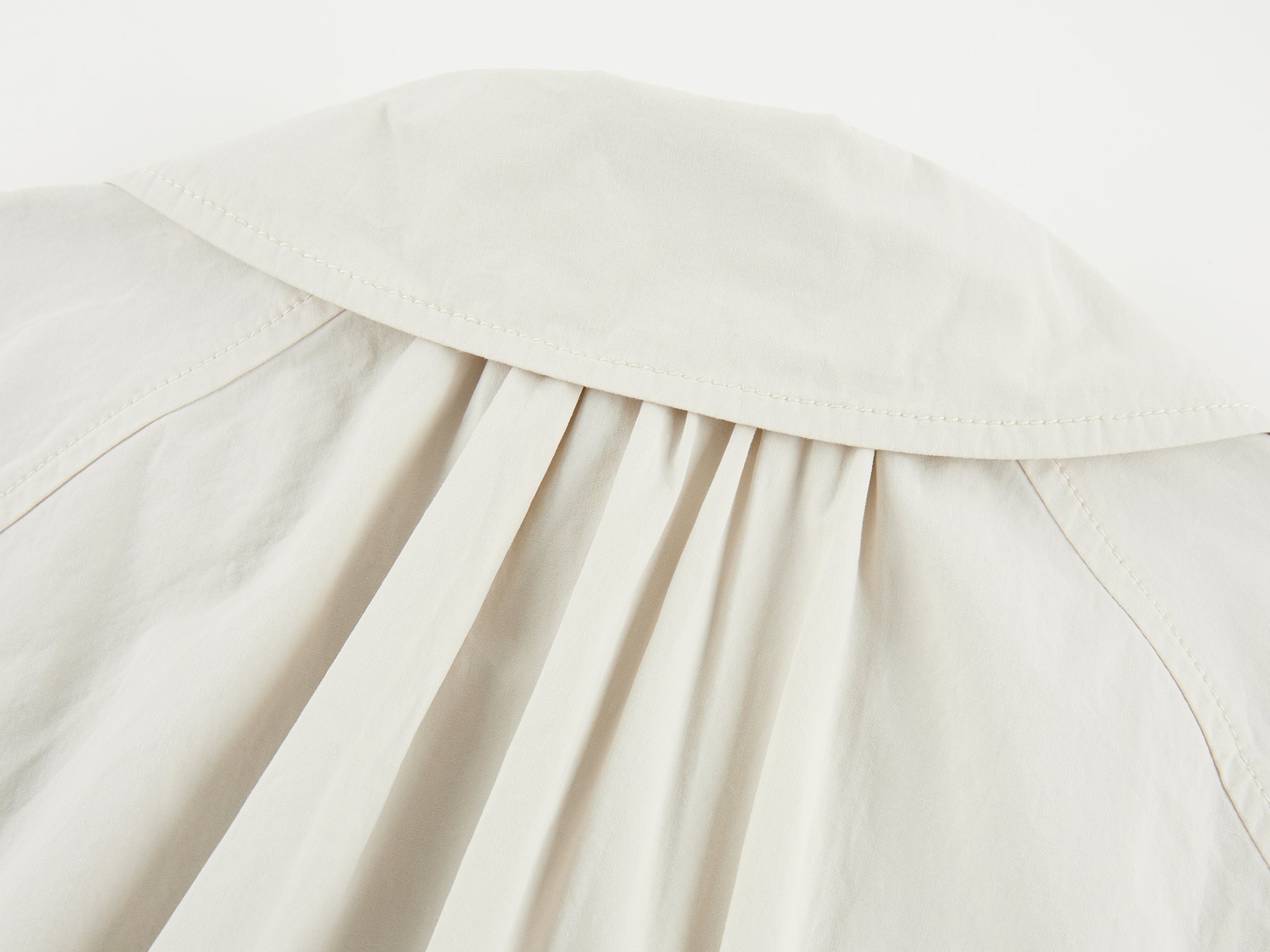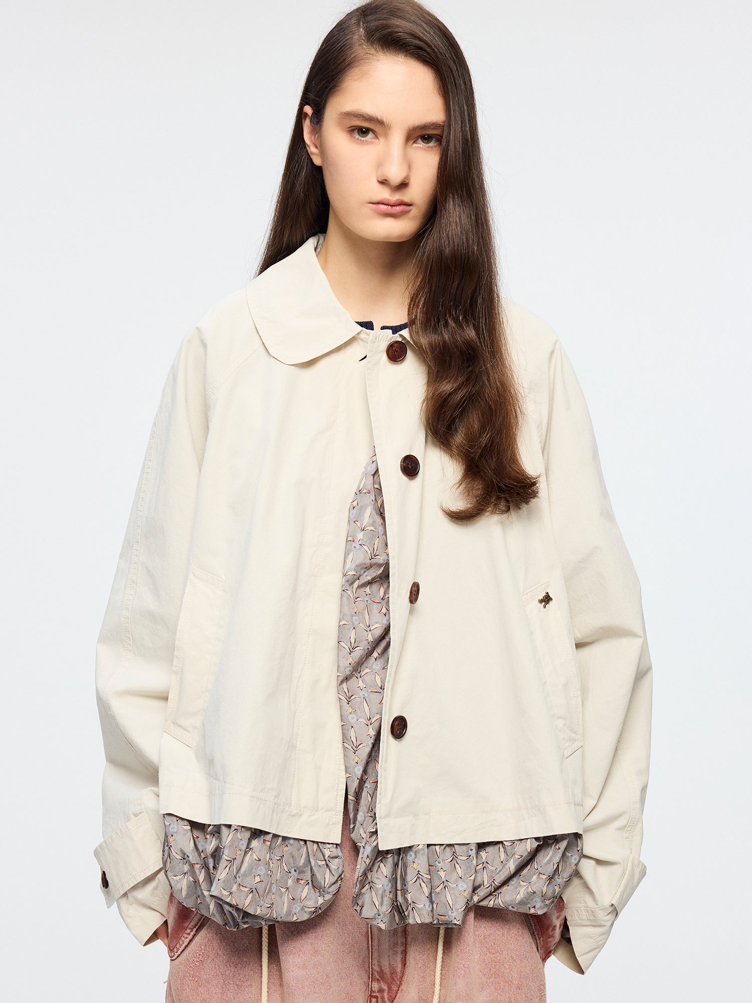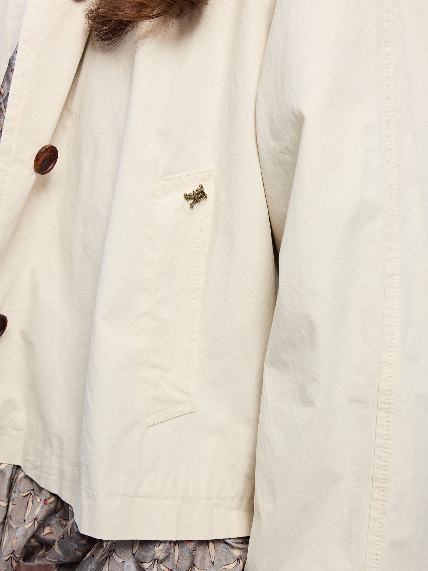 Cropped Balmacaan coat features classical pattern lining designed to be exposed.
