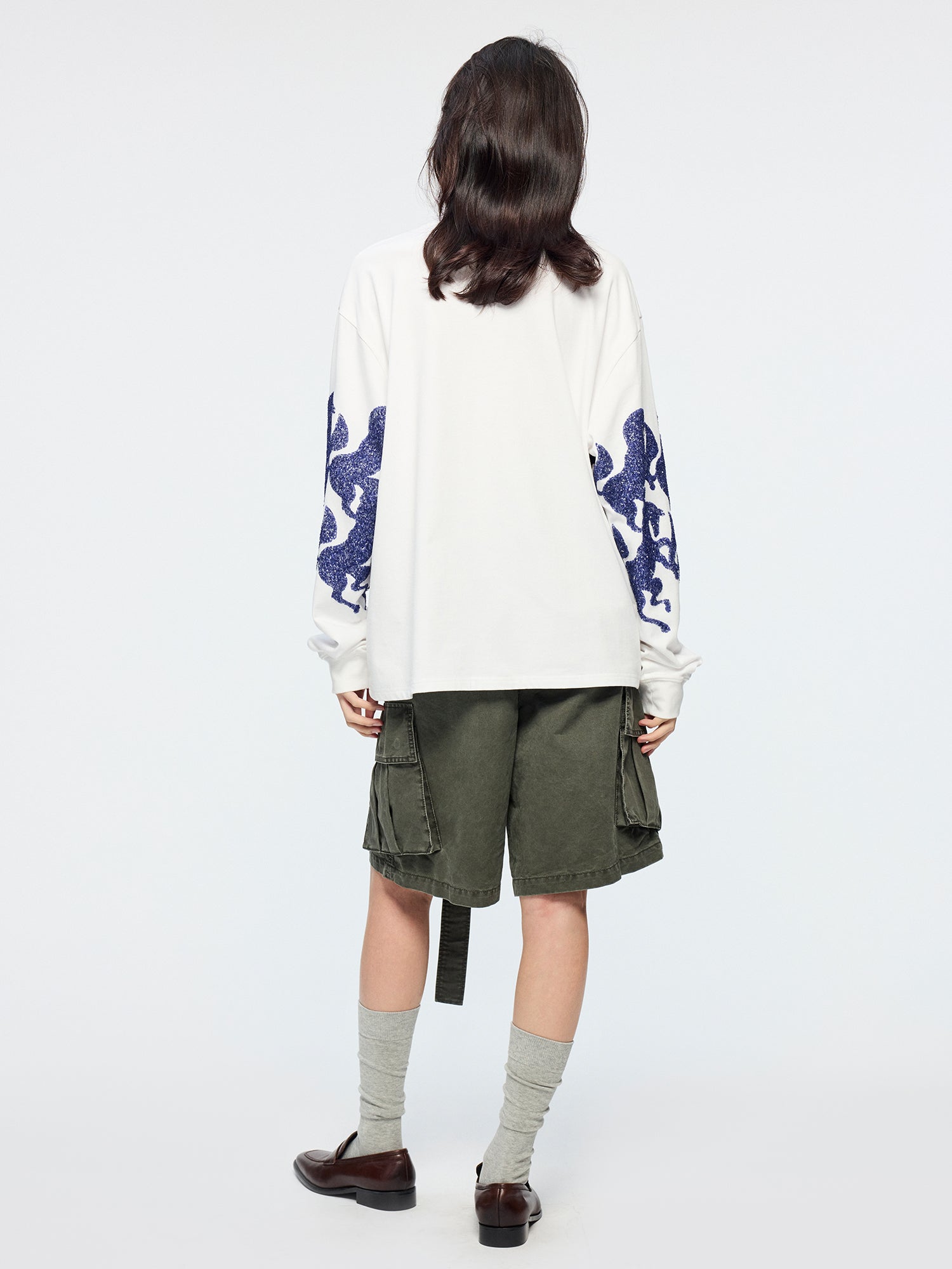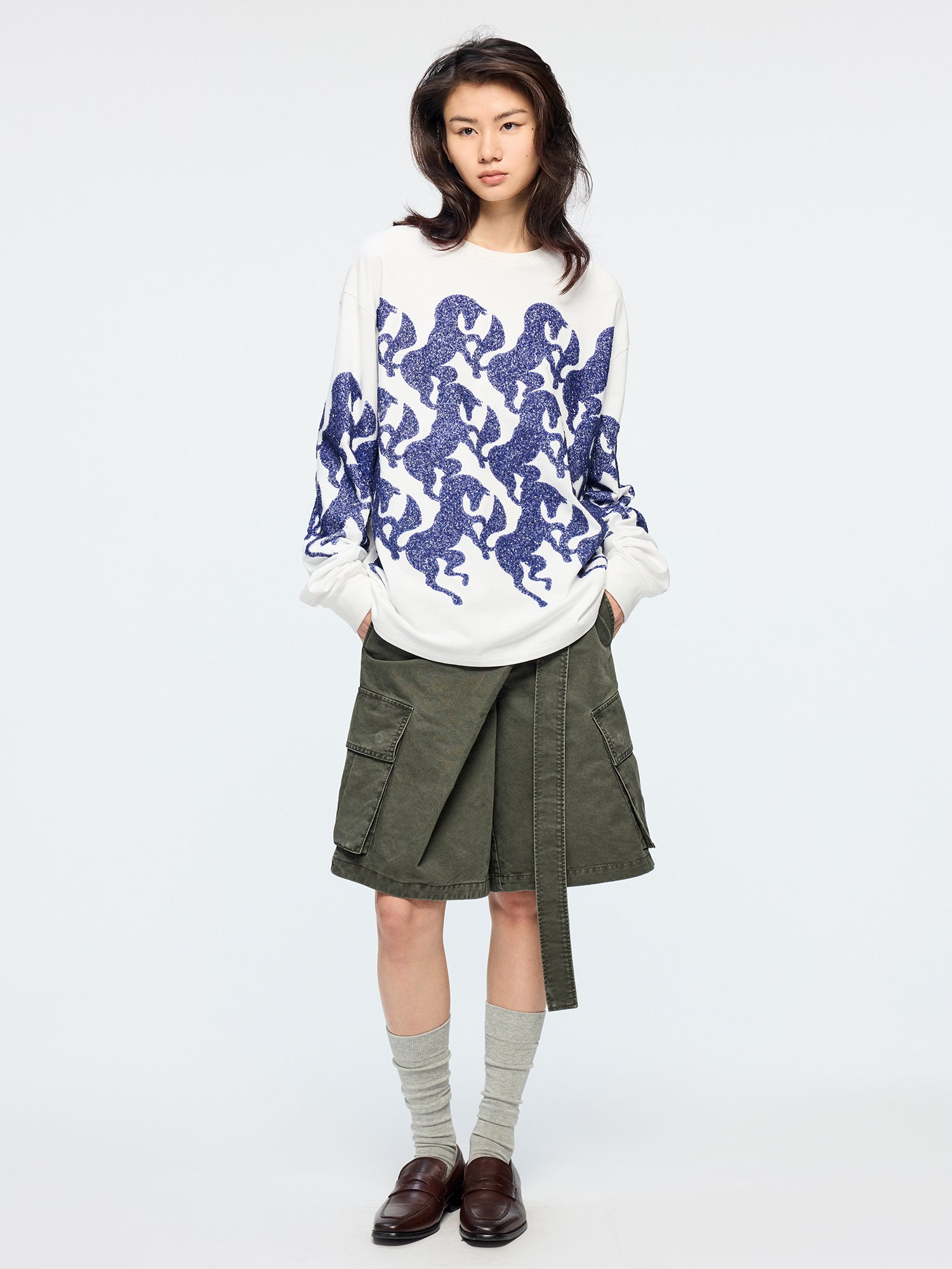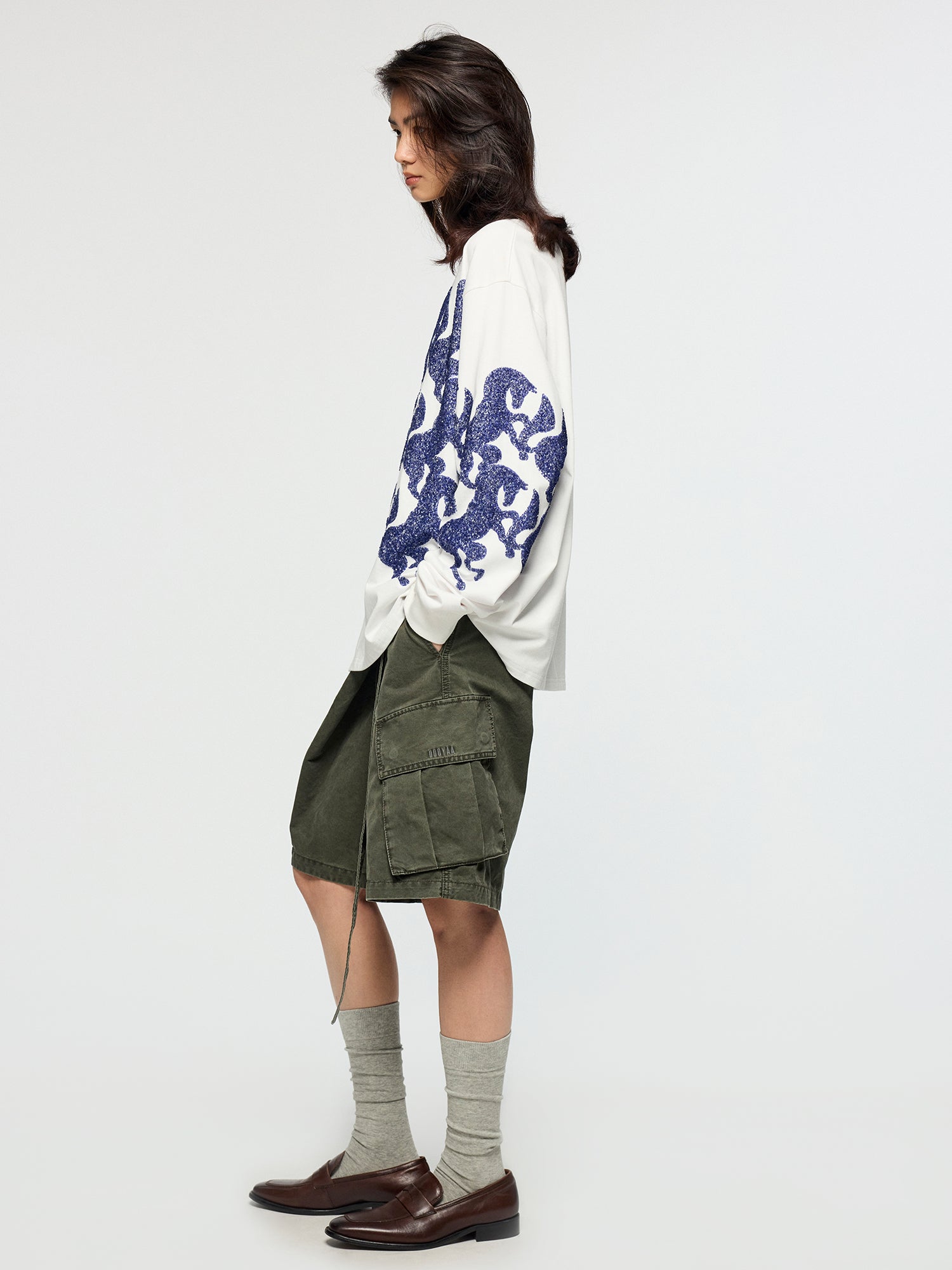 Cargo shorts feature a wrap waist design and self-fabric ribbon loops for a relaxed, casual vibe.