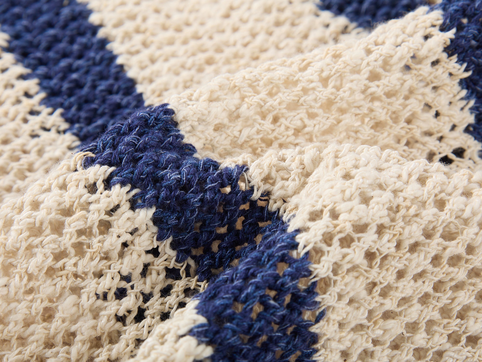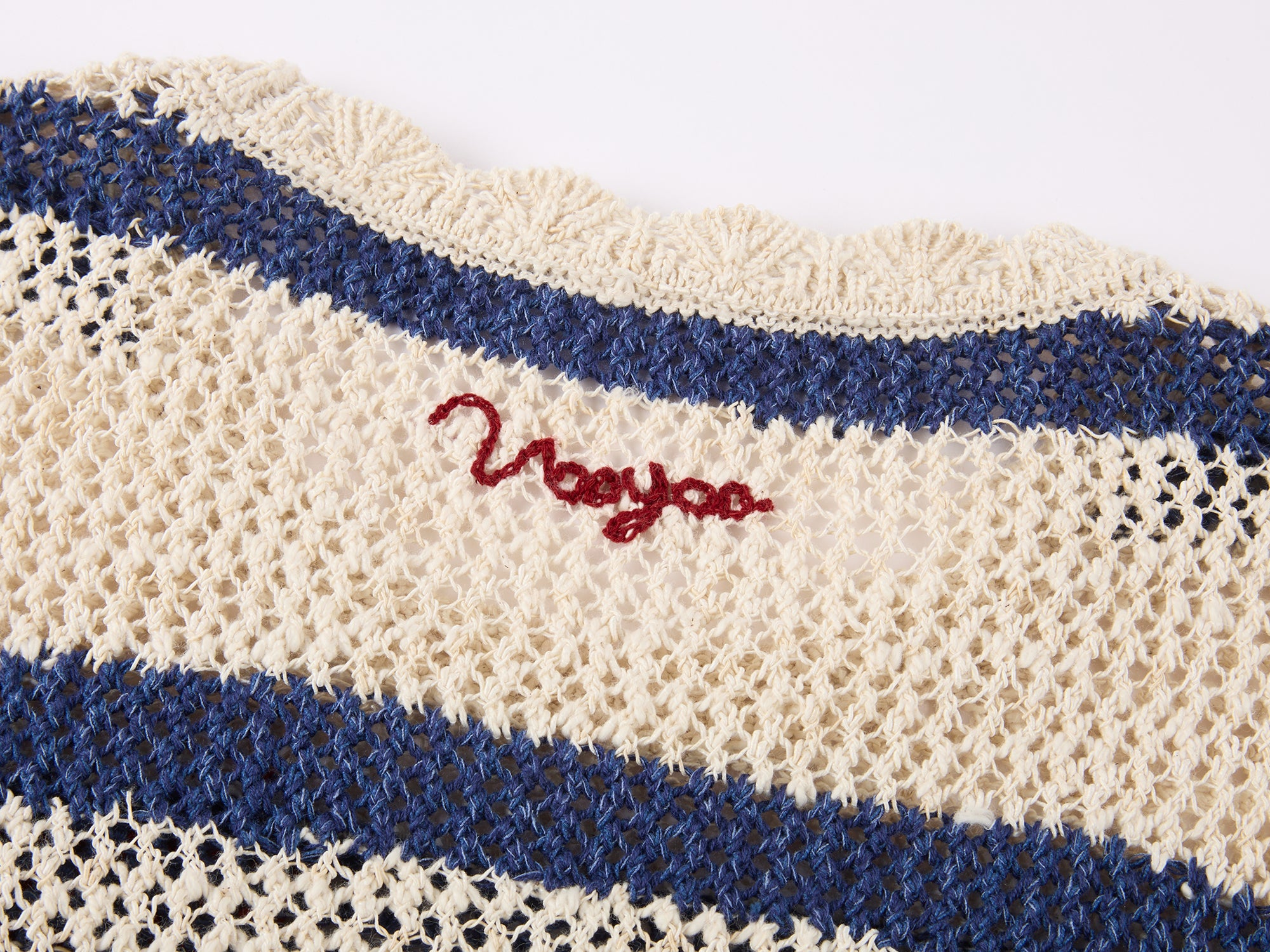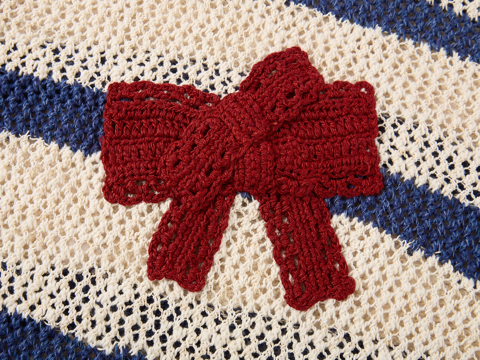Irregular layered bows and openwork hand-crochet meet irregular blue stripes. Allover translucent openwork texture offers youthfulness and handmade quality.