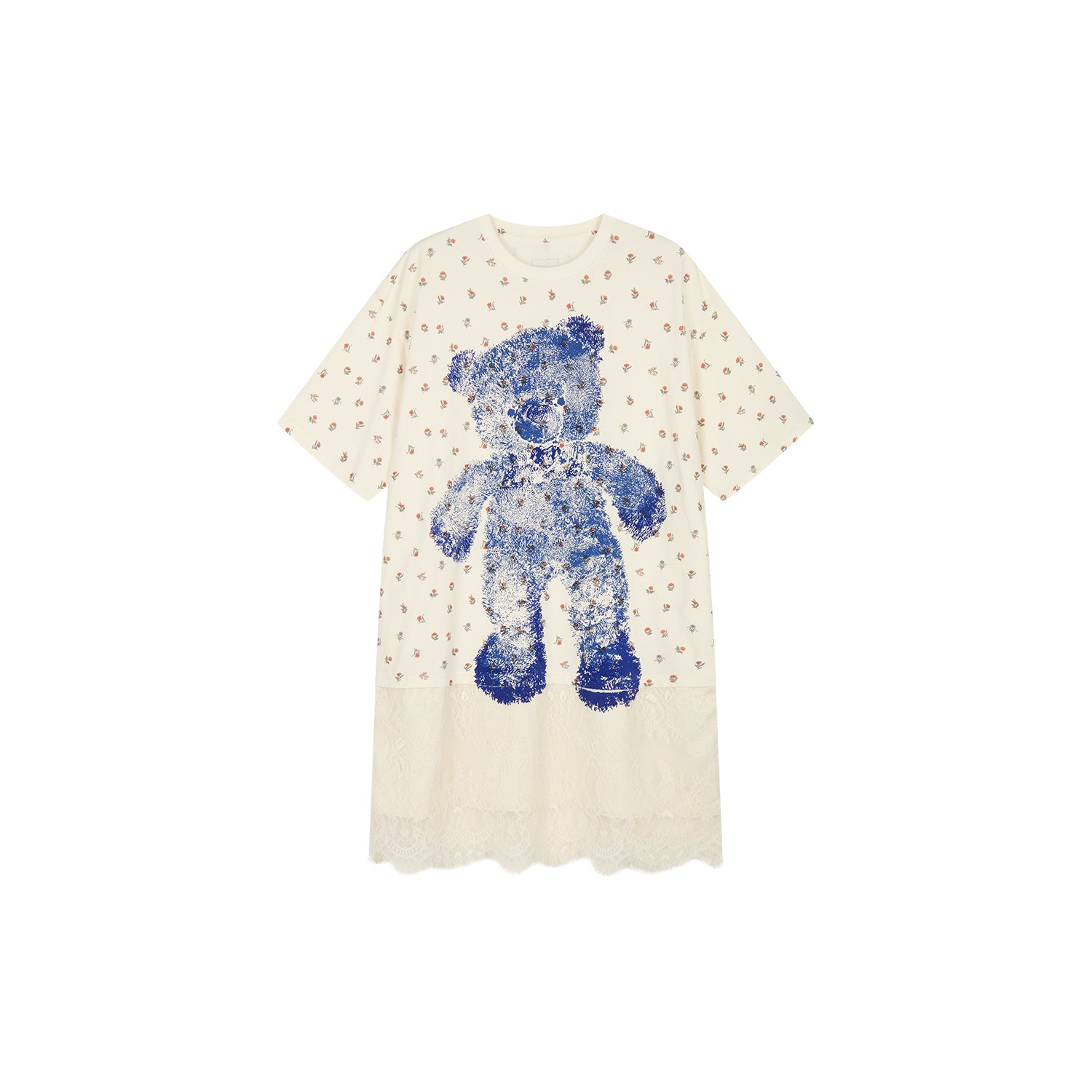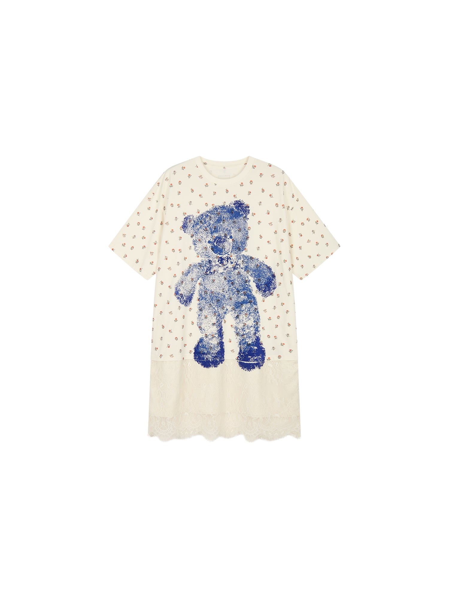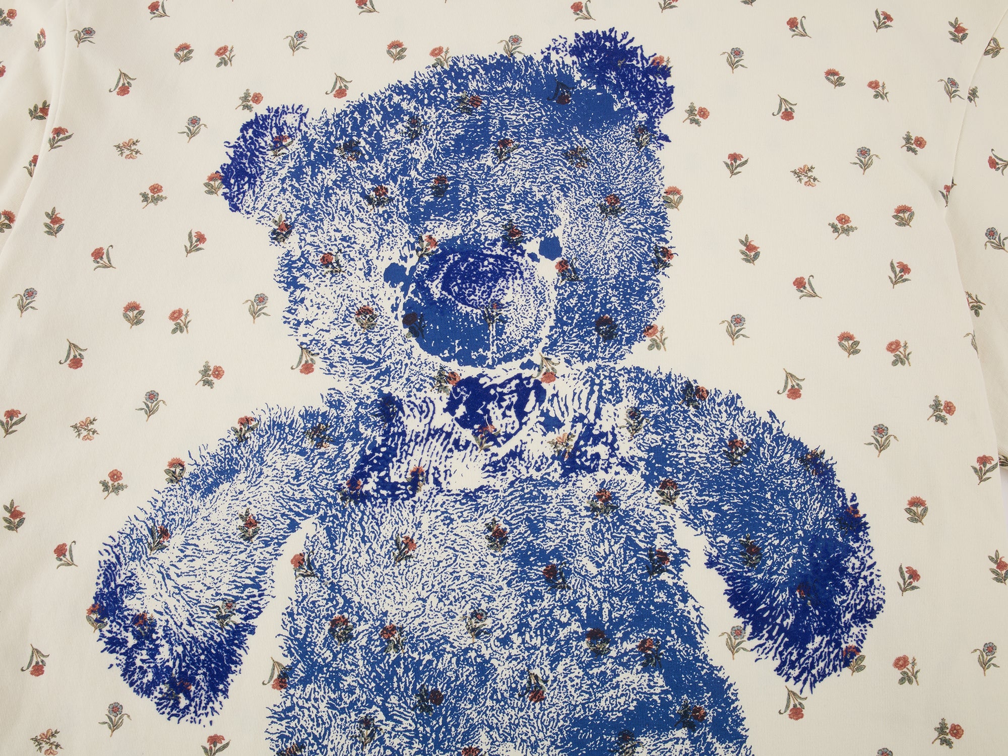 The dress features an embossed print of the colorful bear hug marks. The combination of vintage floral print and a Klein Blue bear creates a warm, charming, and playful feel.