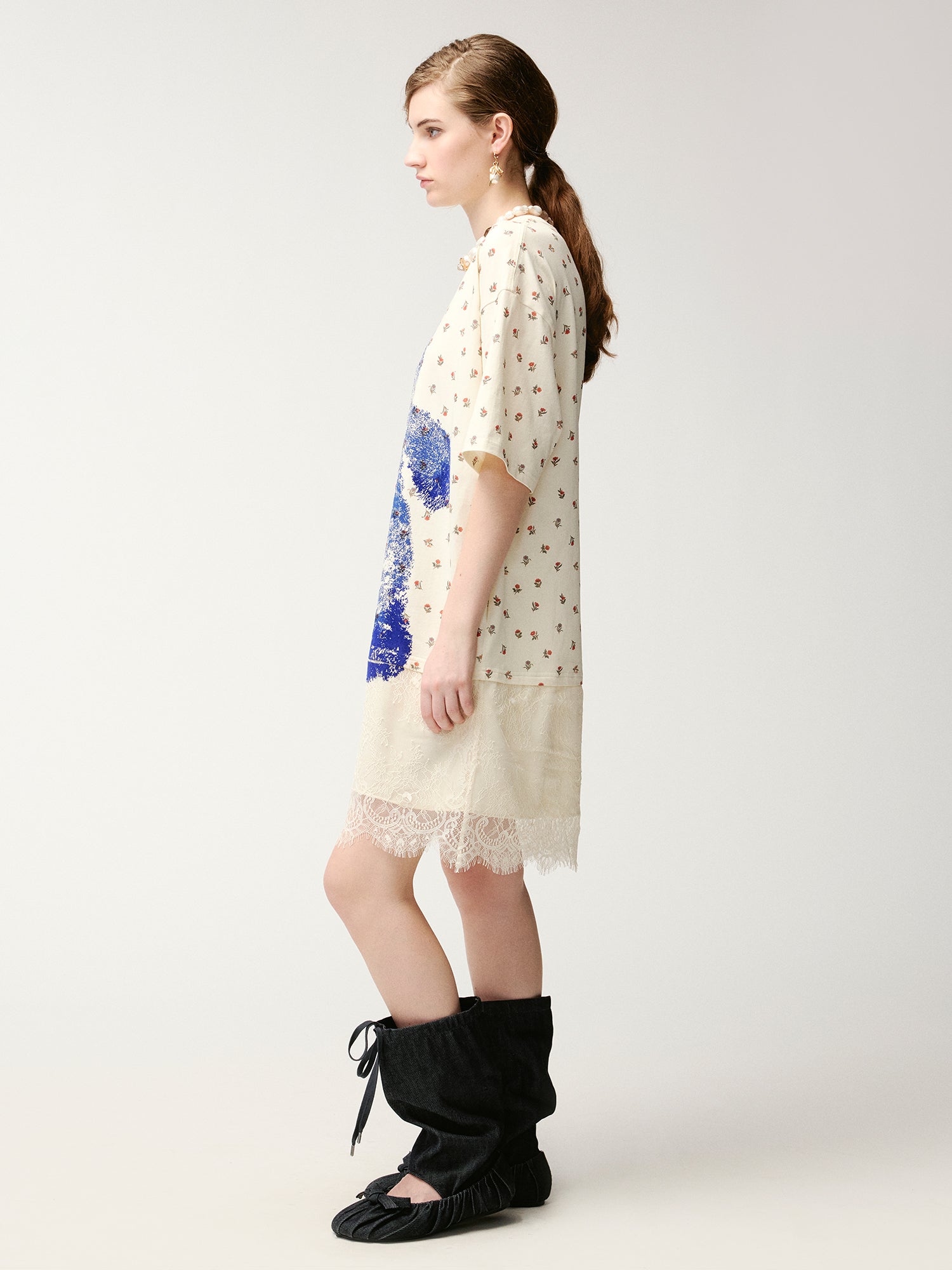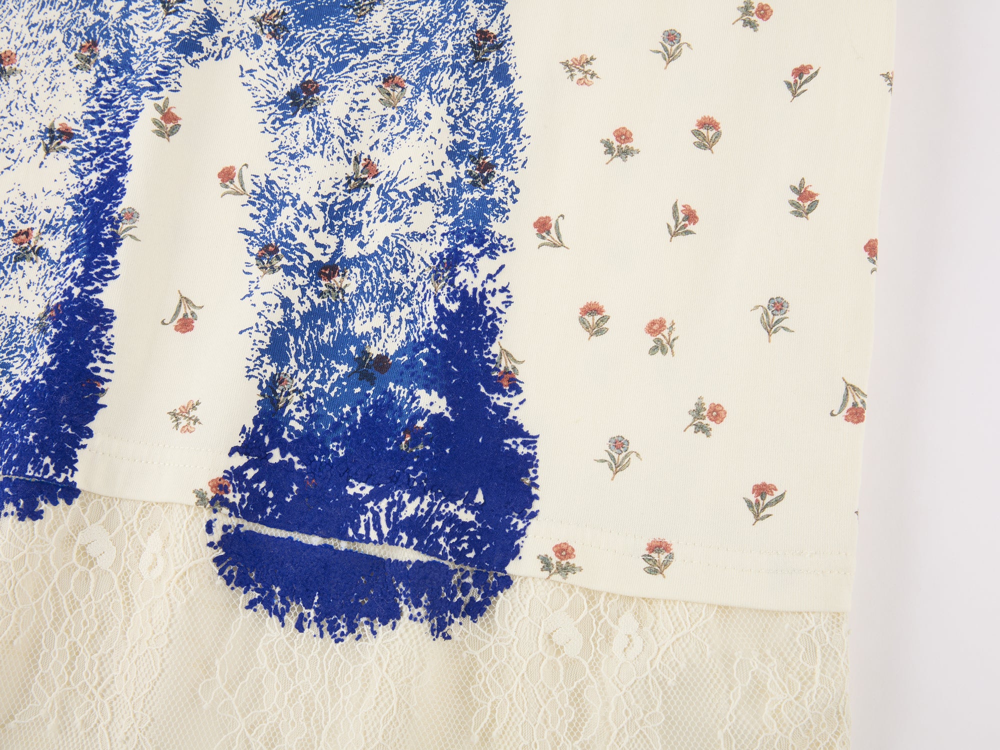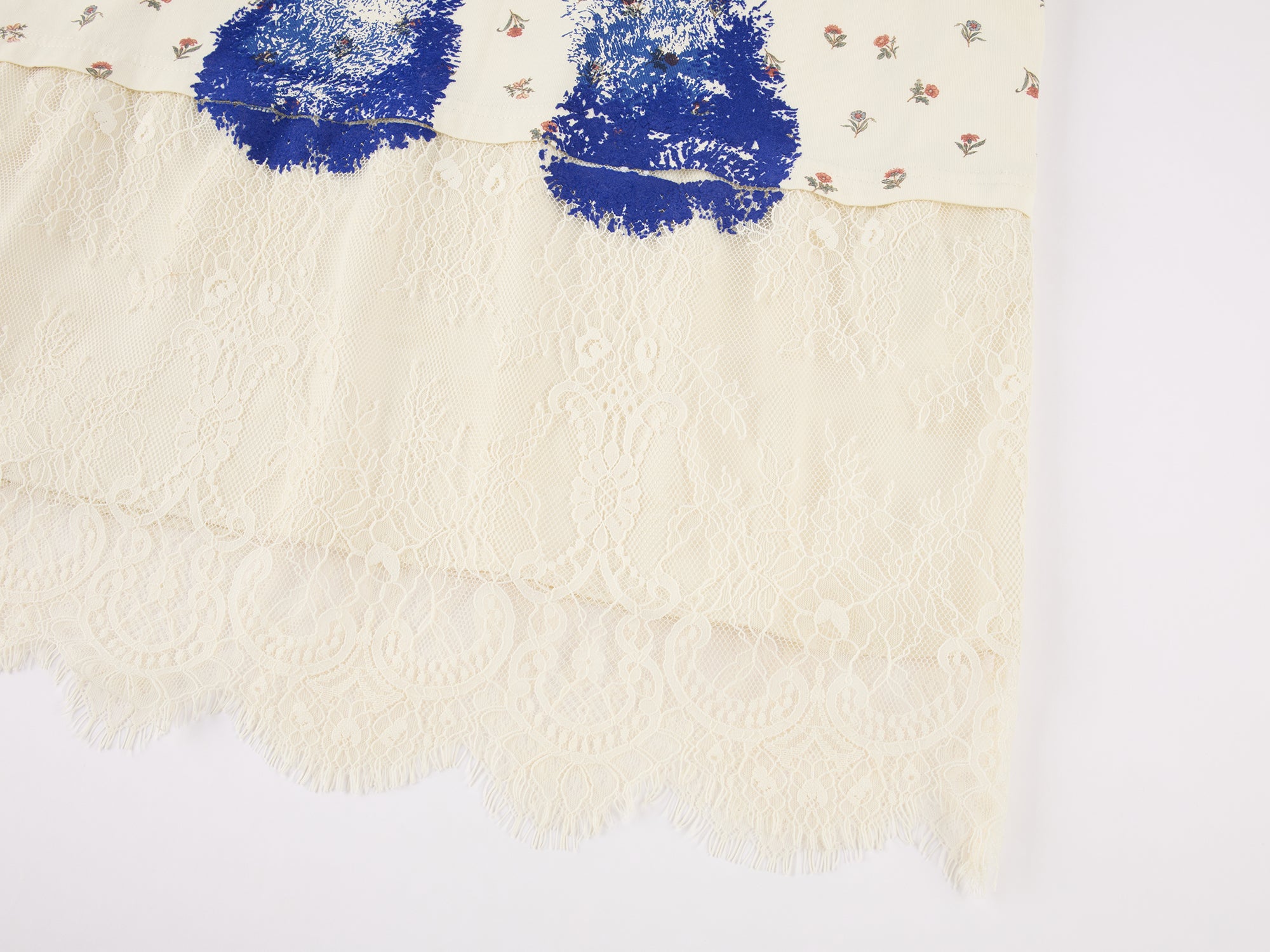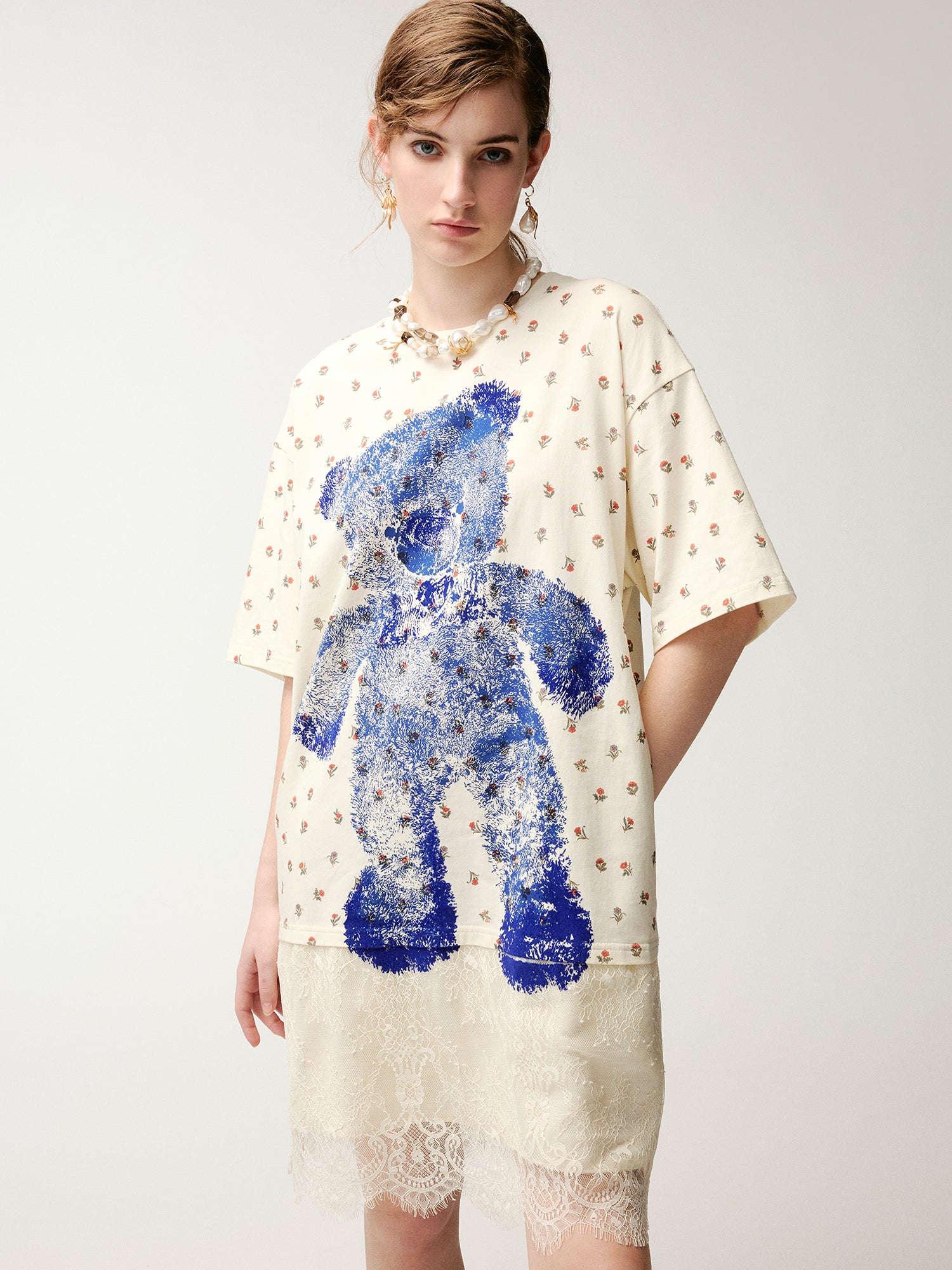 The dress features an embossed print of the colorful bear hug marks. The combination of vintage floral print and a Klein Blue bear creates a warm, charming, and playful feel.