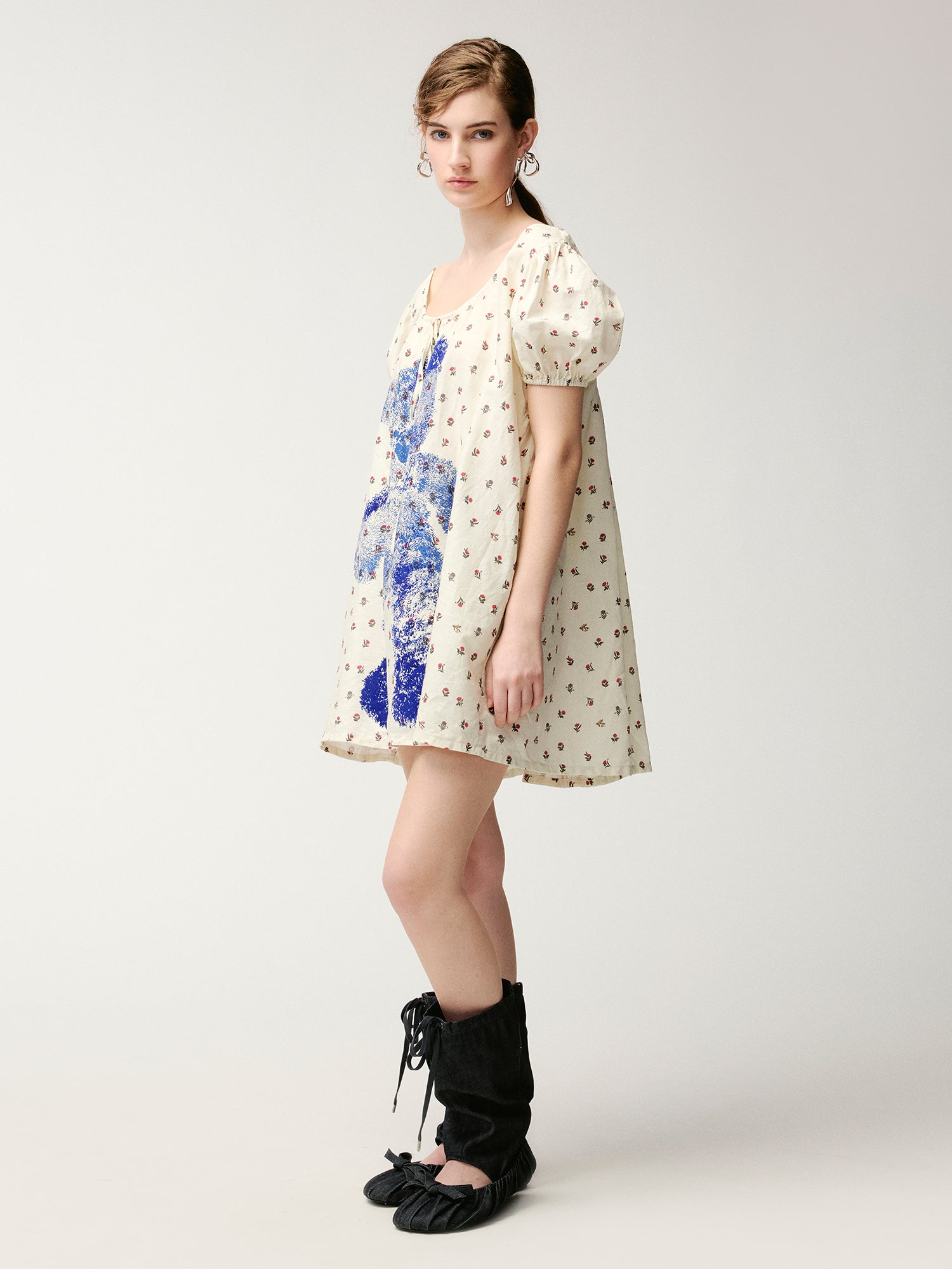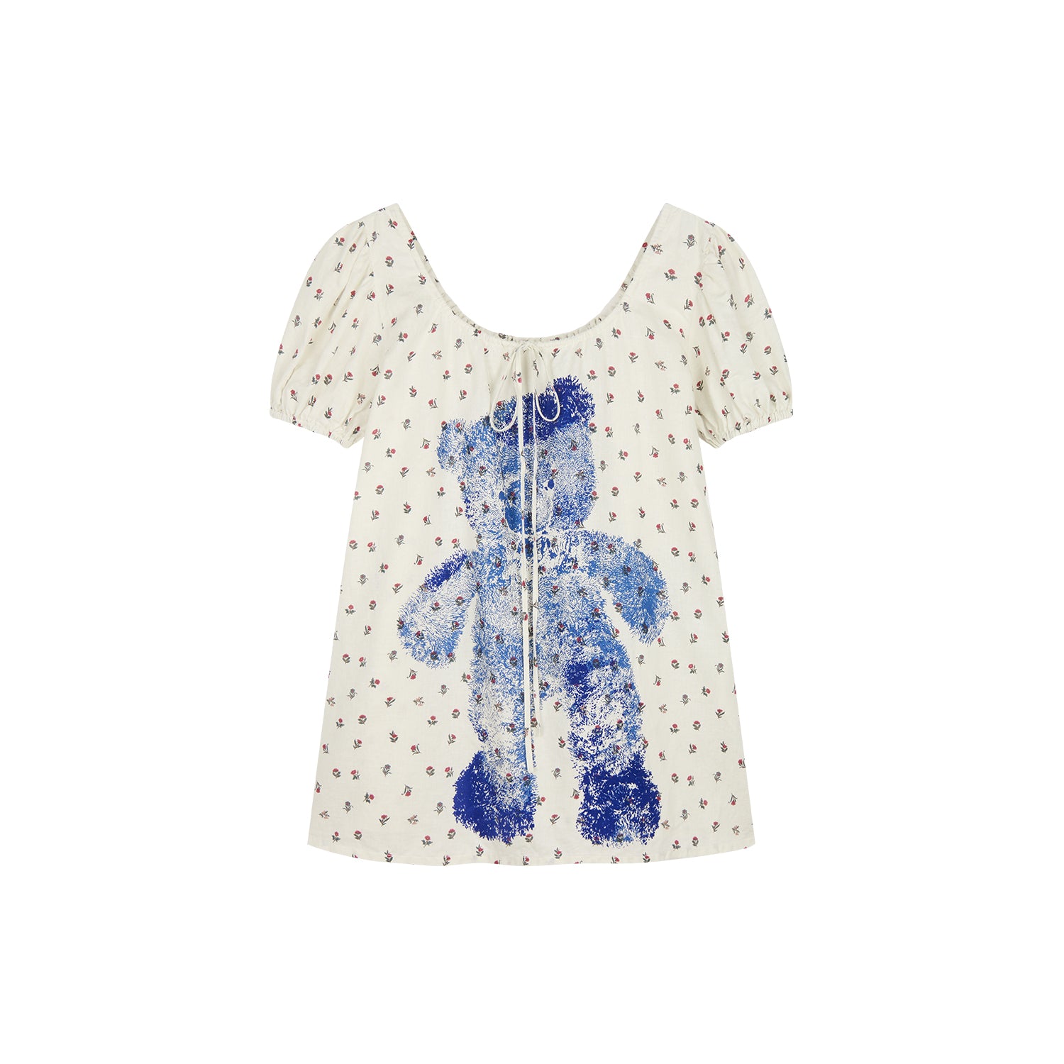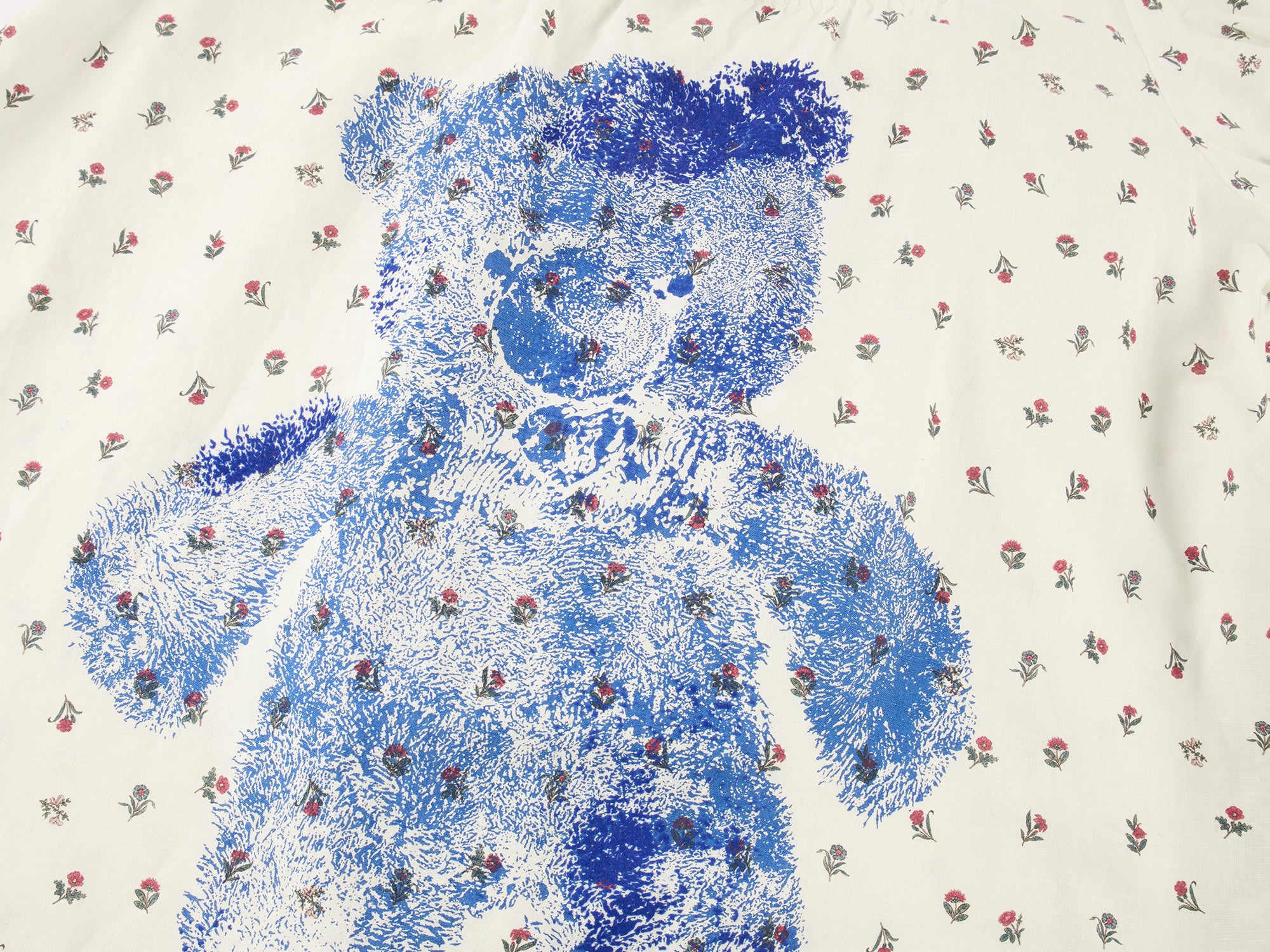 The dress features an embossed print of the colorful bear hug marks. The combination of vintage floral print and a Klein Blue bear creates a warm, playful feel.