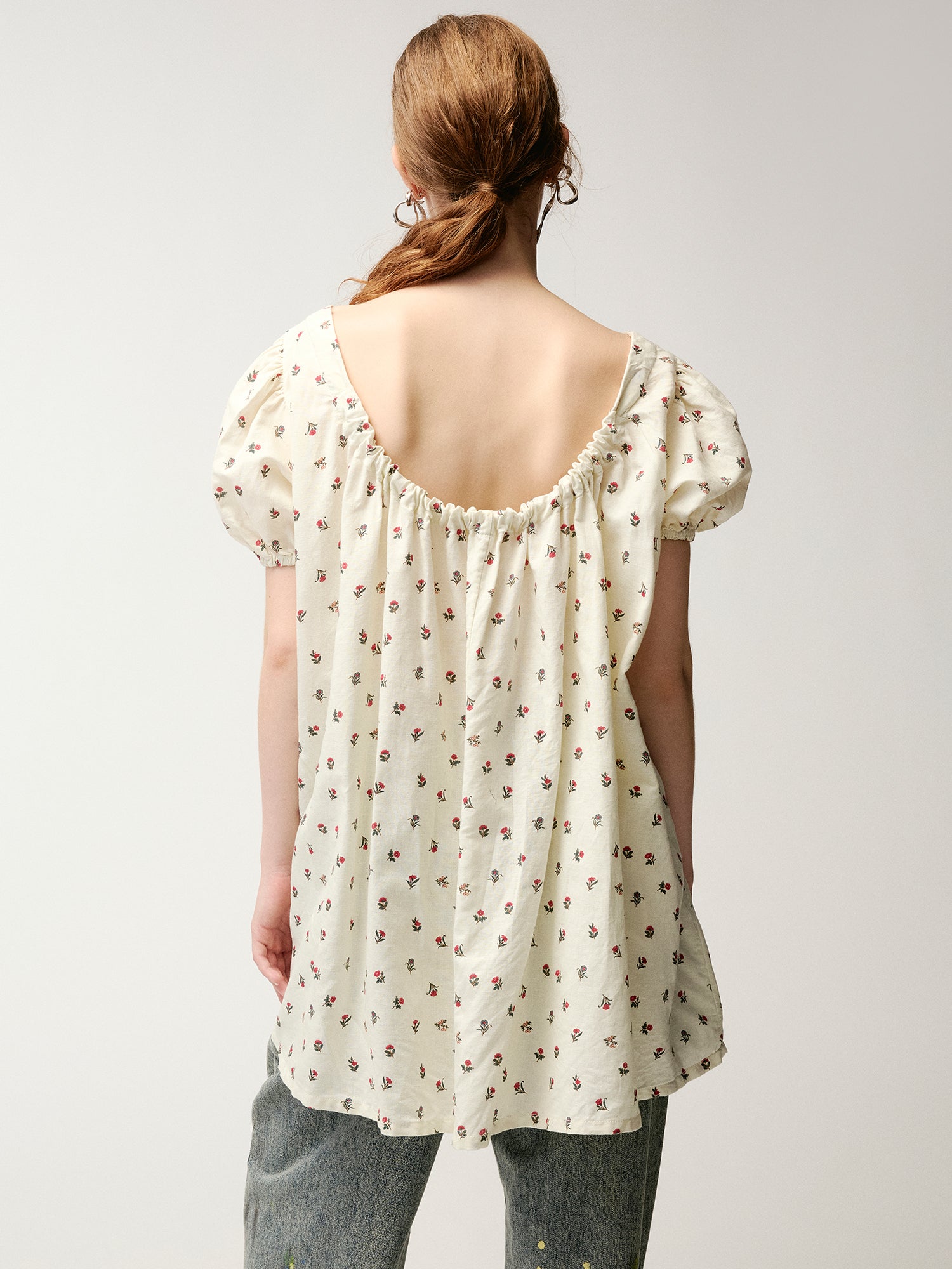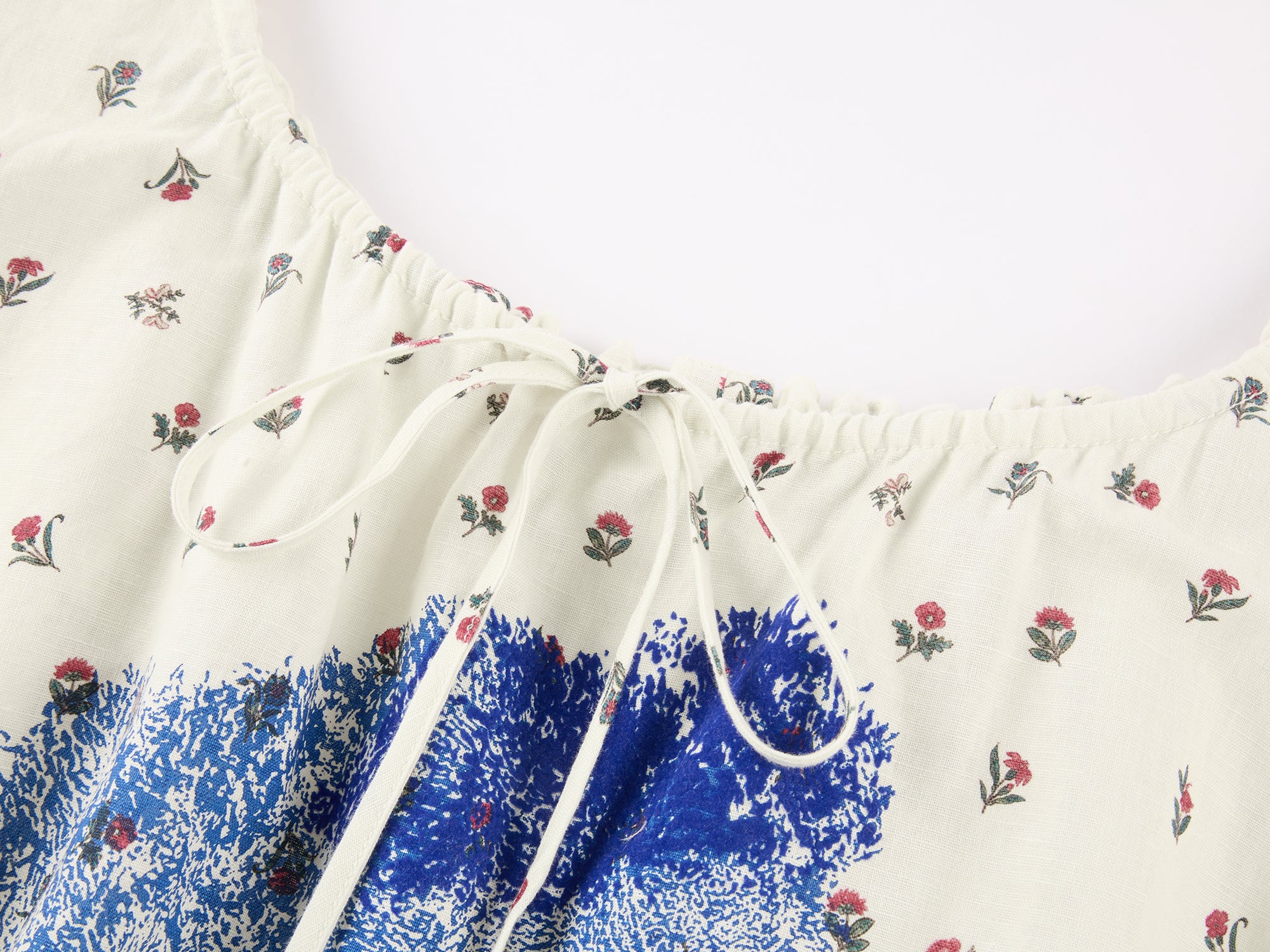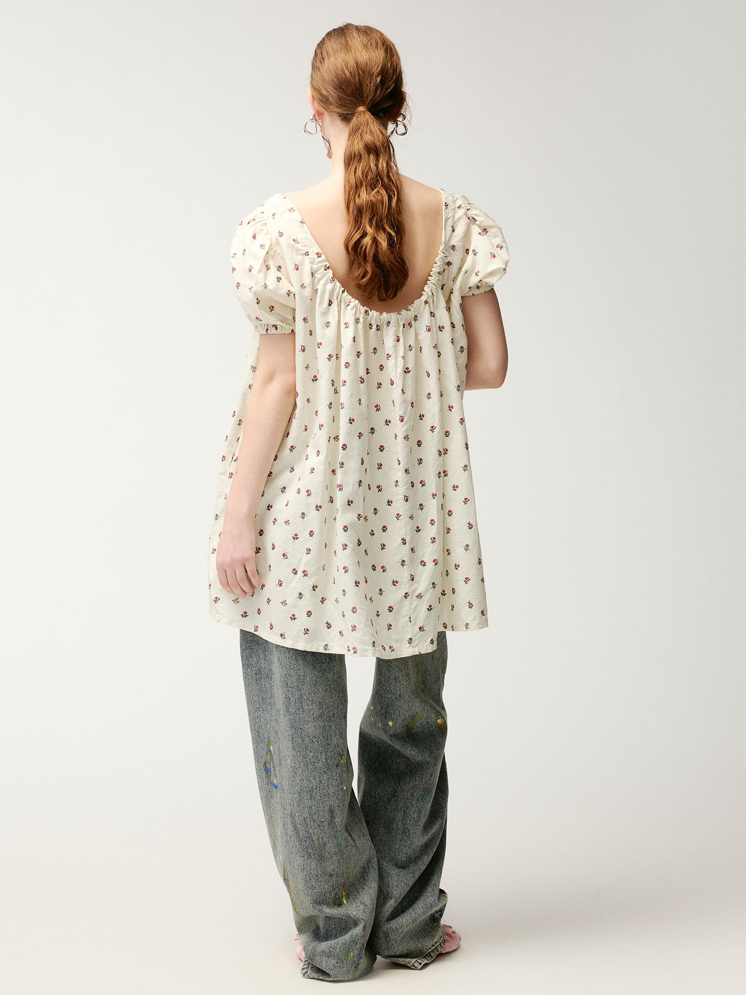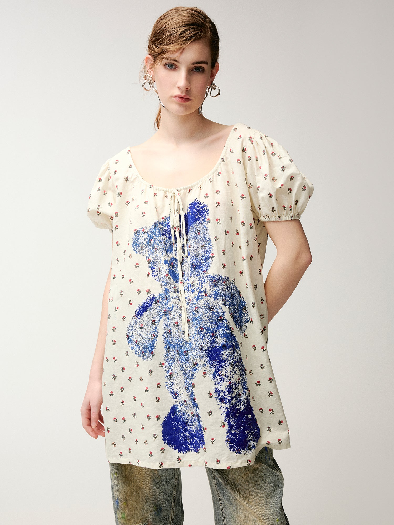 The dress features an embossed print of the colorful bear hug marks. The combination of vintage floral print and a Klein Blue bear creates a warm, playful feel.