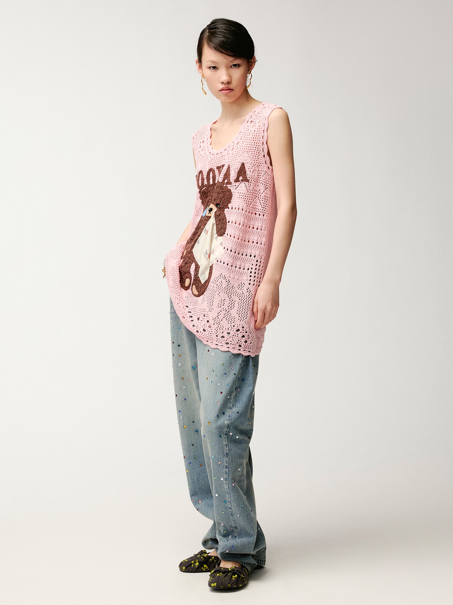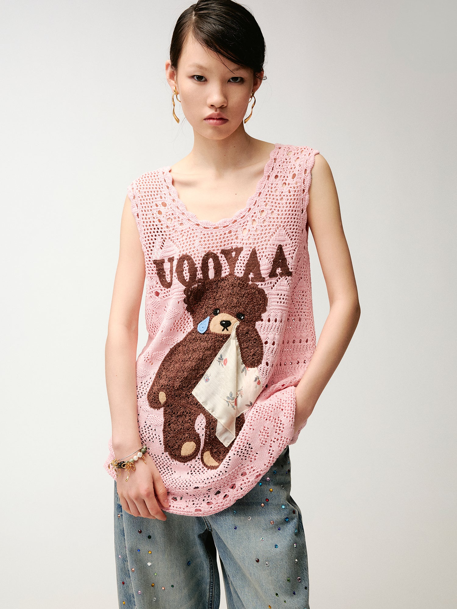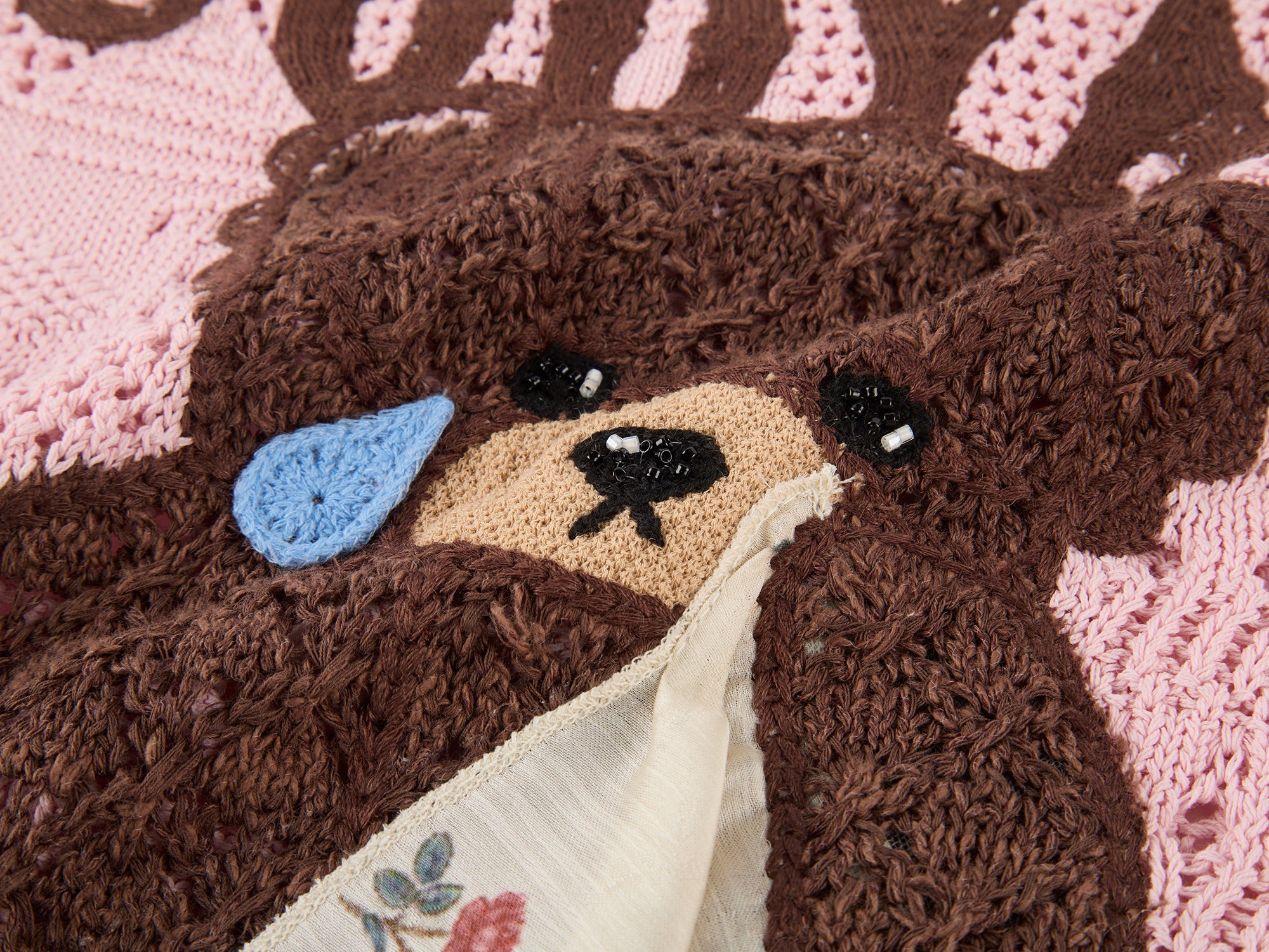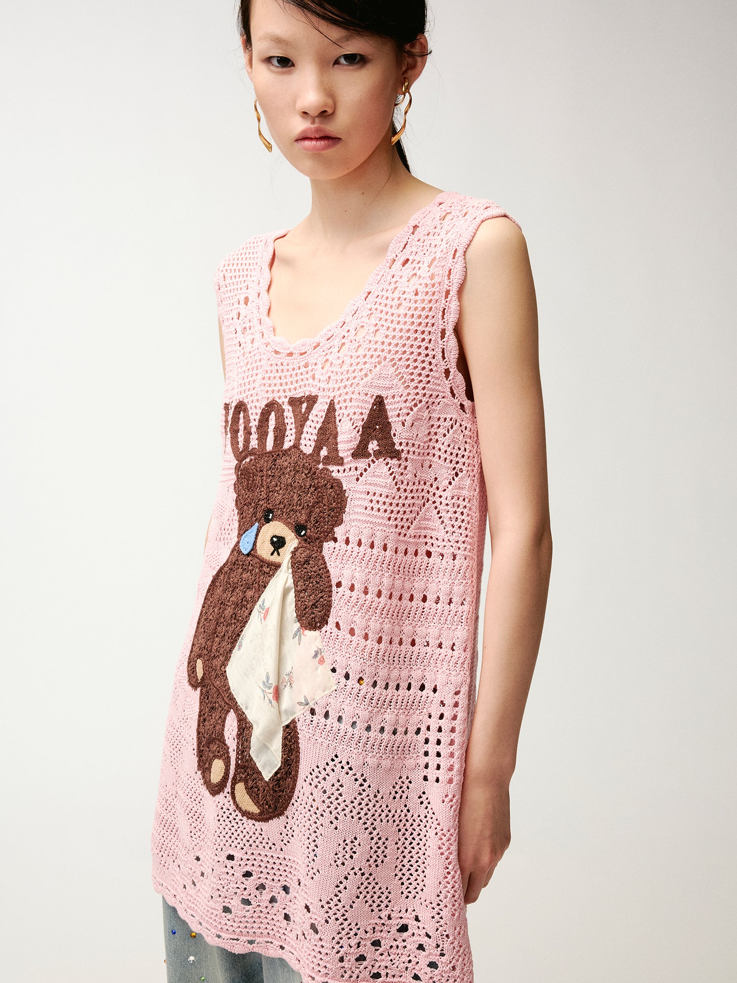 Sad bear embroidered hollow knit dress