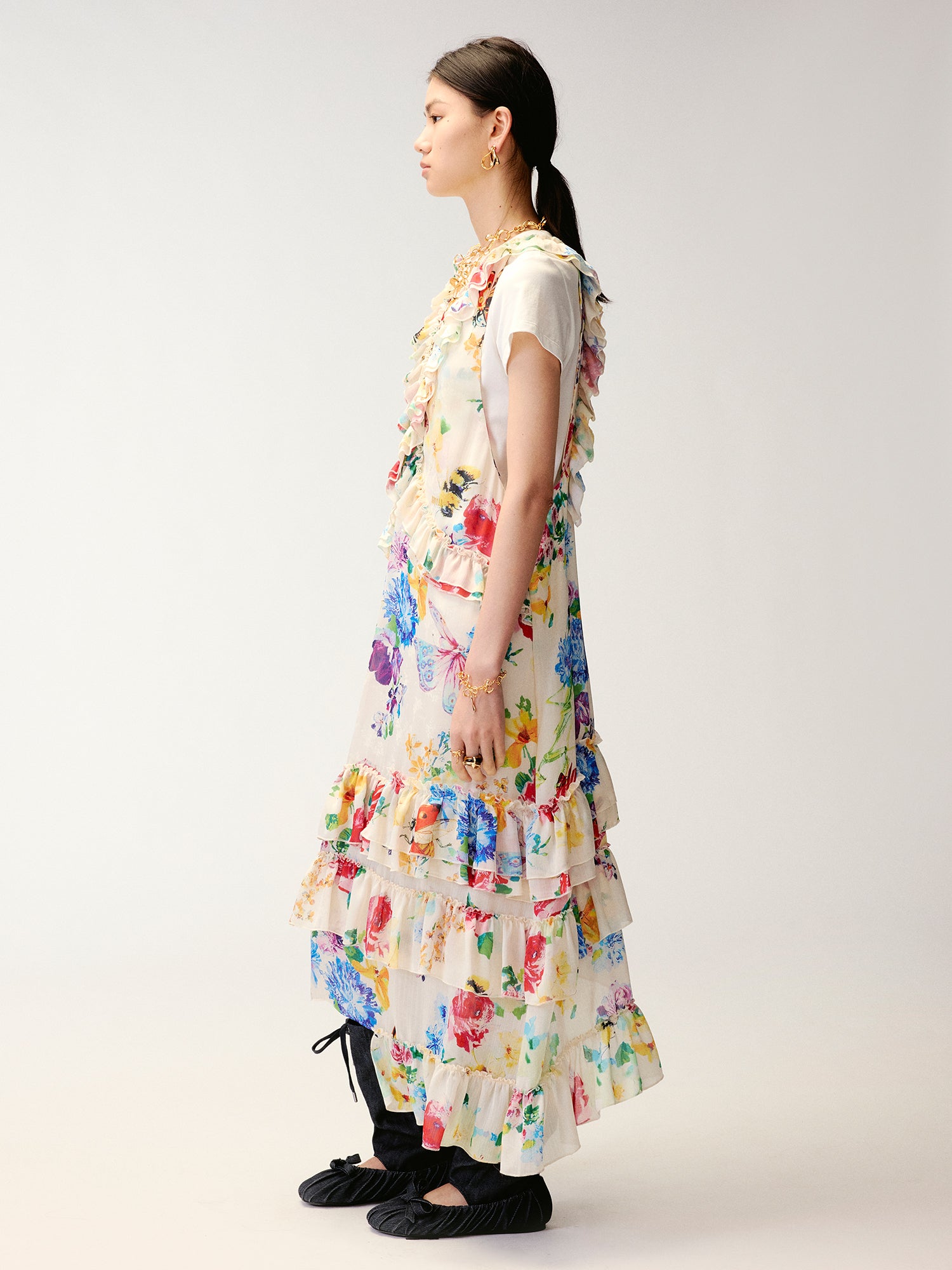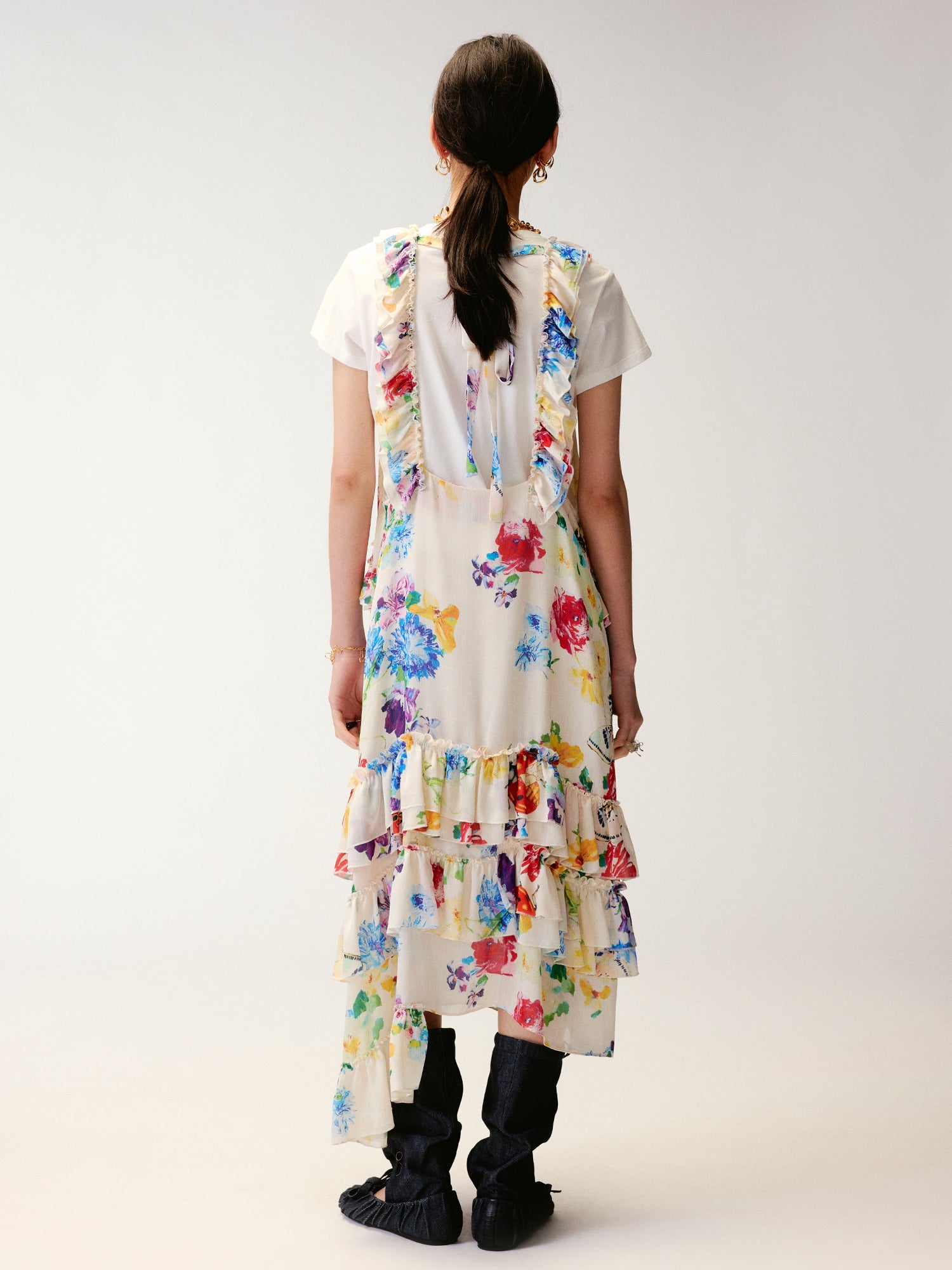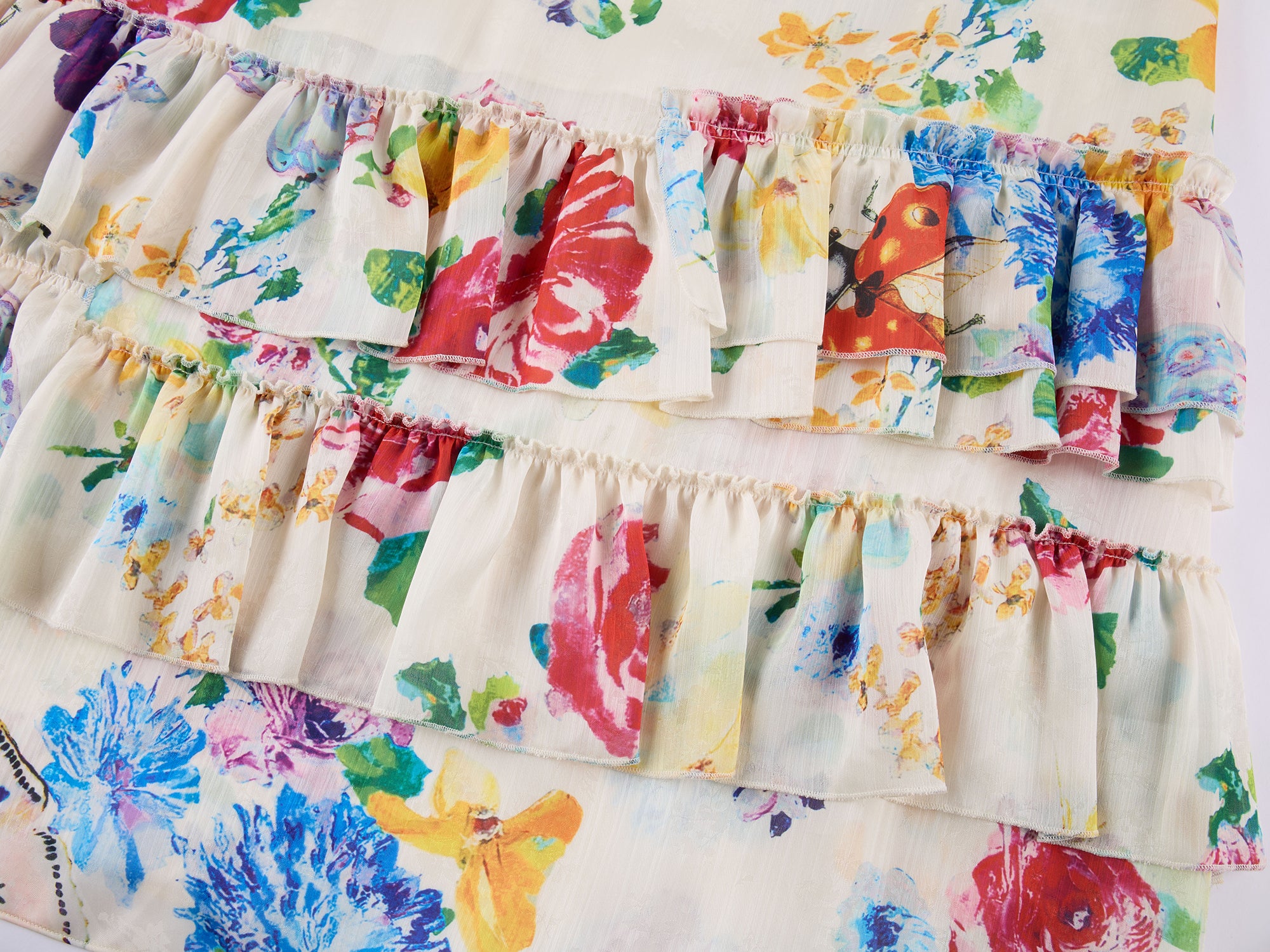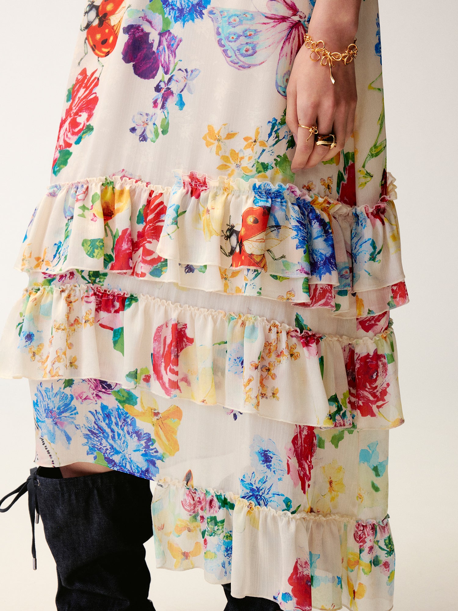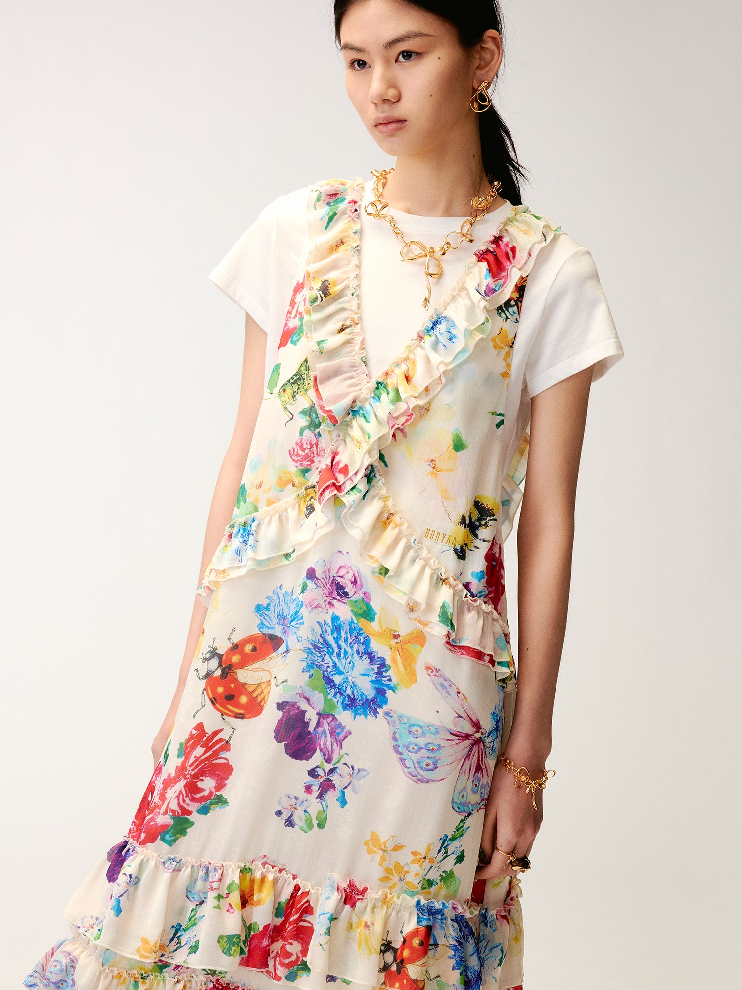 Floral and insect print suspender dress